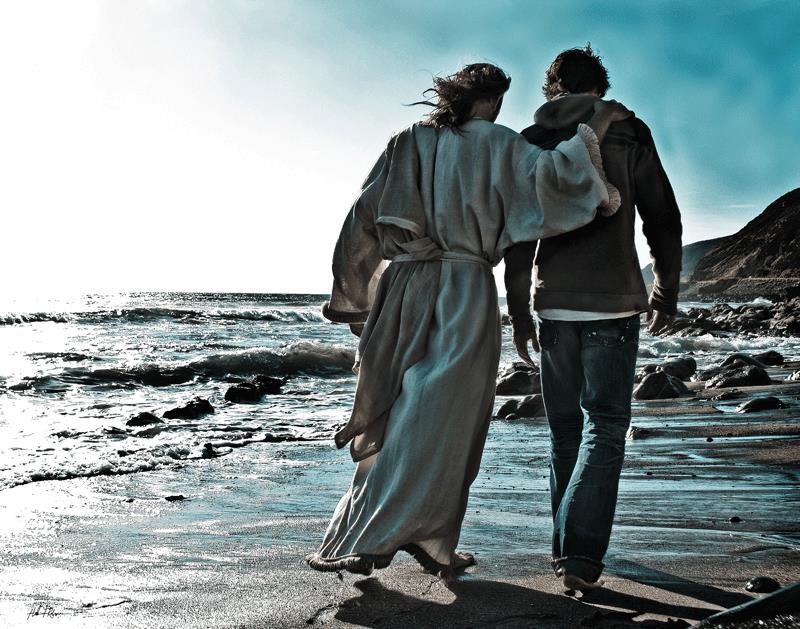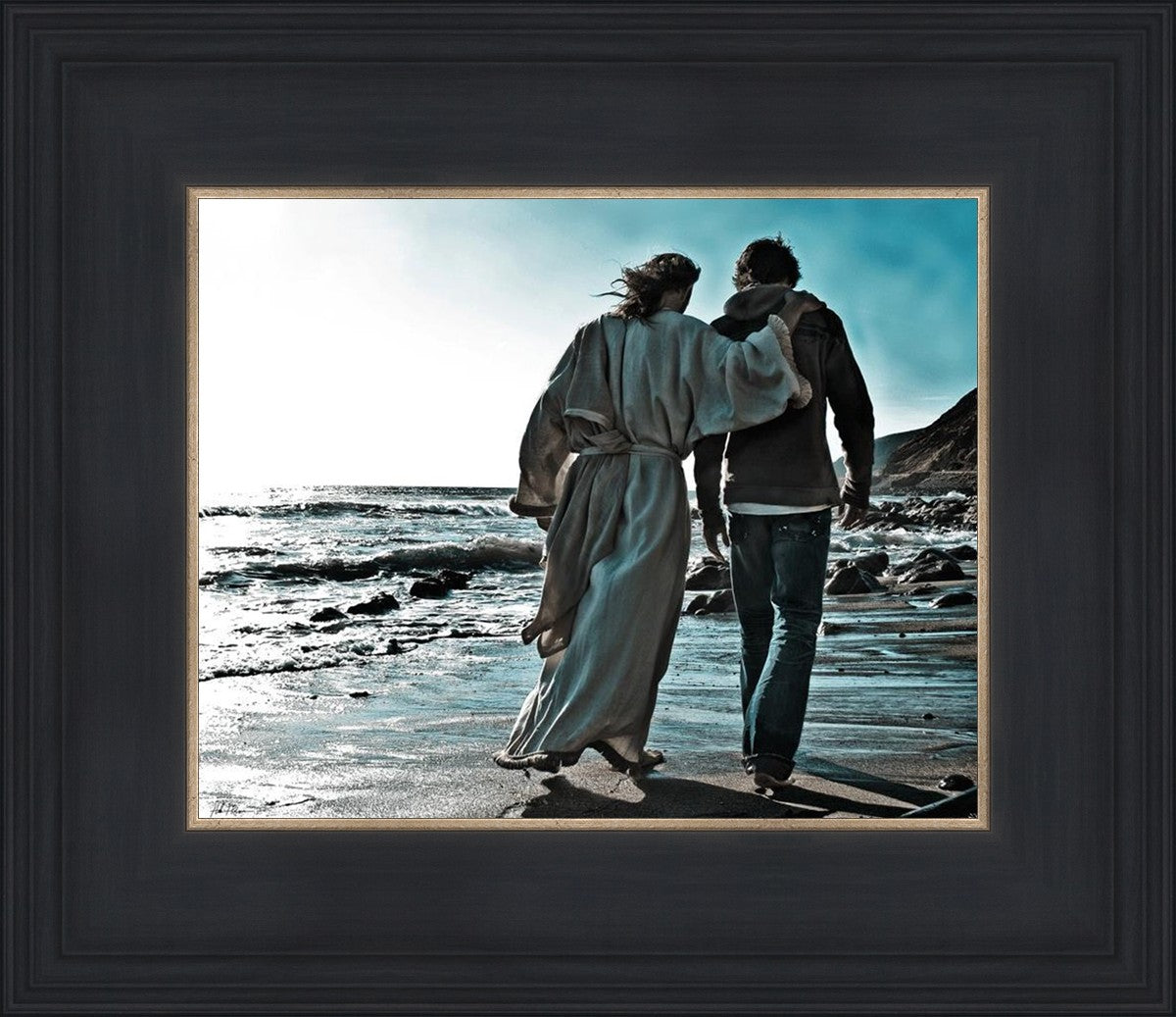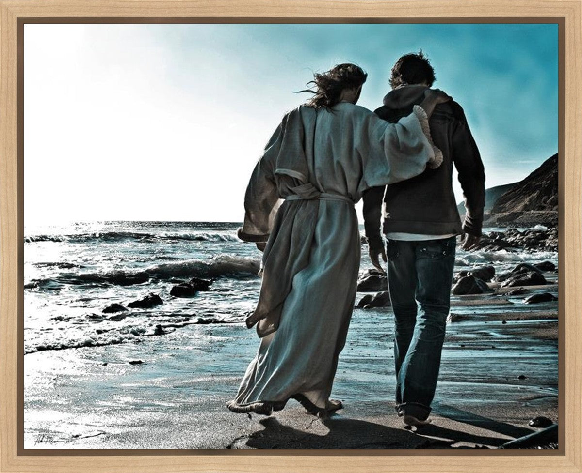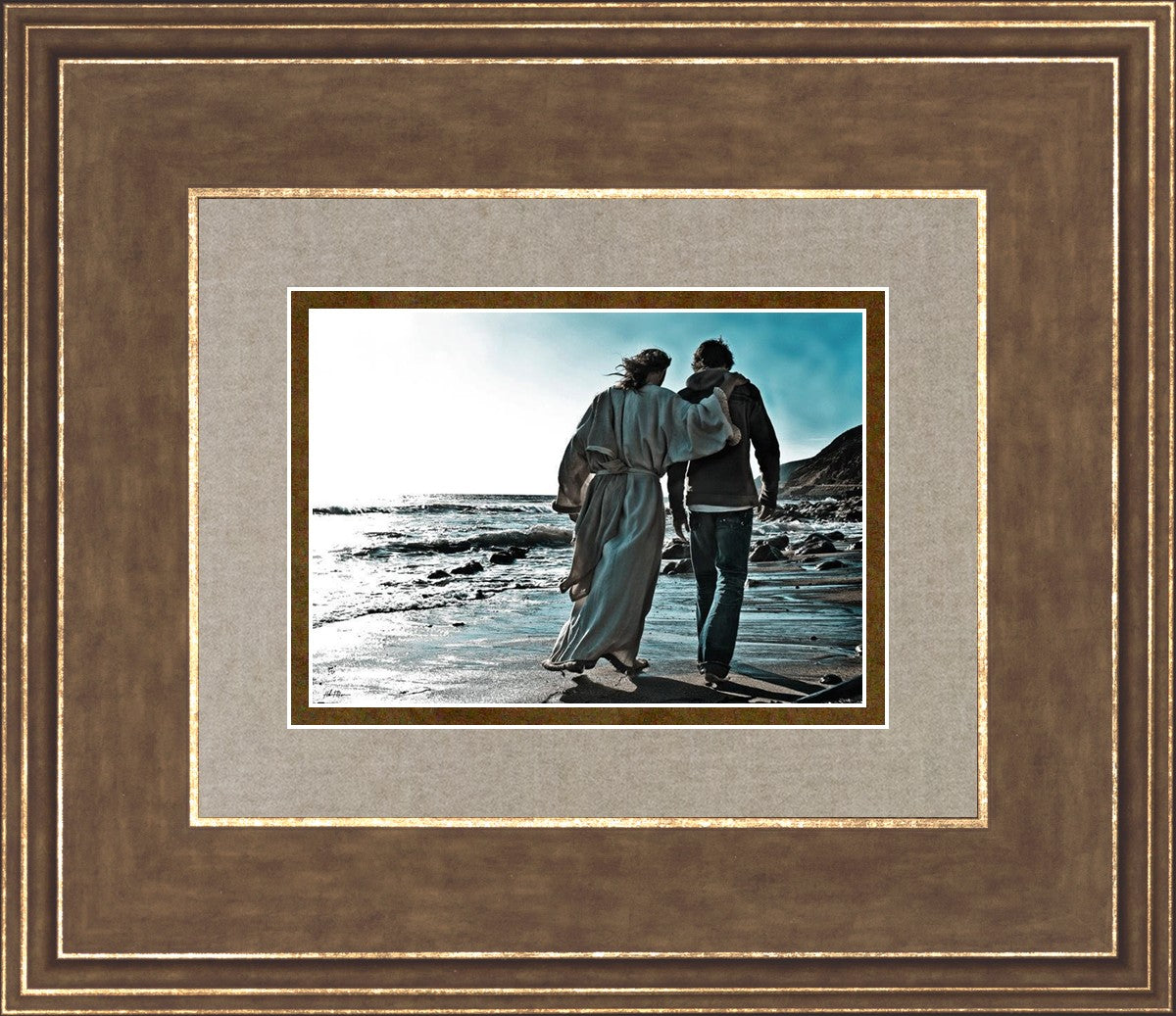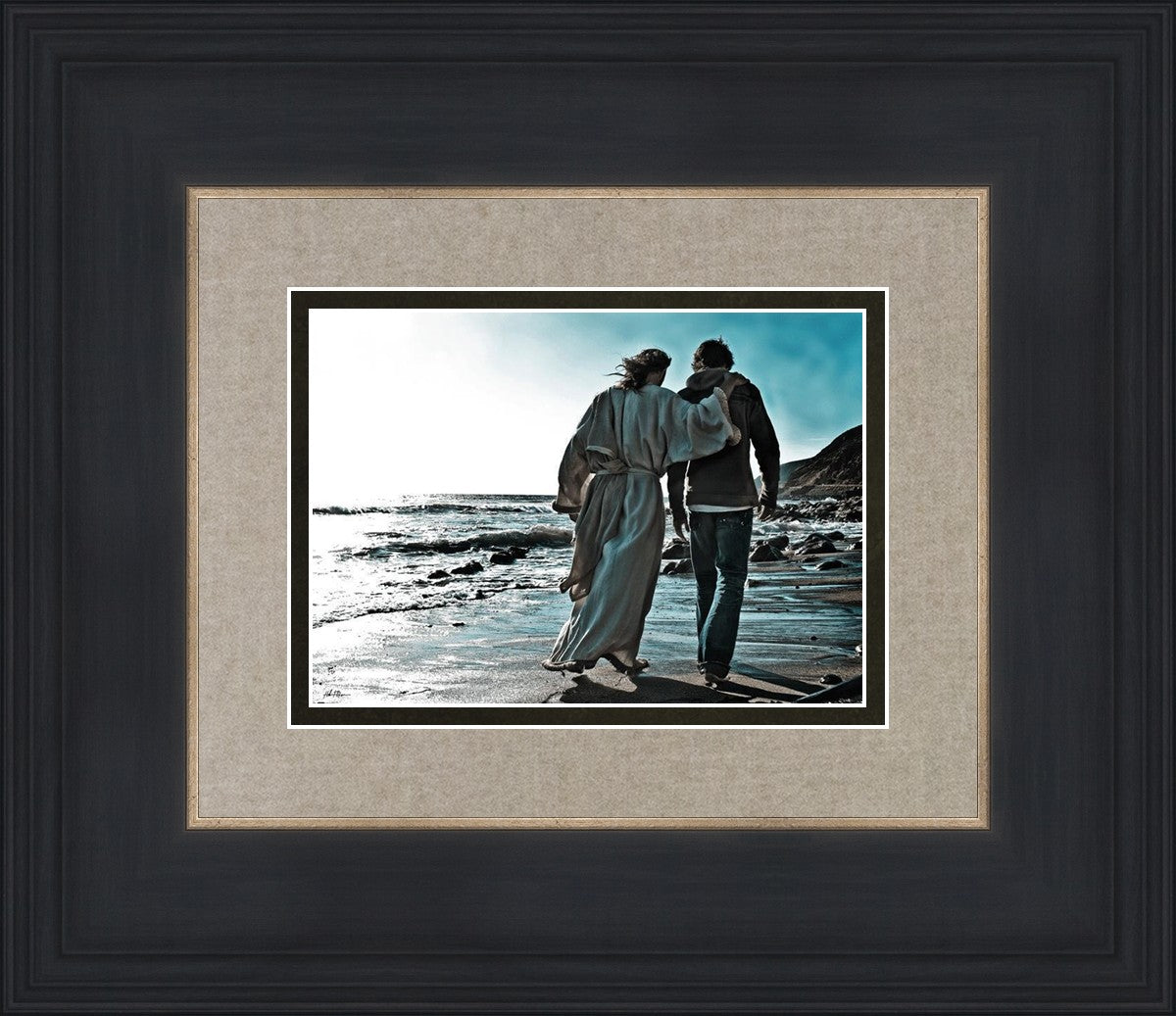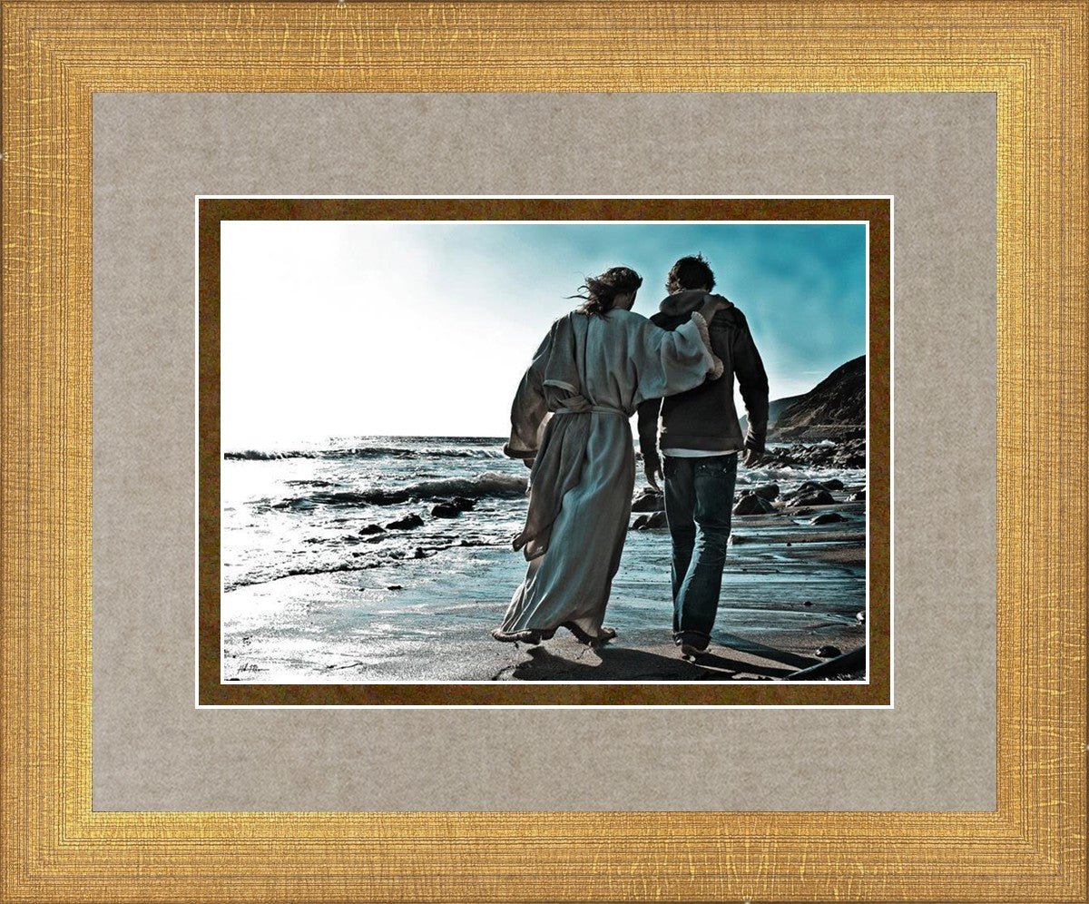 "My Friend" by Helen Thomas Robinson is a captivating photograph portraying Jesus Christ dressed in a robe, walking on the beach with his arm on the shoulder of a friend. This heartwarming image captures the essence of Jesus as our friend.