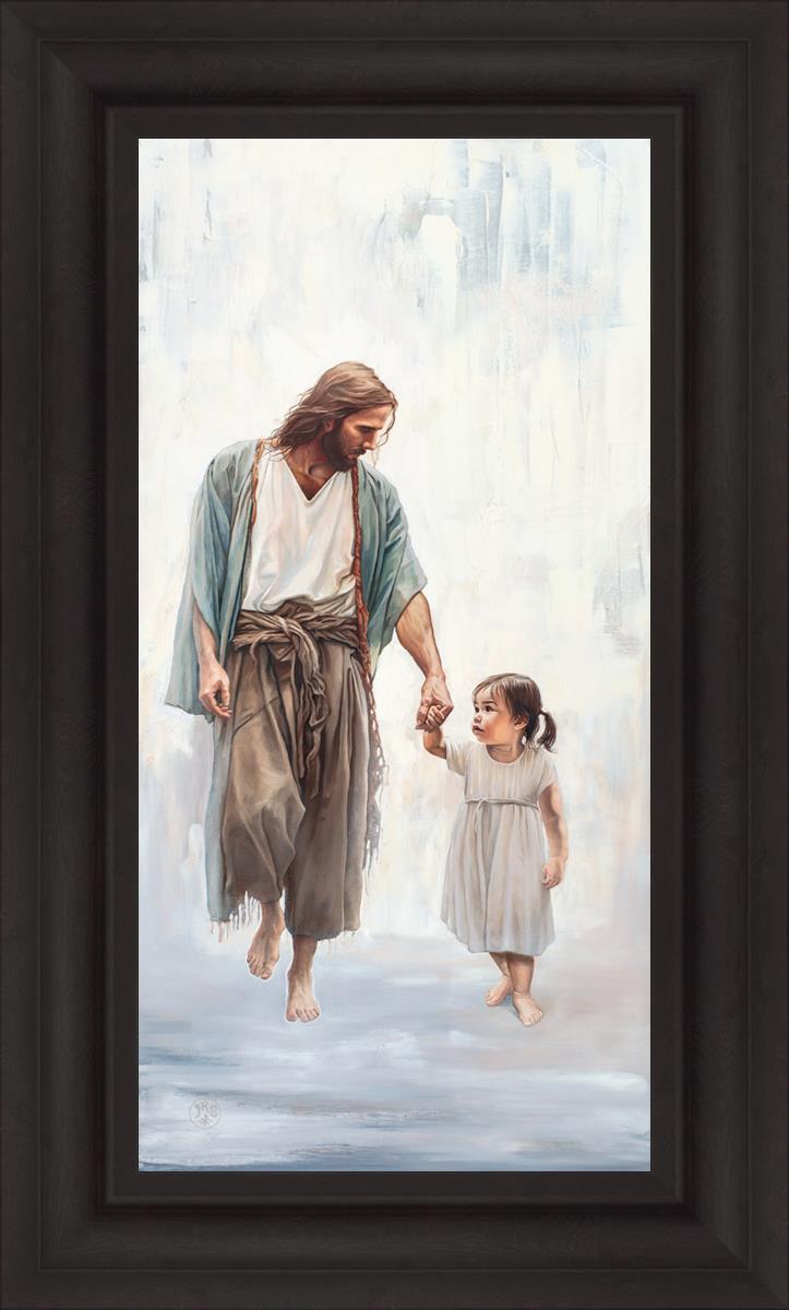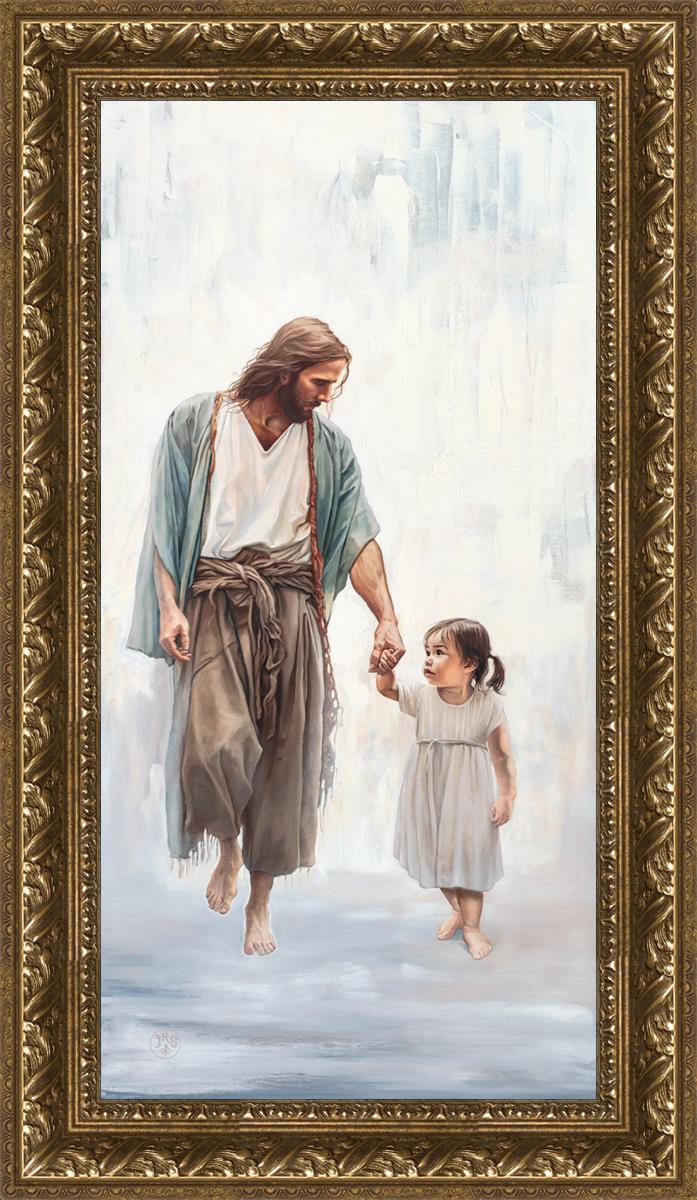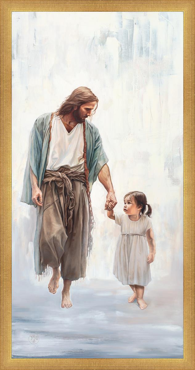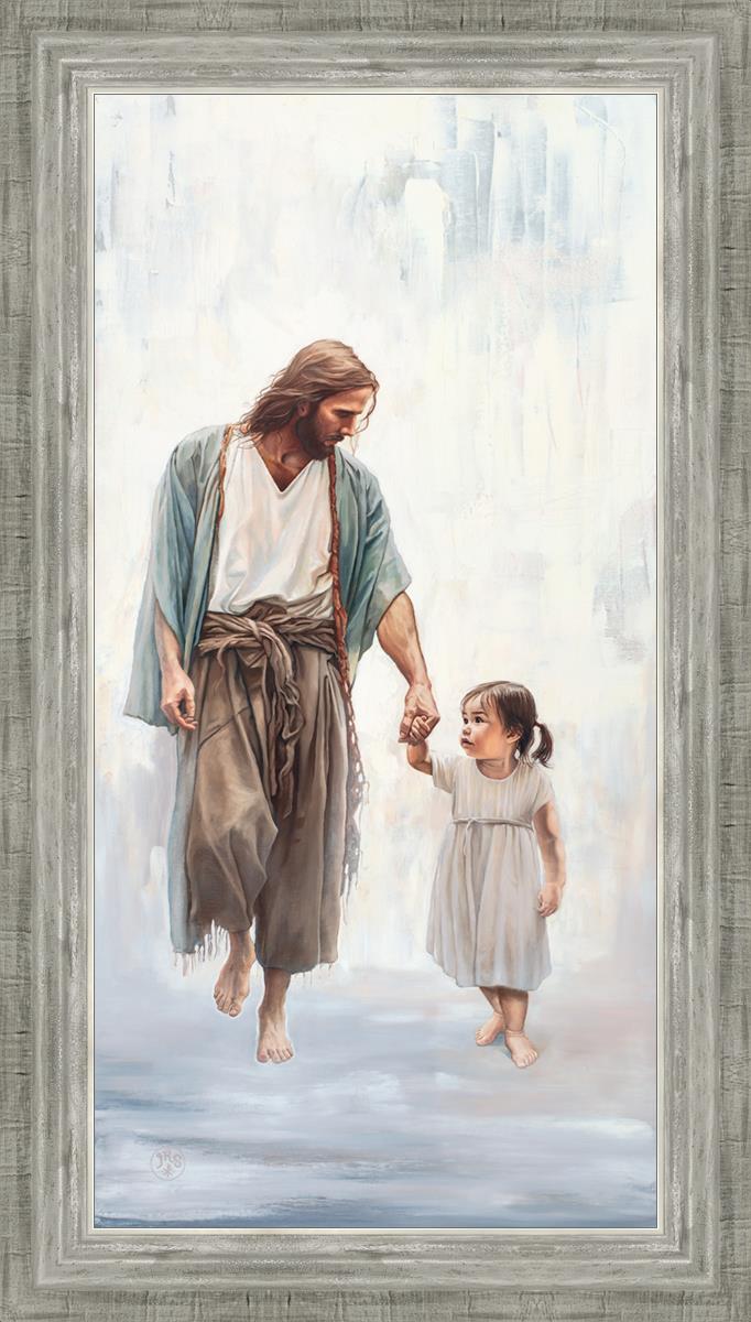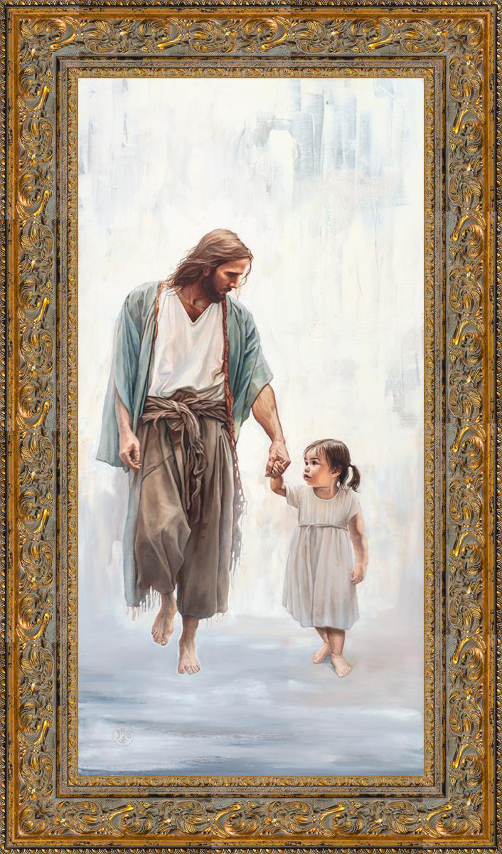 The canvas captures a poignant moment: Jesus, in His resurrected form, tenderly holding hands with the mortal girl. This scene symbolizes the bridge between the celestial and the terrestrial, reminding us that even amidst our earthly existence, Christ is always within reach.