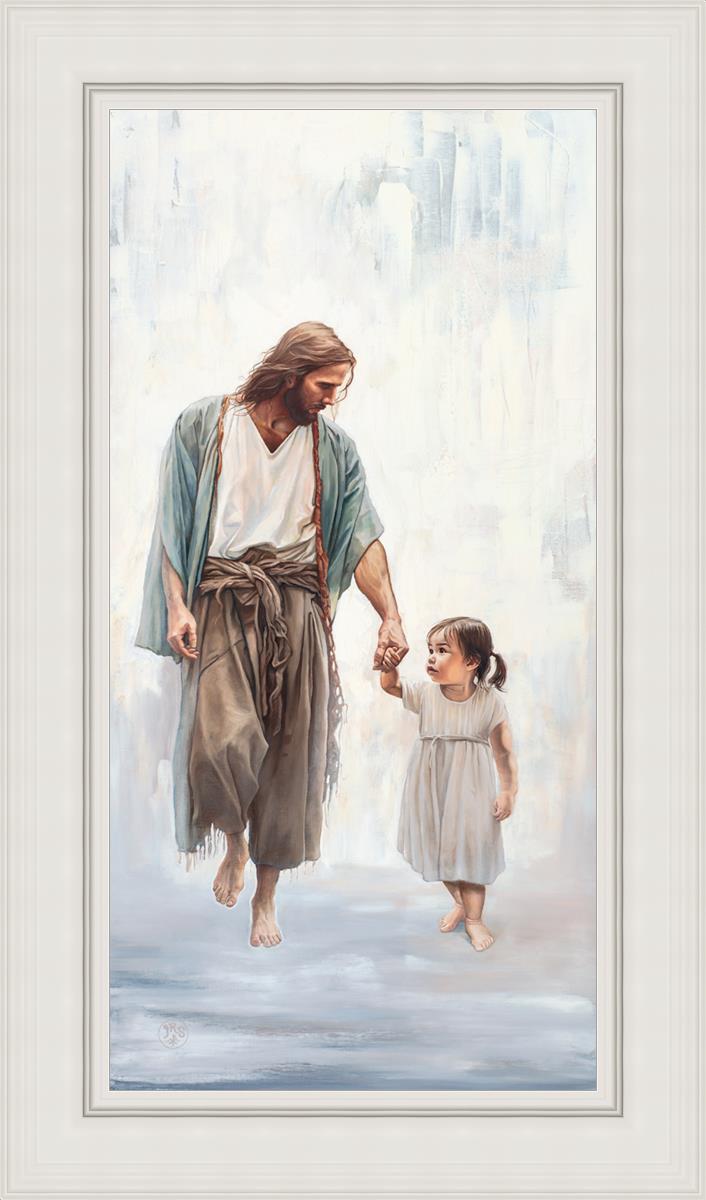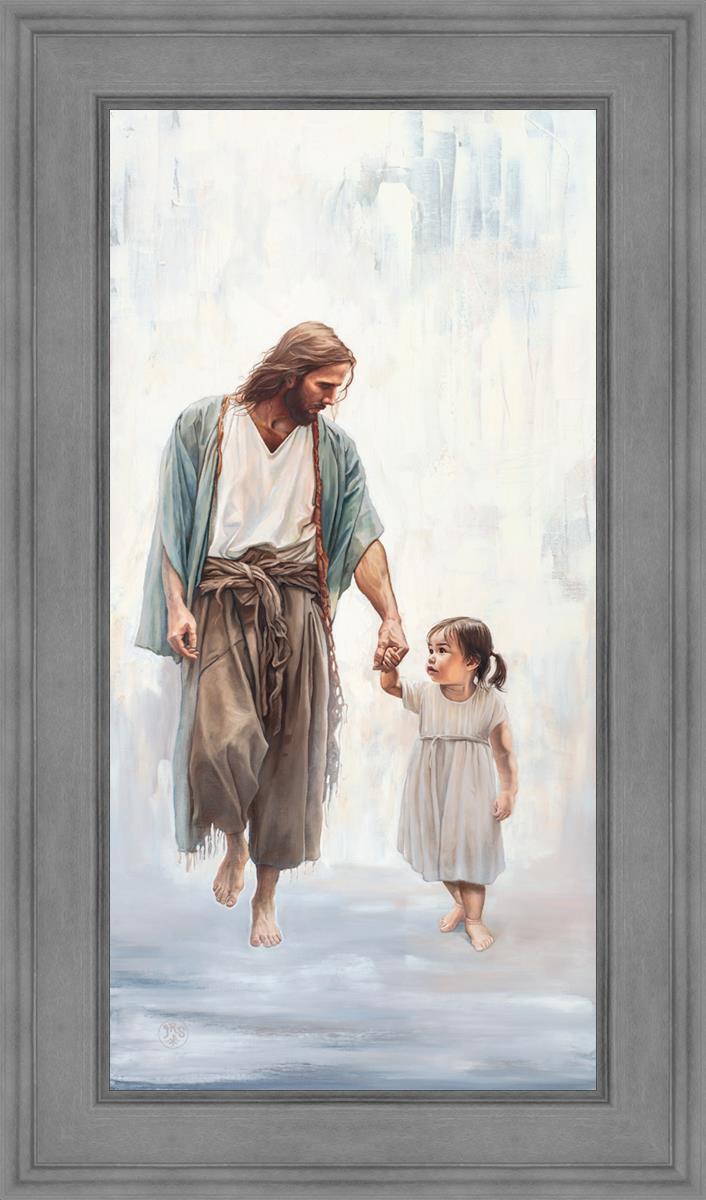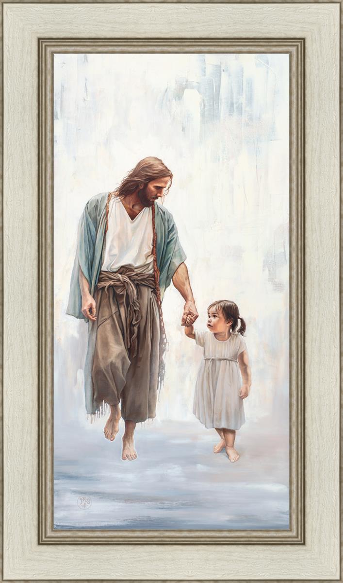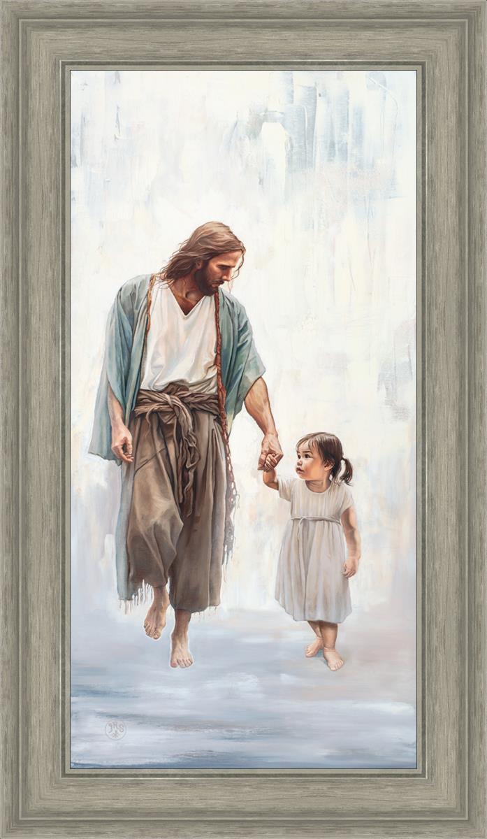 The canvas captures a poignant moment: Jesus, in His resurrected form, tenderly holding hands with the mortal girl. This scene symbolizes the bridge between the celestial and the terrestrial, reminding us that even amidst our earthly existence, Christ is always within reach.