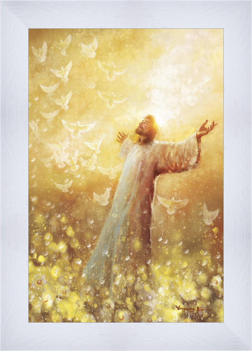 Oh Lord" by Yongsung Kim is a captivating painting portraying Christ standing in a field of flowers, with doves flying overhead, symbolizing peace and divine presence.