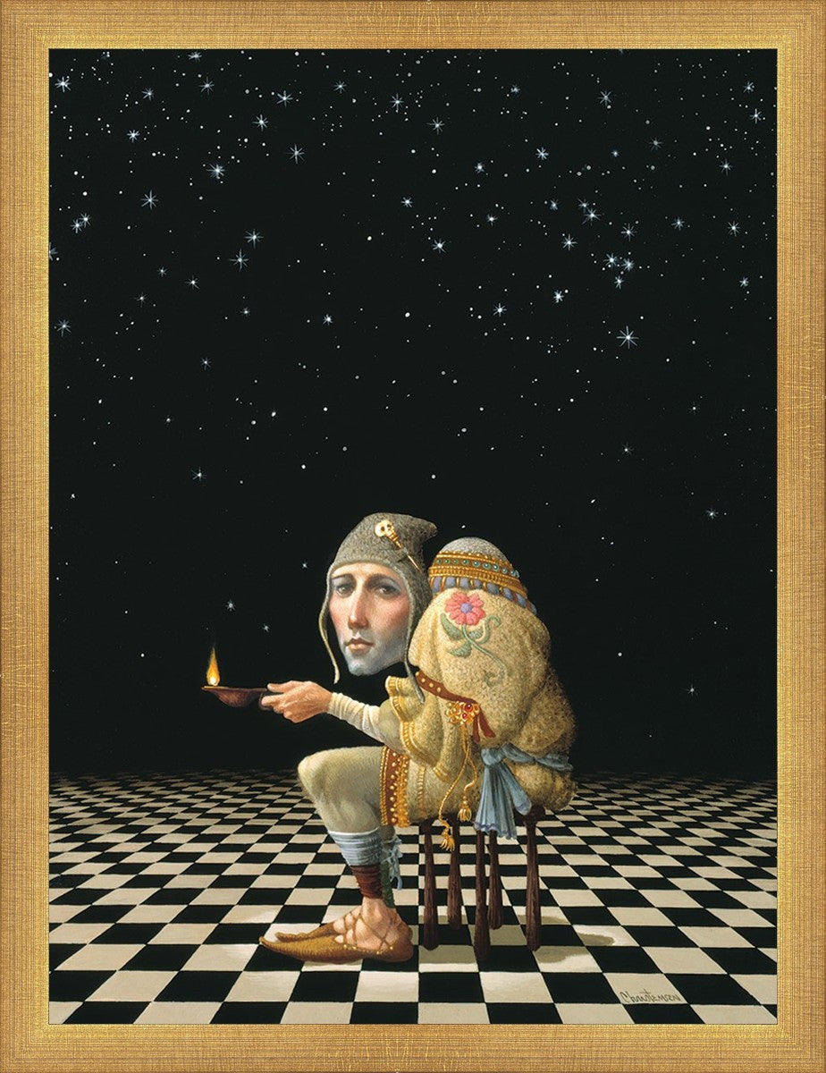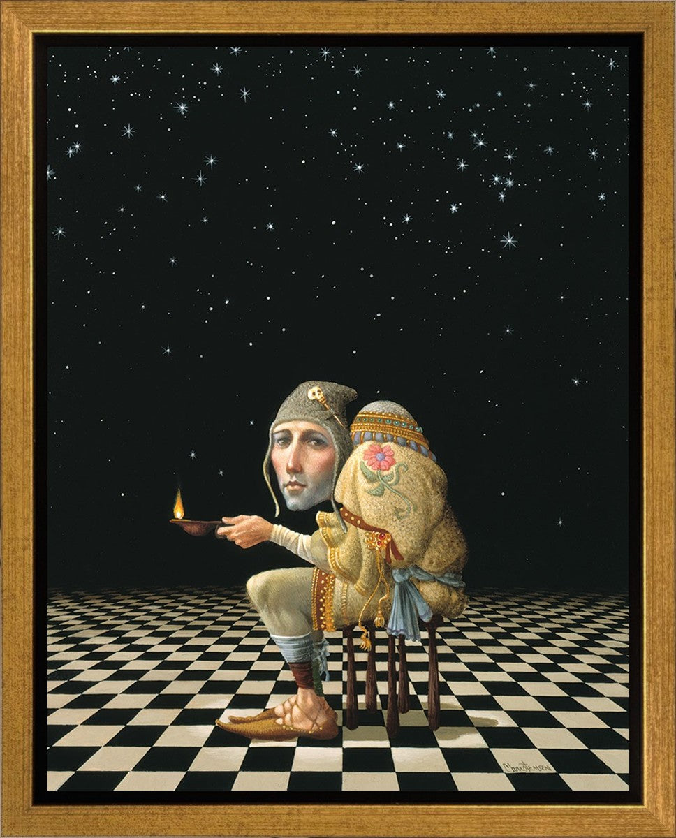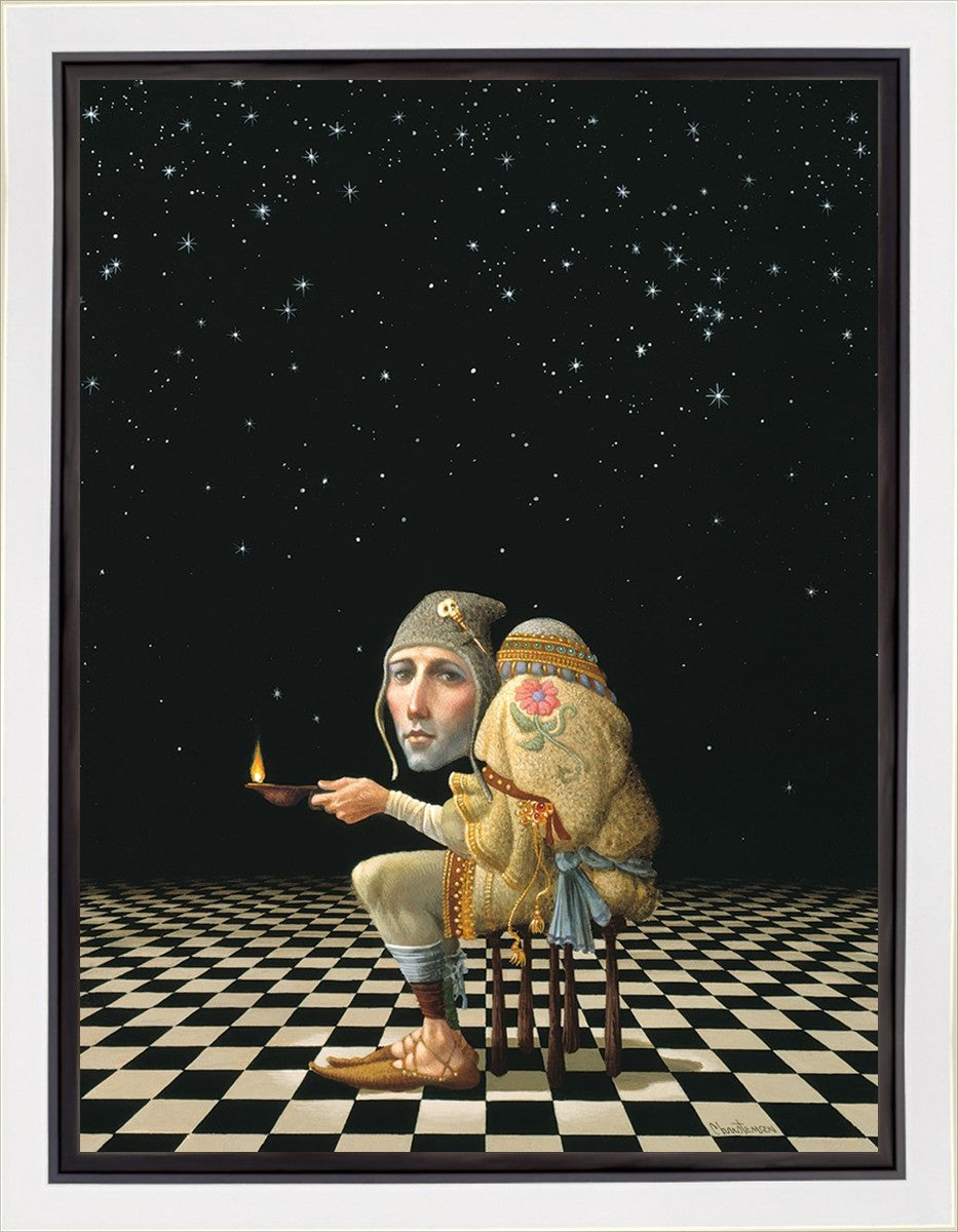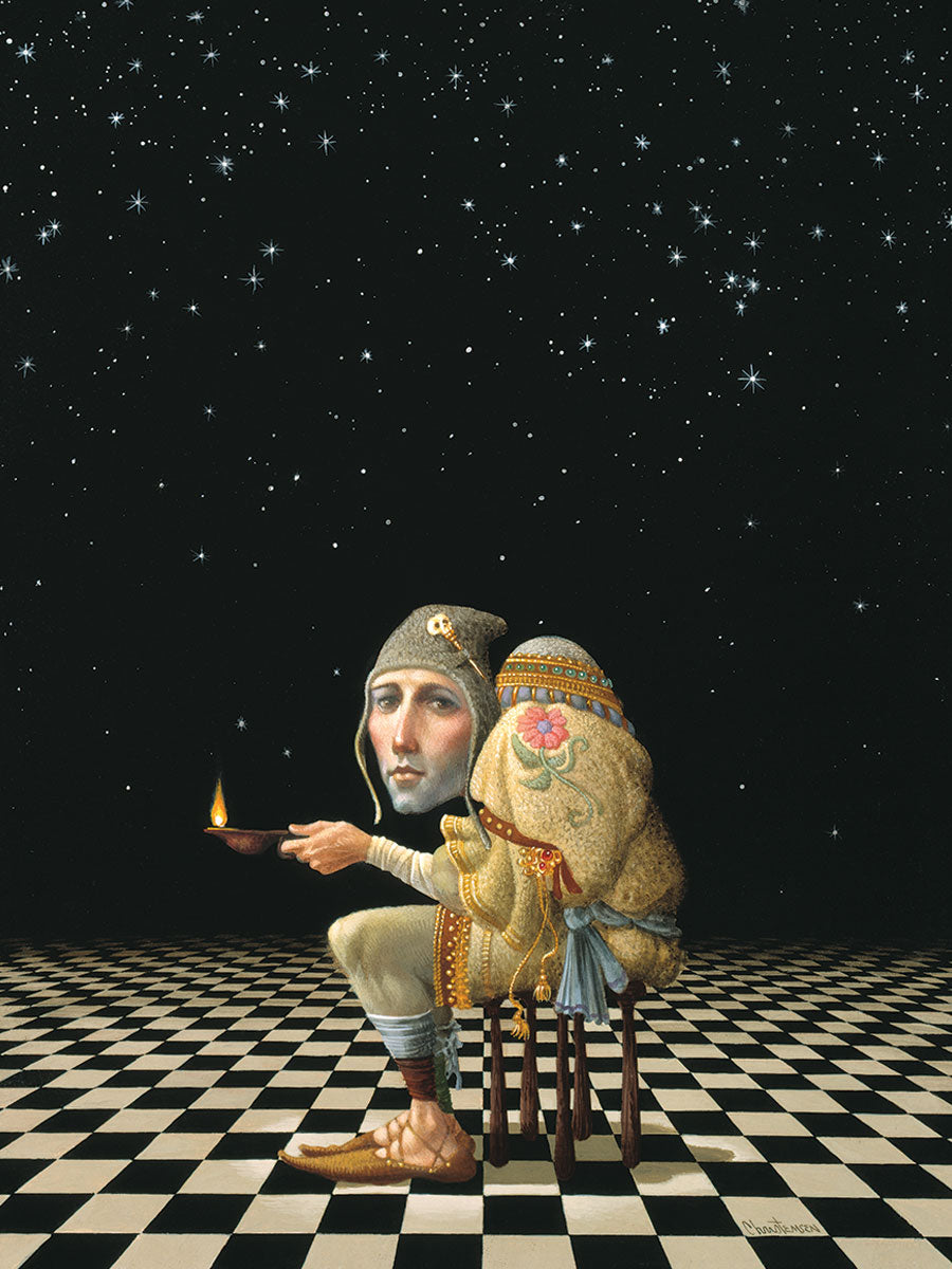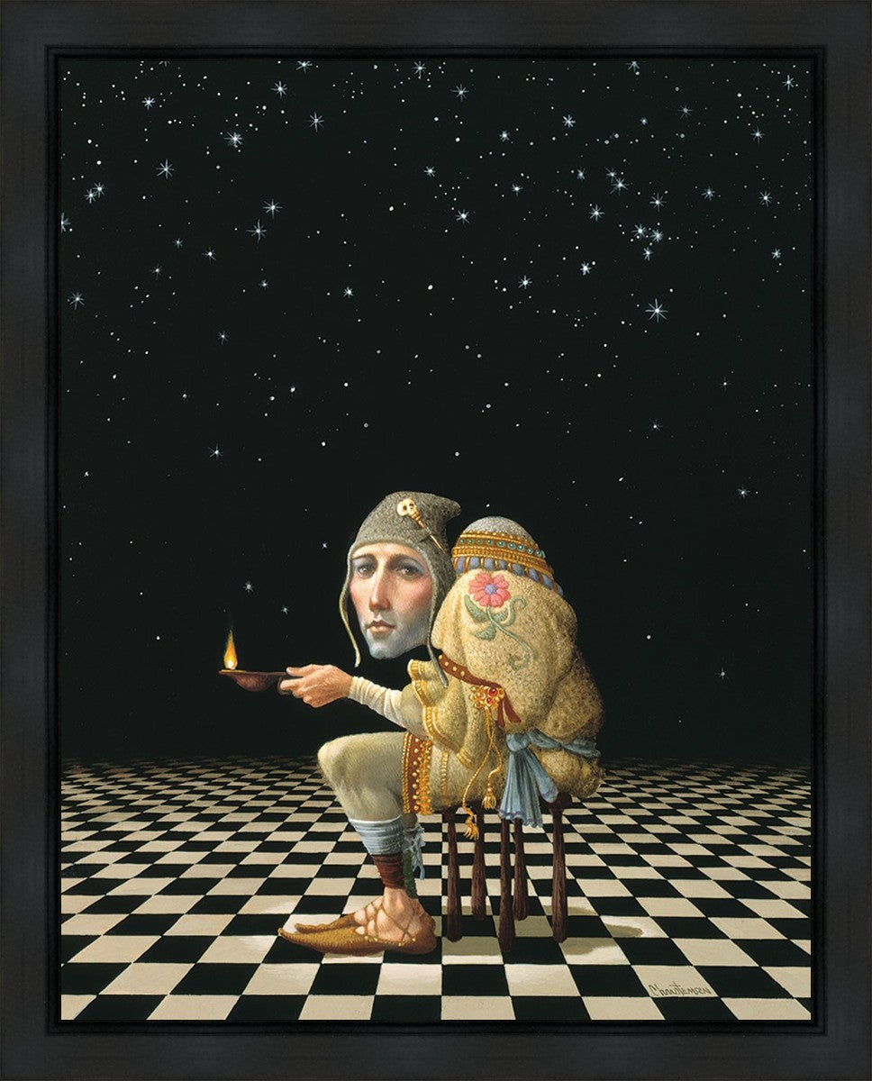 James’ Hunchback Everyman sits on a checkerboard that extends infinitely into the universe. The hunch is not a physical deformity, it is a symbol of the burdens we carry. The checkerboard is the playing field of life, night and day, good and bad, light and dark.This symbolism extends to the flower embroidered on his shoulder - Life, and The Skull pin on his hat - Death.