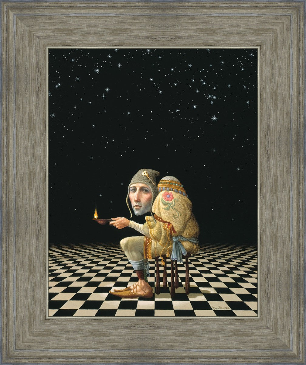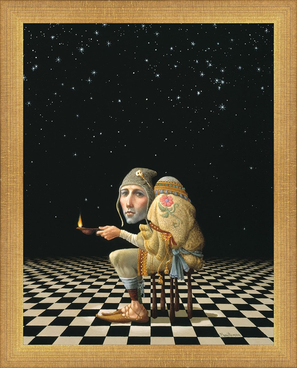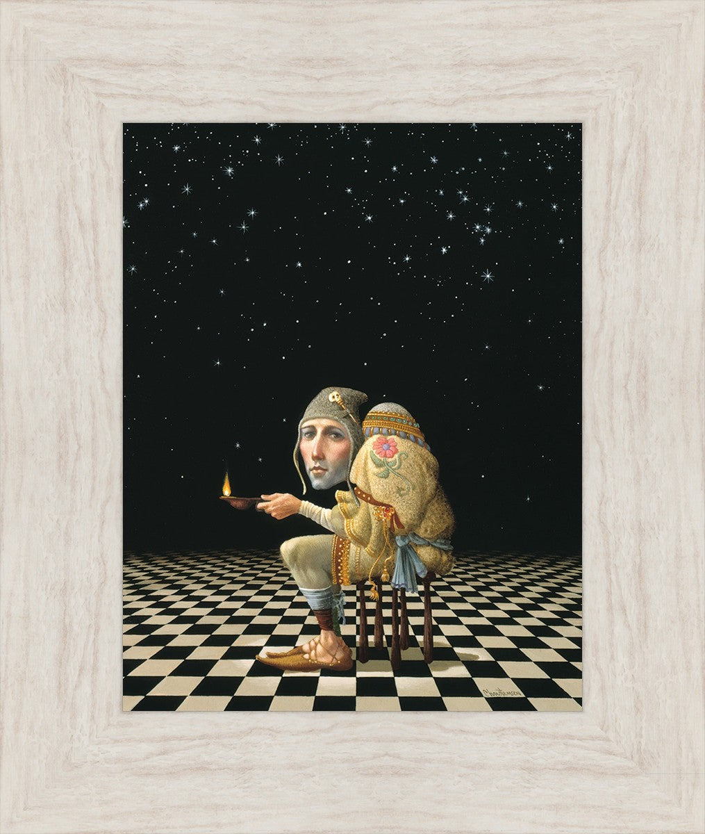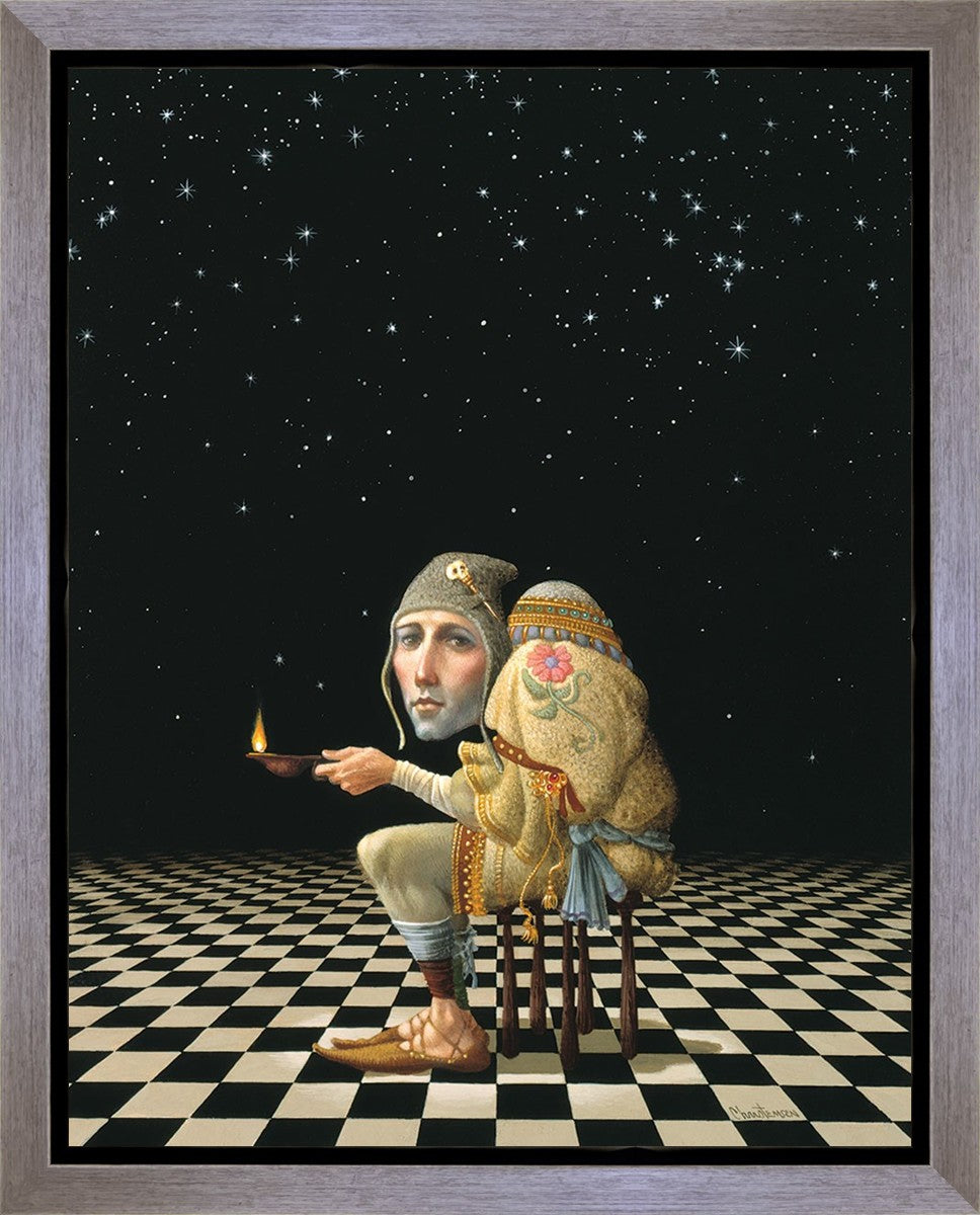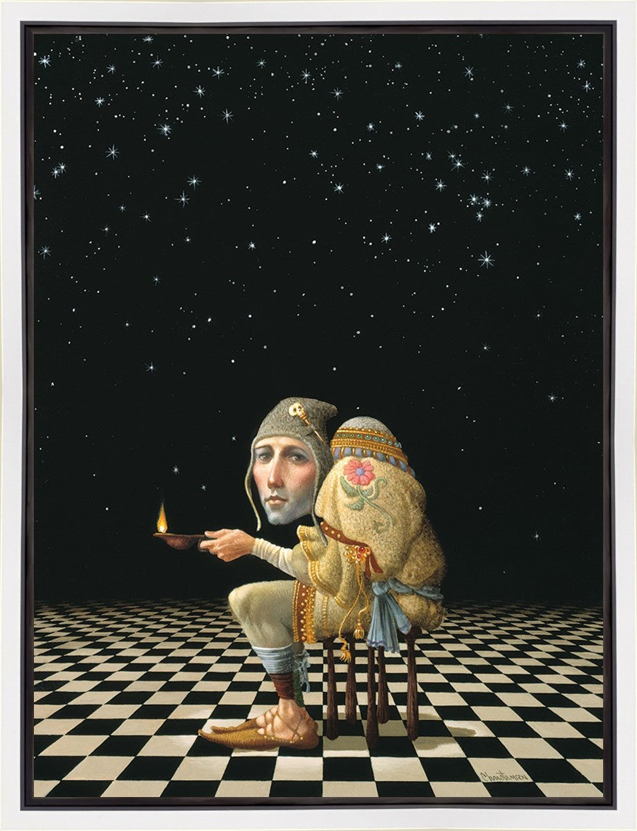 James’ Hunchback Everyman sits on a checkerboard that extends infinitely into the universe. The hunch is not a physical deformity, it is a symbol of the burdens we carry. The checkerboard is the playing field of life, night and day, good and bad, light and dark.This symbolism extends to the flower embroidered on his shoulder - Life, and The Skull pin on his hat - Death.