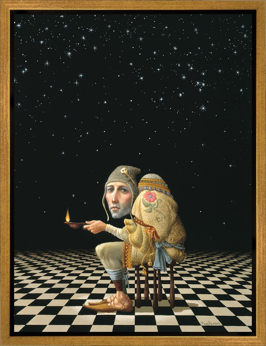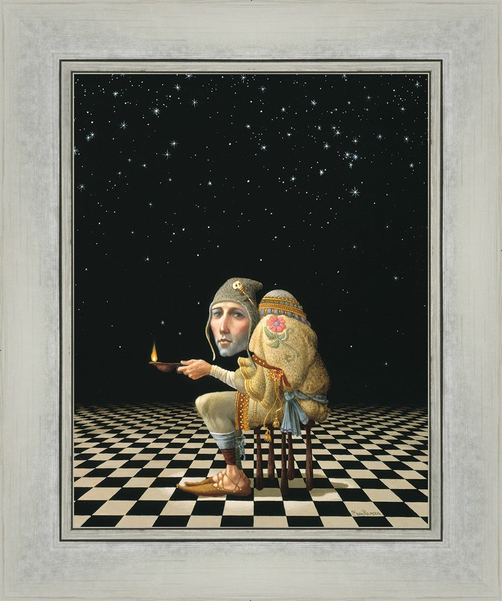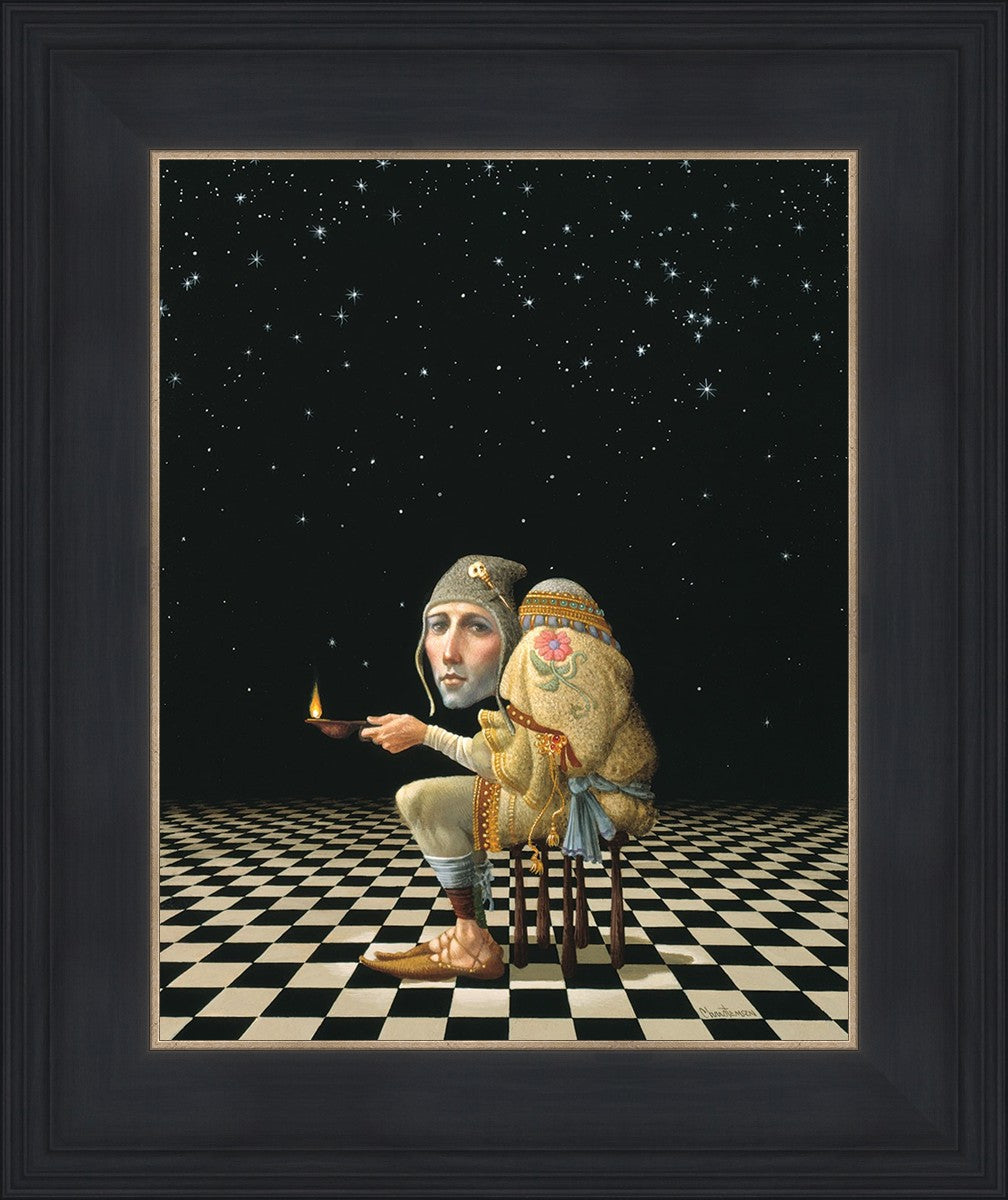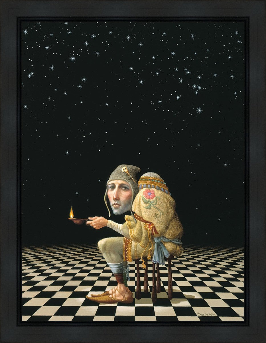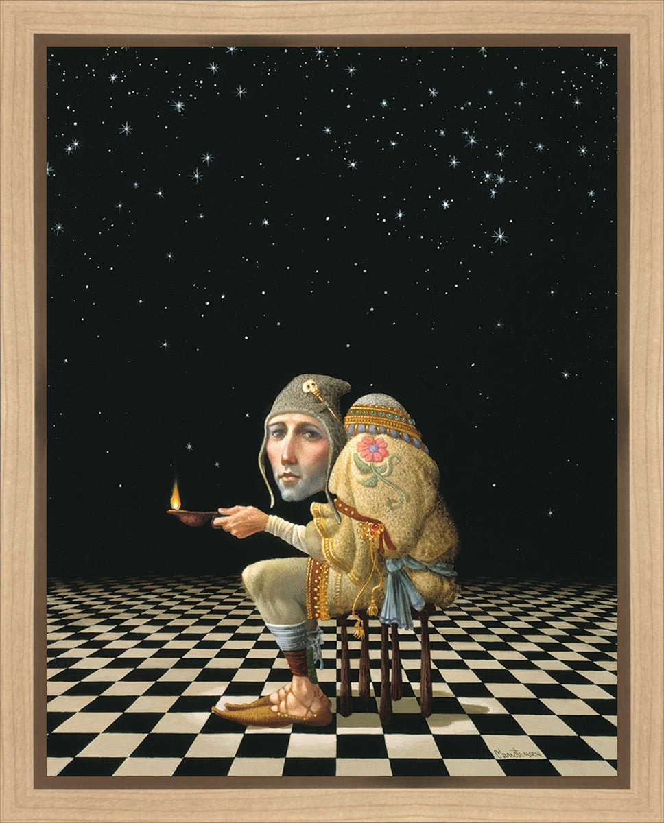 James’ Hunchback Everyman sits on a checkerboard that extends infinitely into the universe. The hunch is not a physical deformity, it is a symbol of the burdens we carry. The checkerboard is the playing field of life, night and day, good and bad, light and dark.This symbolism extends to the flower embroidered on his shoulder - Life, and The Skull pin on his hat - Death.
