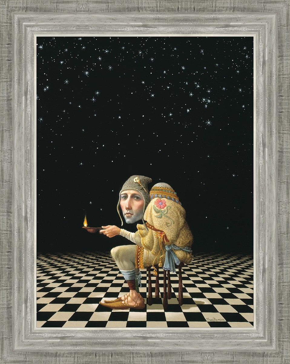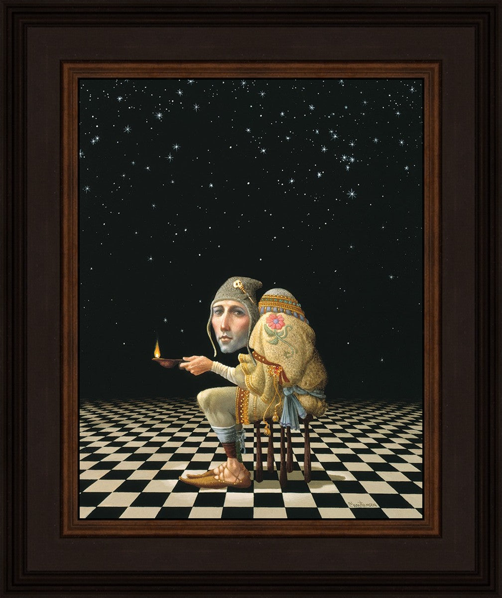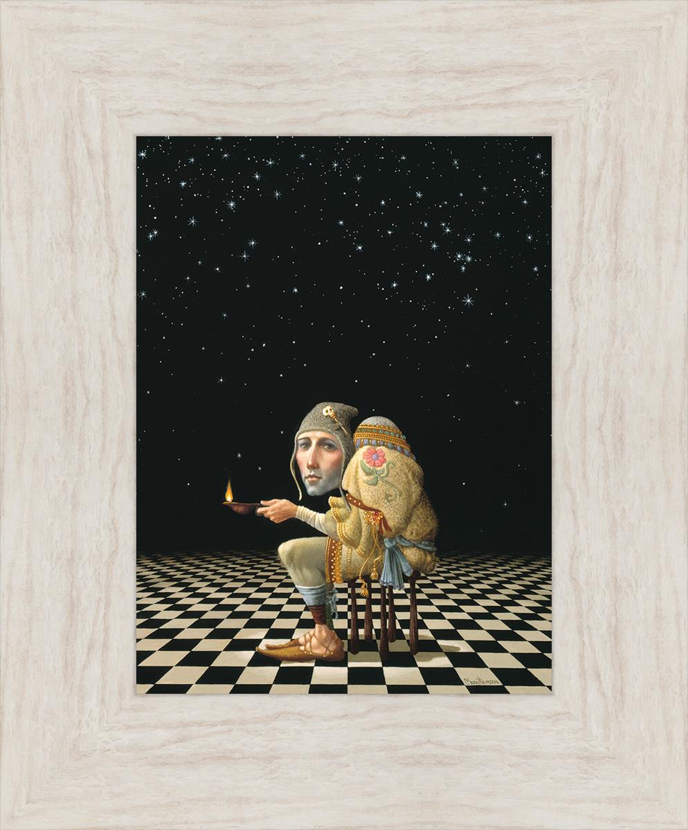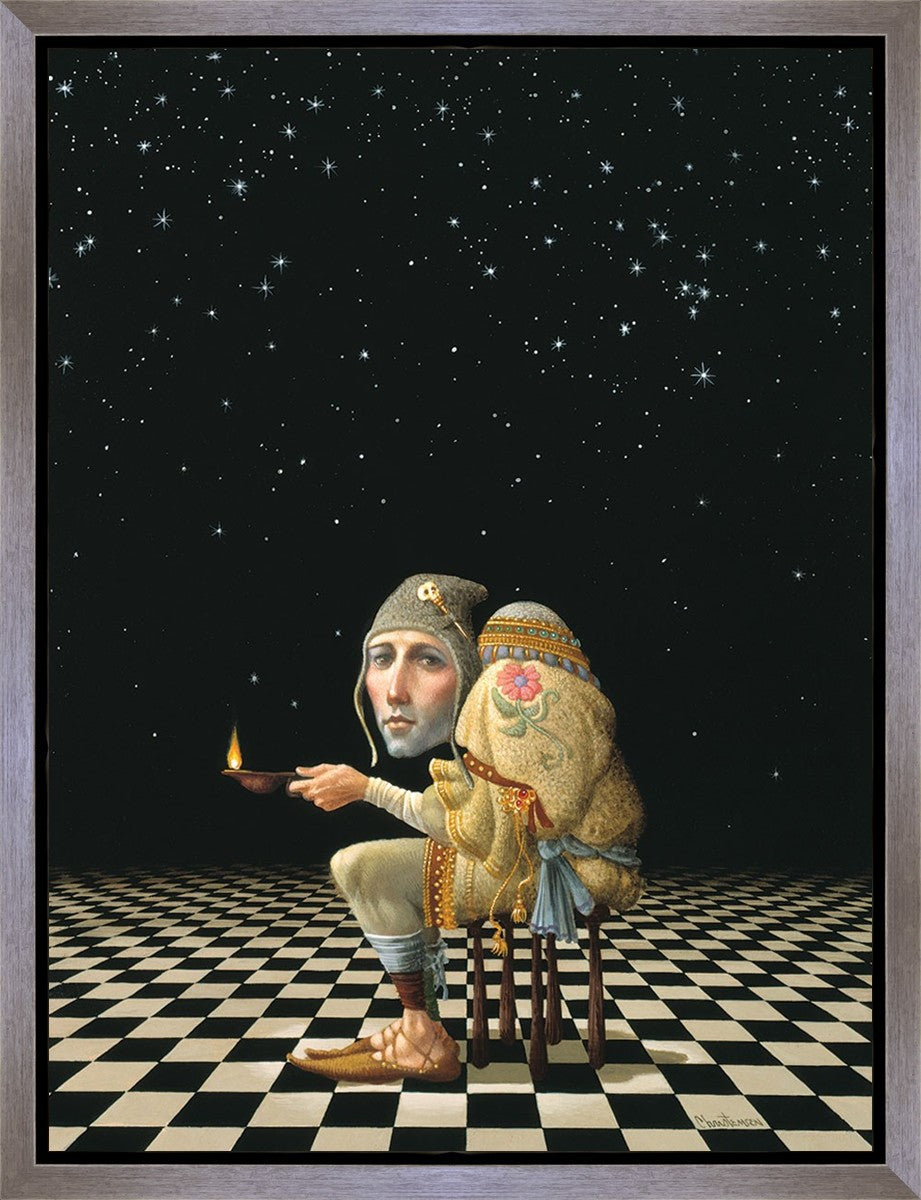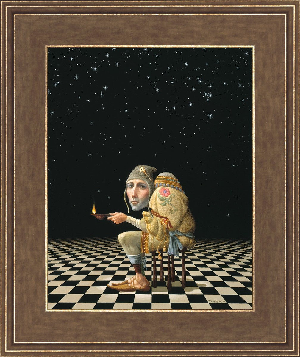 James’ Hunchback Everyman sits on a checkerboard that extends infinitely into the universe. The hunch is not a physical deformity, it is a symbol of the burdens we carry. The checkerboard is the playing field of life, night and day, good and bad, light and dark.This symbolism extends to the flower embroidered on his shoulder - Life, and The Skull pin on his hat - Death.