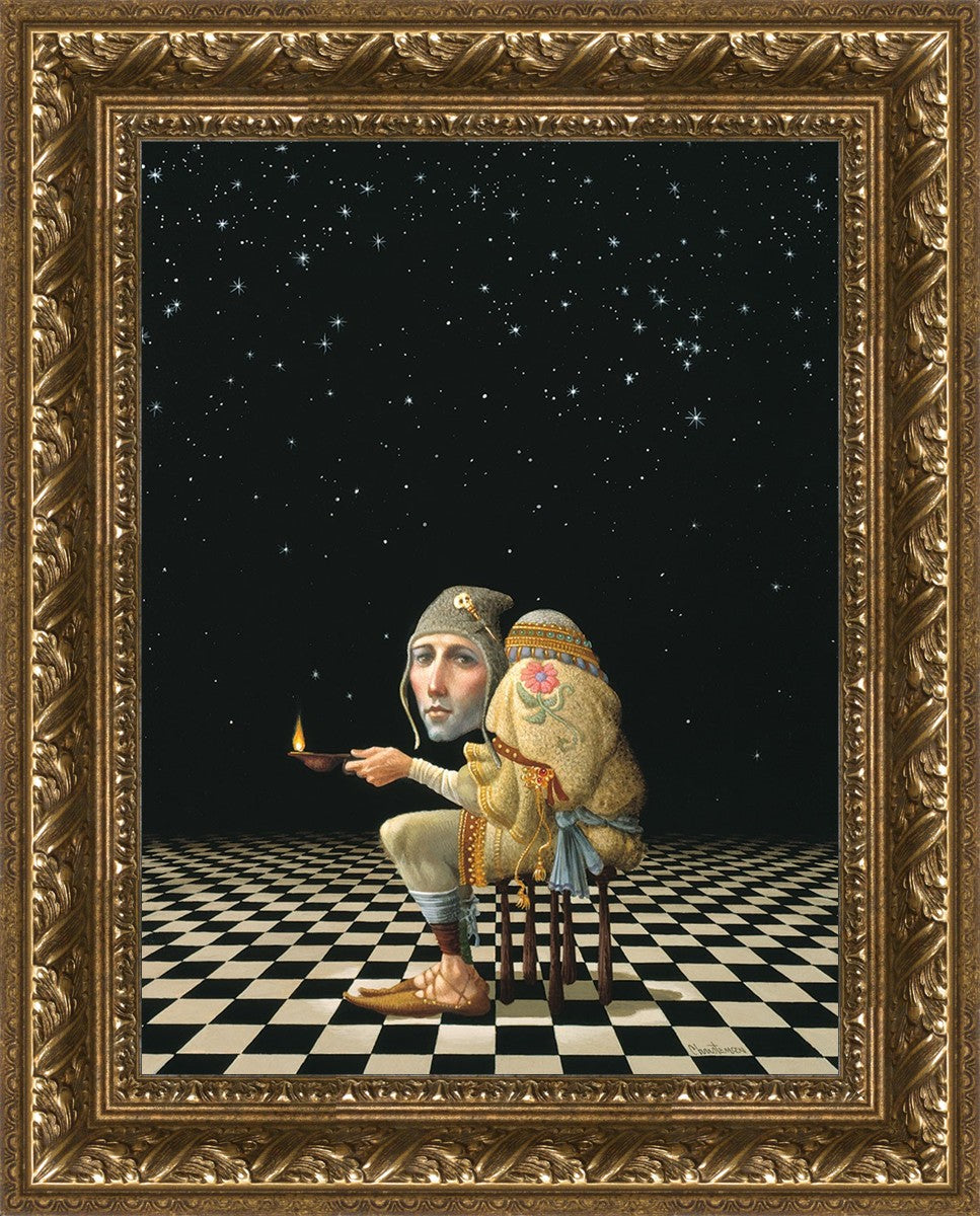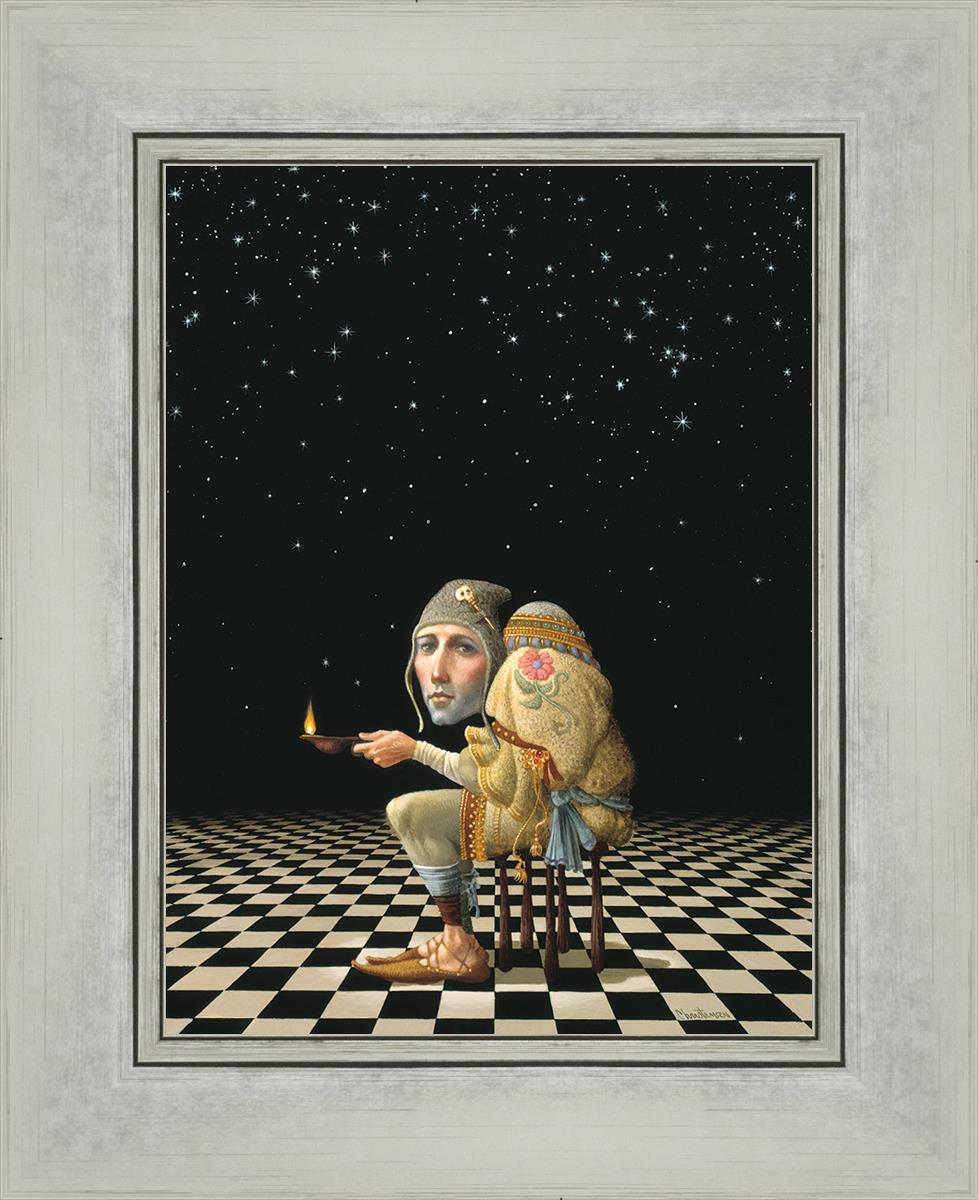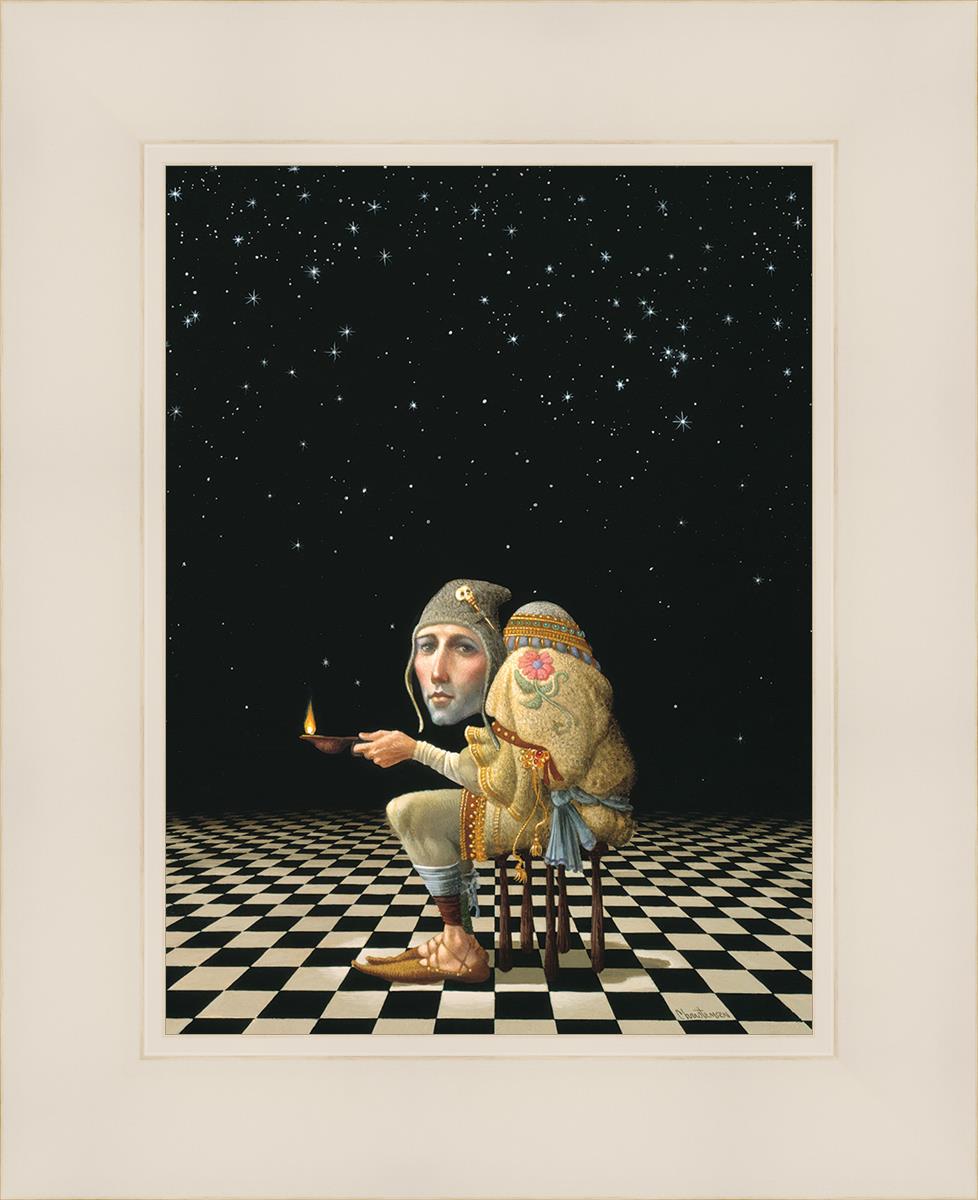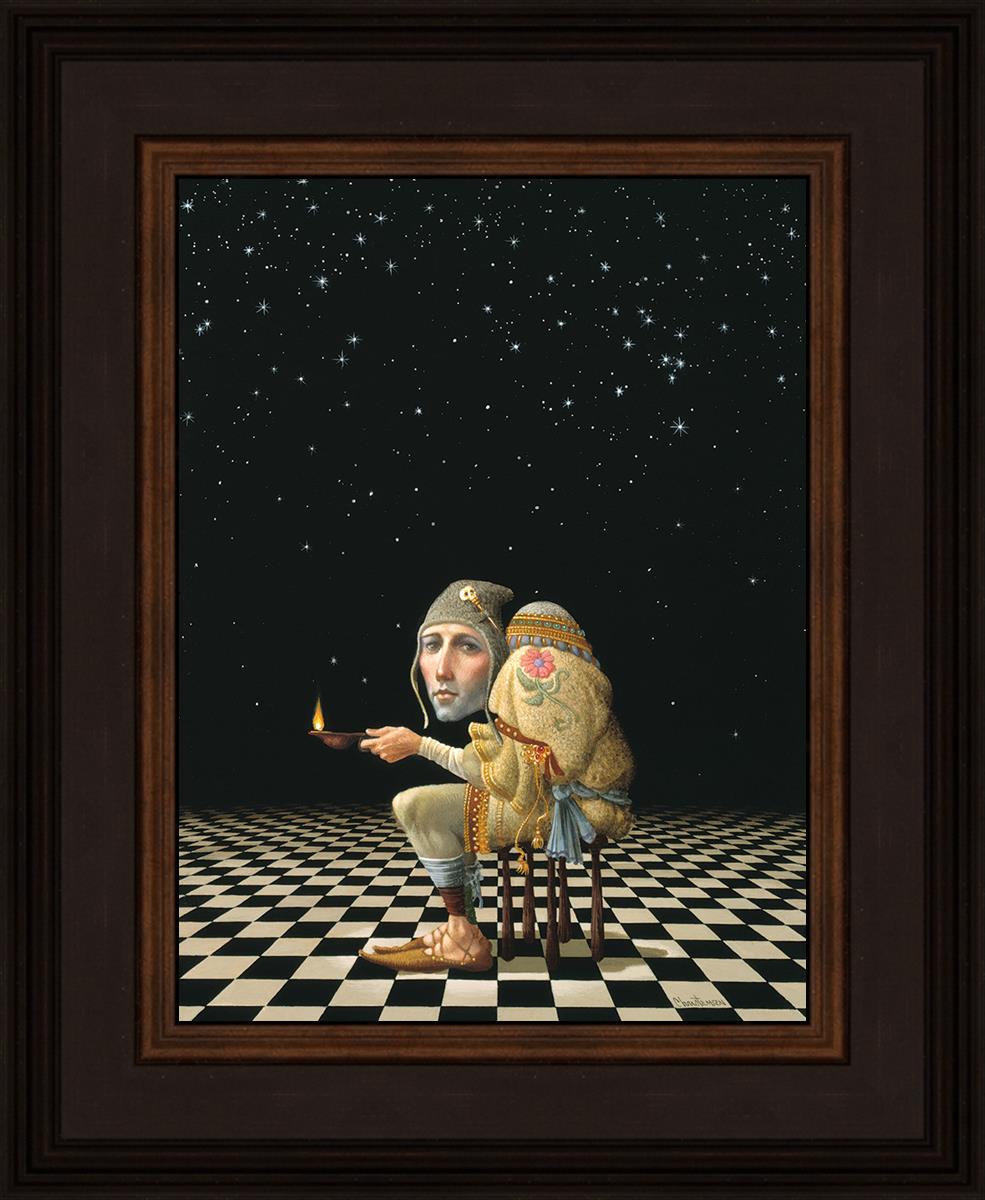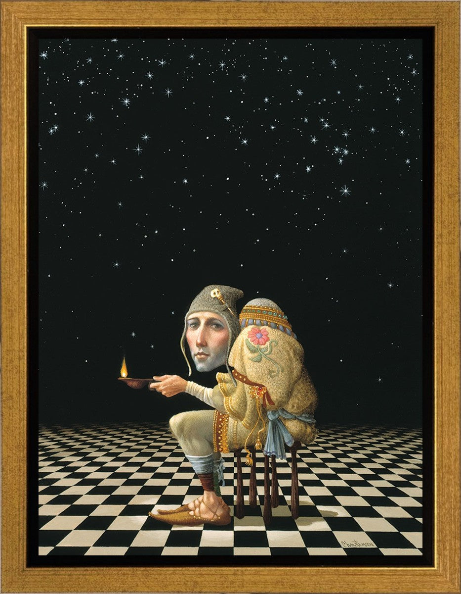 James’ Hunchback Everyman sits on a checkerboard that extends infinitely into the universe. The hunch is not a physical deformity, it is a symbol of the burdens we carry. The checkerboard is the playing field of life, night and day, good and bad, light and dark.This symbolism extends to the flower embroidered on his shoulder - Life, and The Skull pin on his hat - Death.