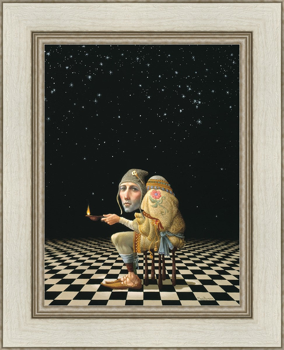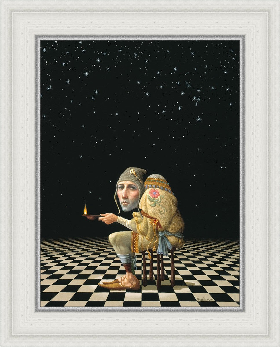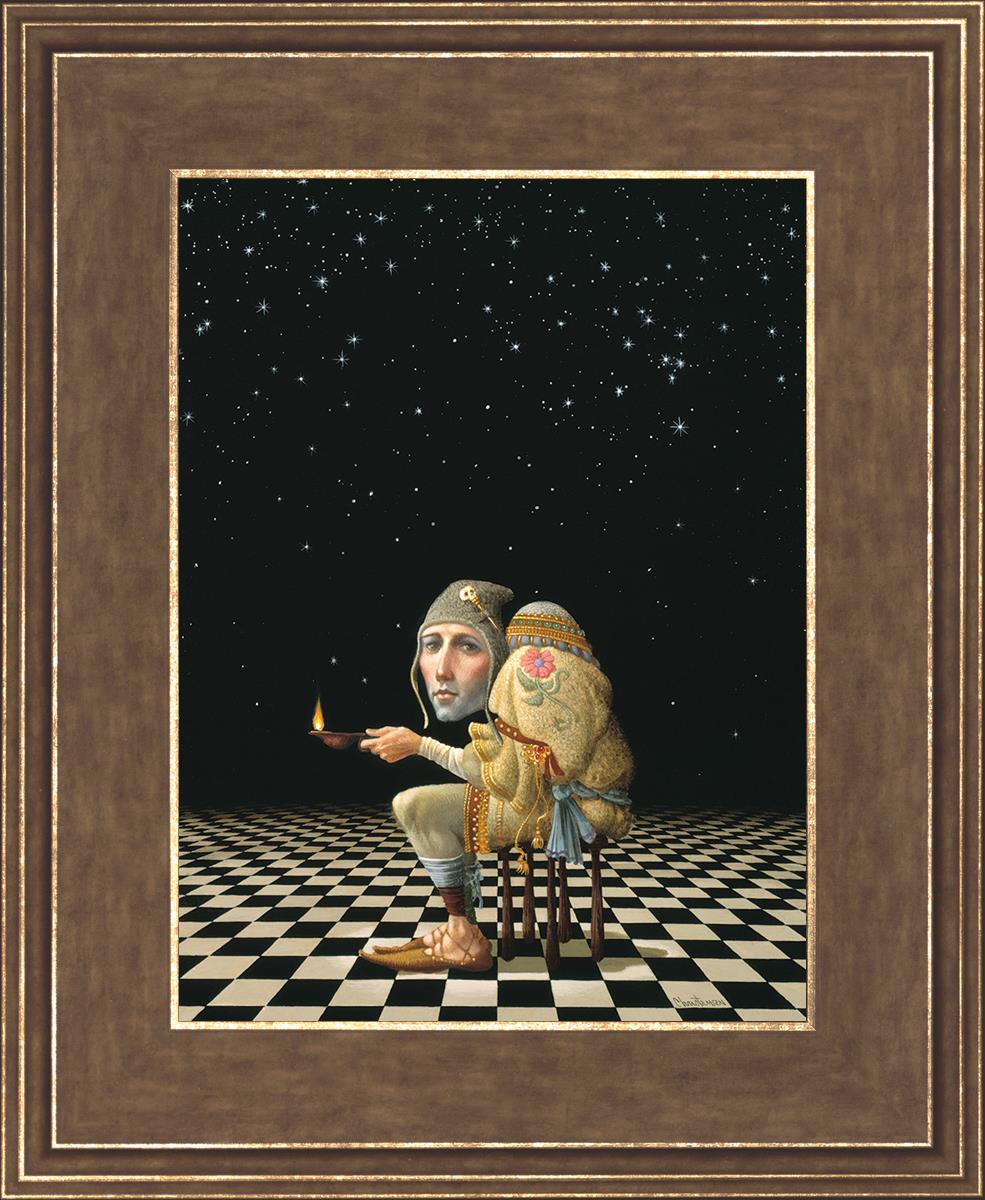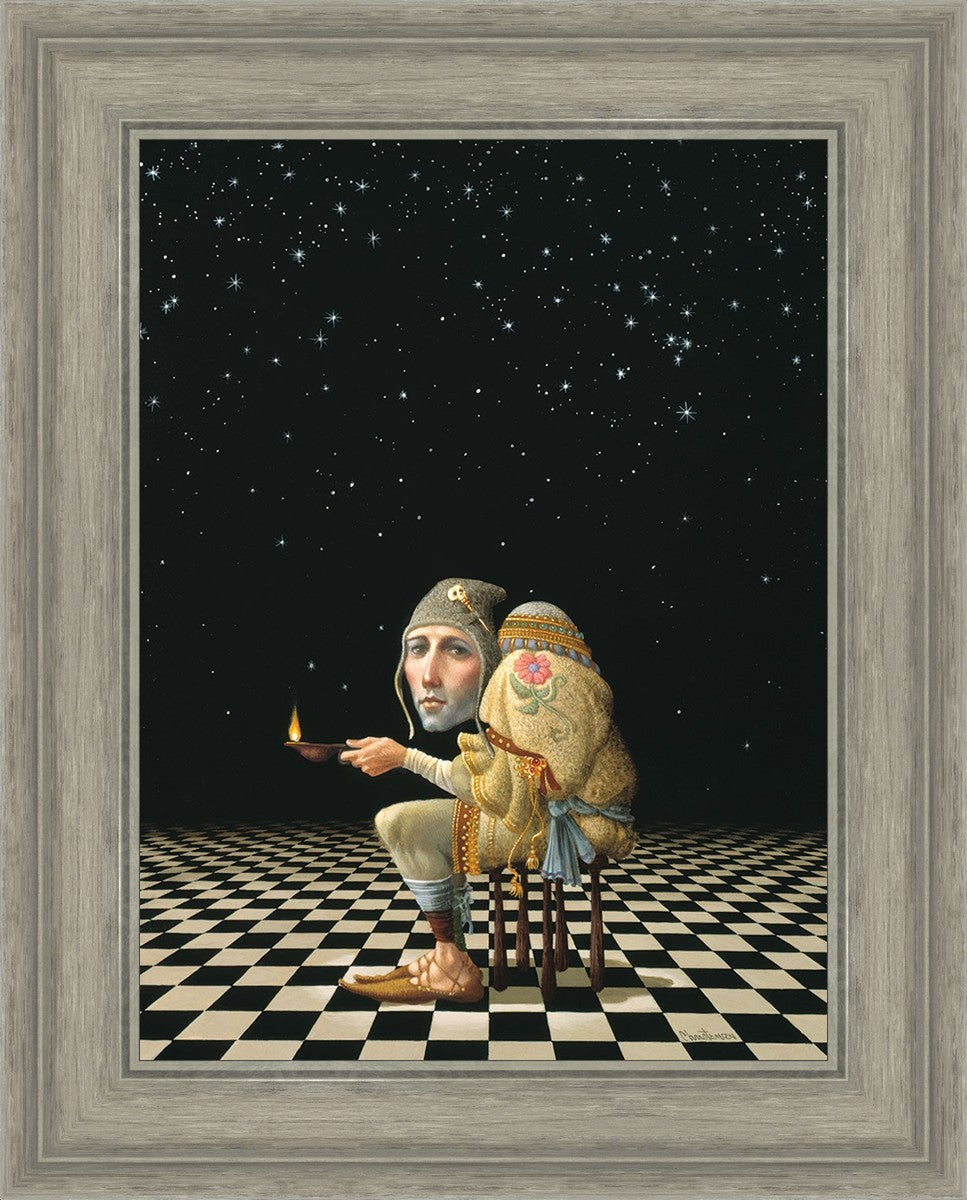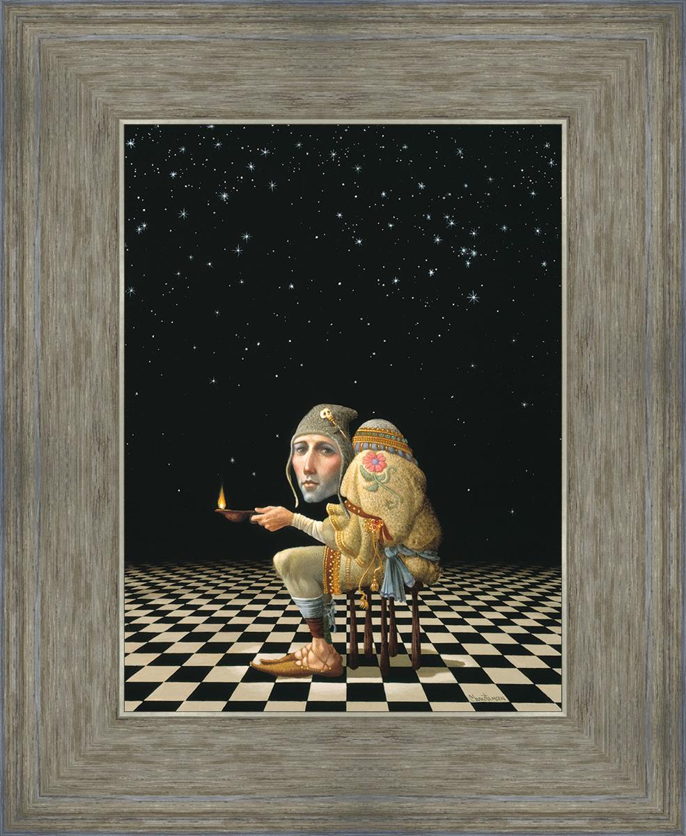 James’ Hunchback Everyman sits on a checkerboard that extends infinitely into the universe. The hunch is not a physical deformity, it is a symbol of the burdens we carry. The checkerboard is the playing field of life, night and day, good and bad, light and dark.This symbolism extends to the flower embroidered on his shoulder - Life, and The Skull pin on his hat - Death.