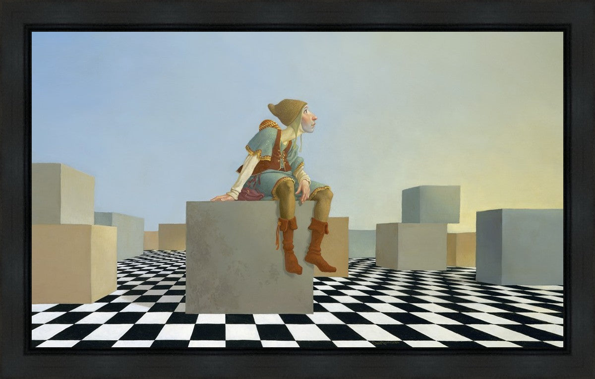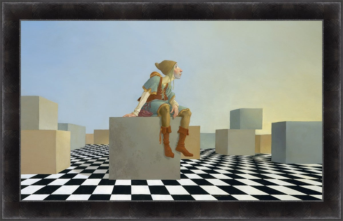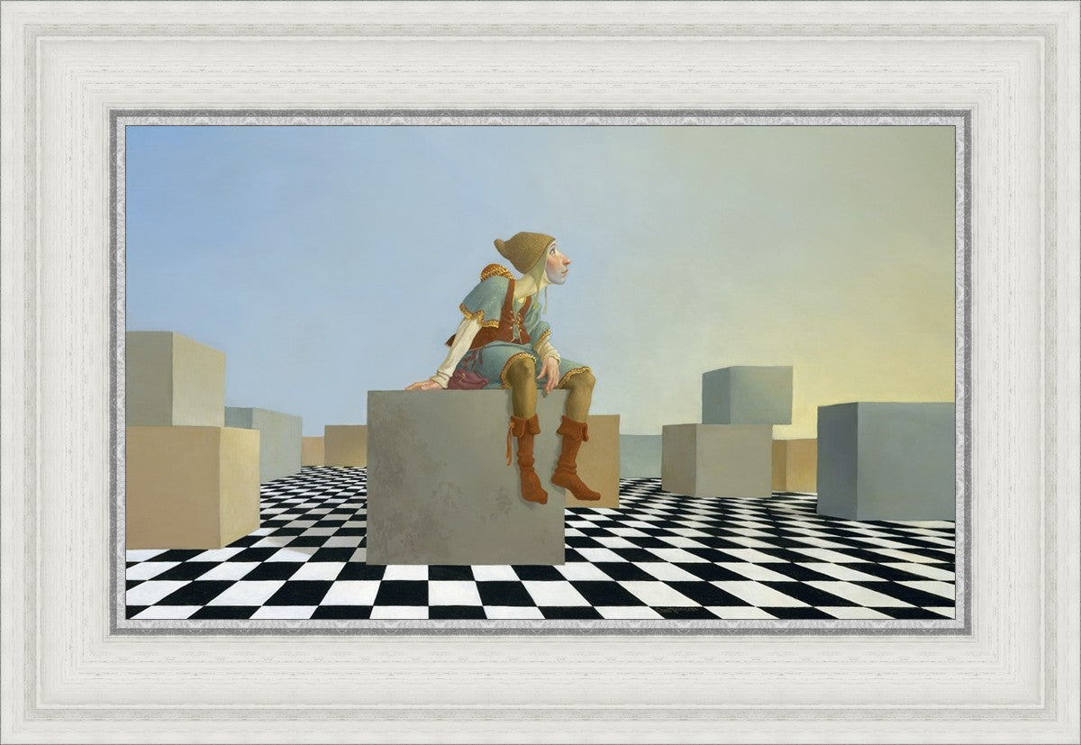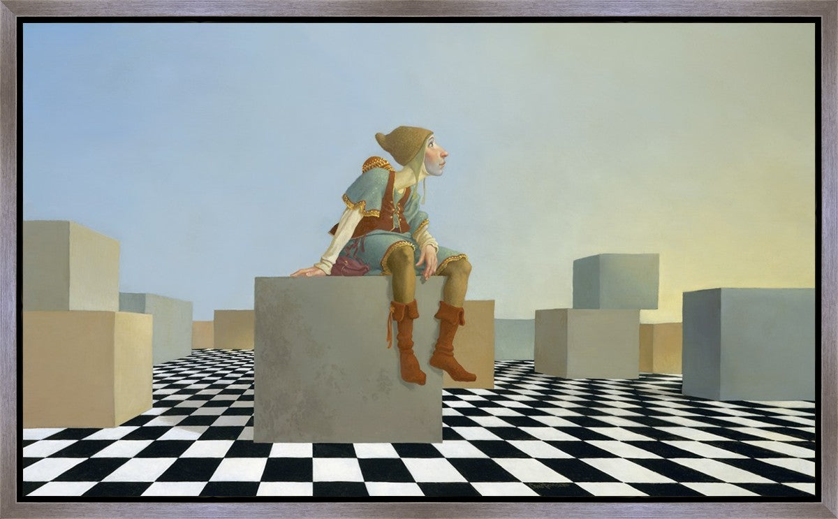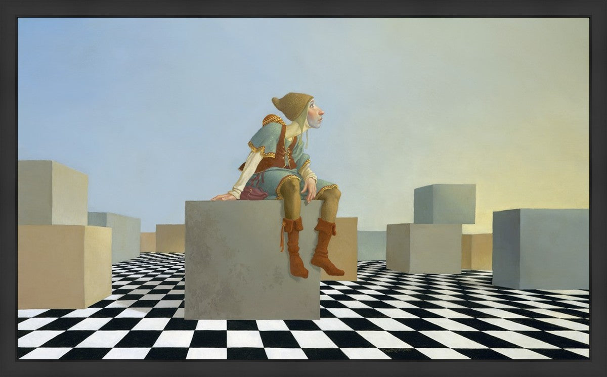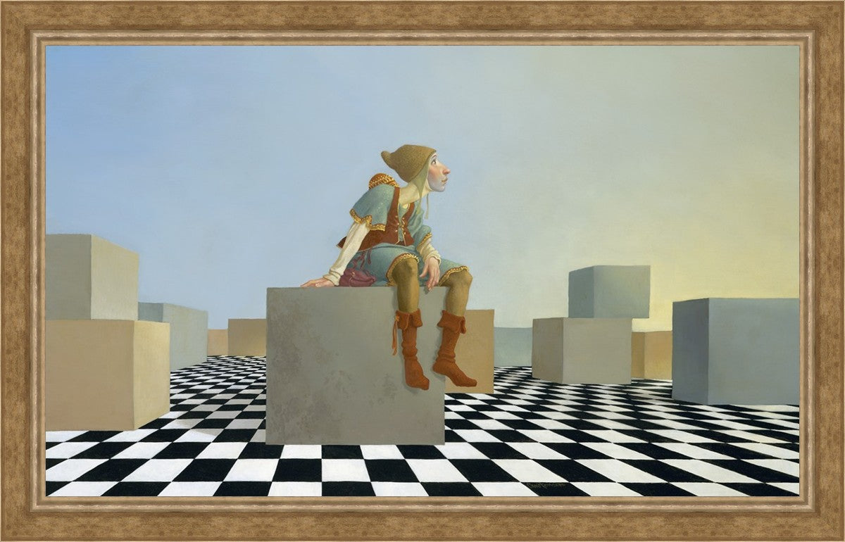 This hunchback “Everyman” of James C. Christensen’s symbology is not only thinking outside the box, he is outside of his box. He’s arrived, and if he had any trouble getting here, it’s behind him now. It’s like getting up very early in the morning, before everyone else, and taking that quiet time to reflect. It’s a perfect moment, sitting on the checkered game board of life, and contemplating a cloudless future. In a couple of hours he may be joined by others, or maybe not, but for now the sky’s the limit, the air smells great, and the possibilities are endless.