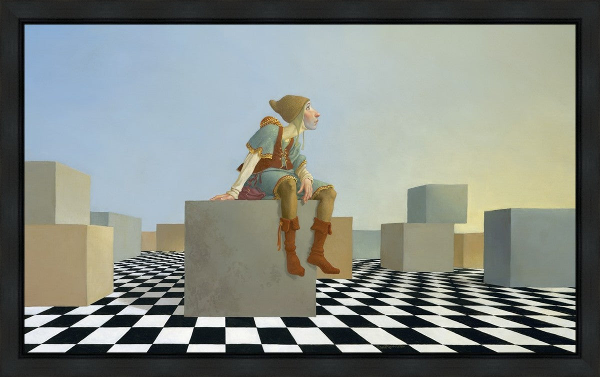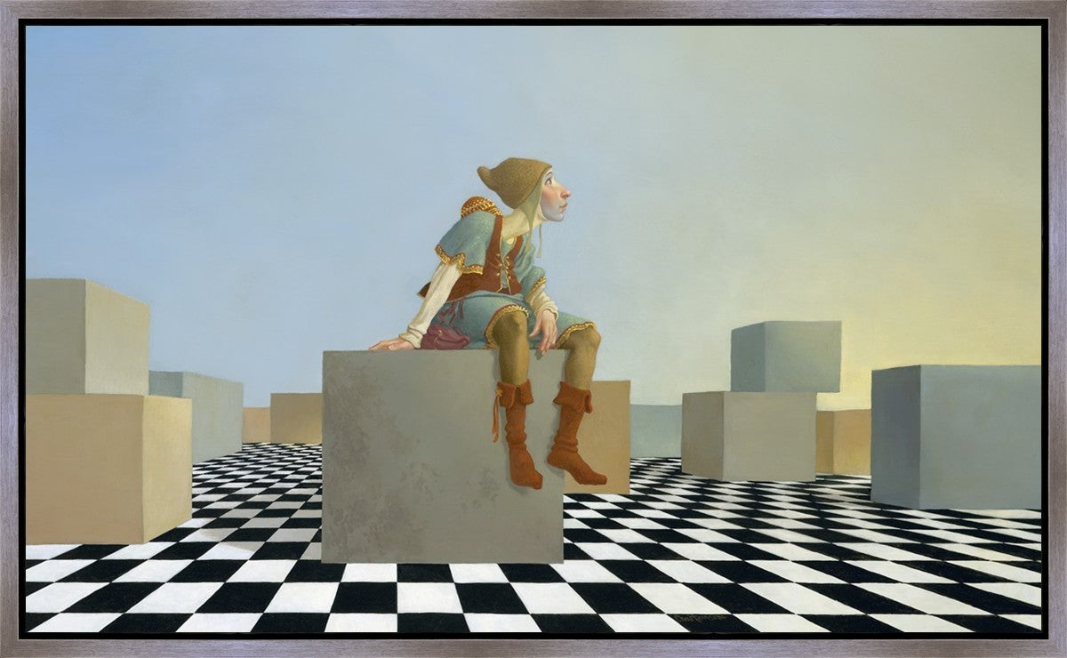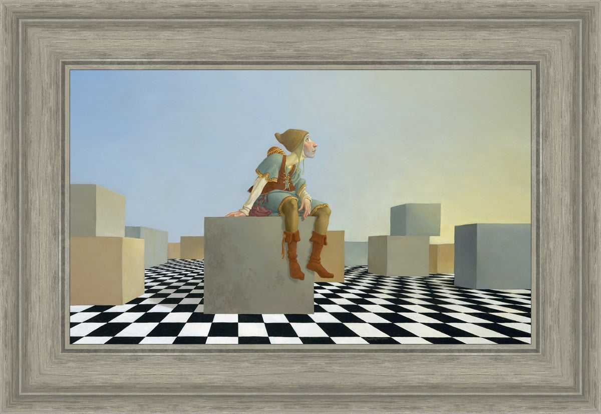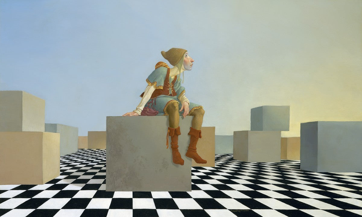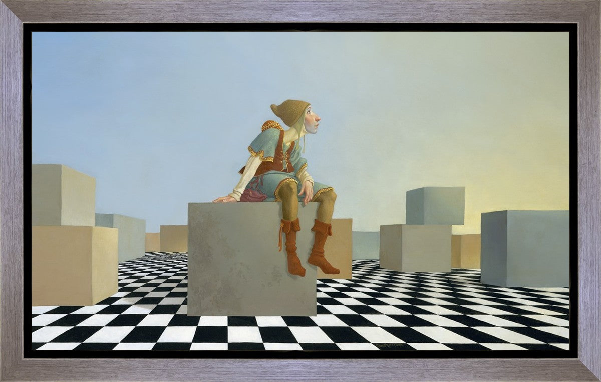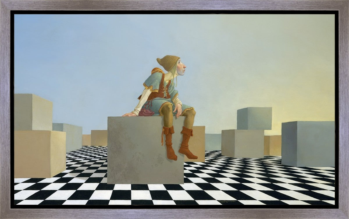 This hunchback “Everyman” of James C. Christensen’s symbology is not only thinking outside the box, he is outside of his box. He’s arrived, and if he had any trouble getting here, it’s behind him now. It’s like getting up very early in the morning, before everyone else, and taking that quiet time to reflect. It’s a perfect moment, sitting on the checkered game board of life, and contemplating a cloudless future. In a couple of hours he may be joined by others, or maybe not, but for now the sky’s the limit, the air smells great, and the possibilities are endless.