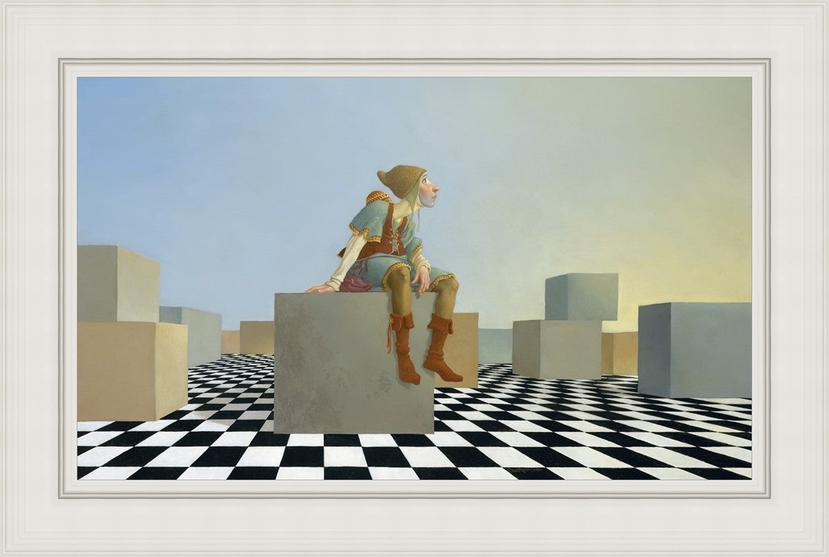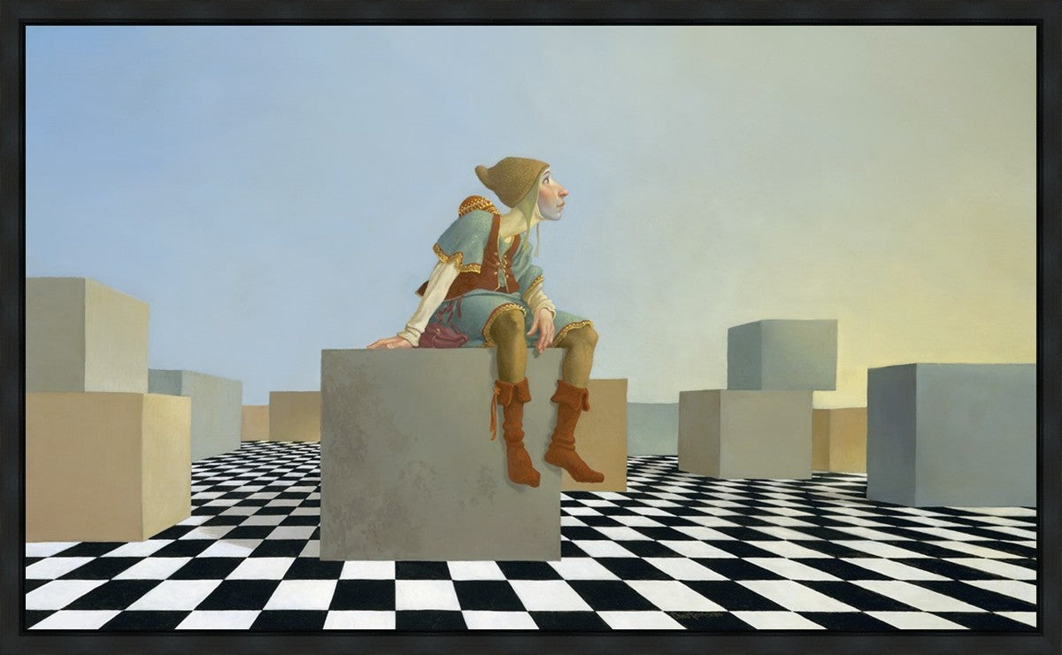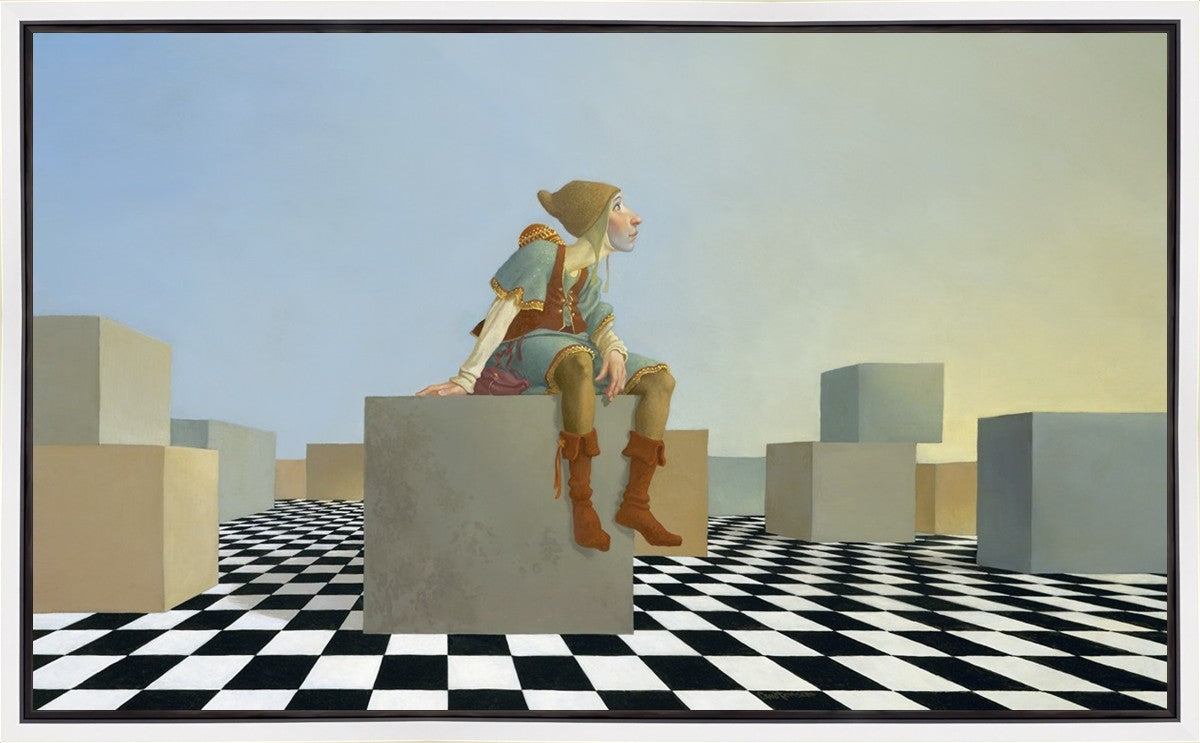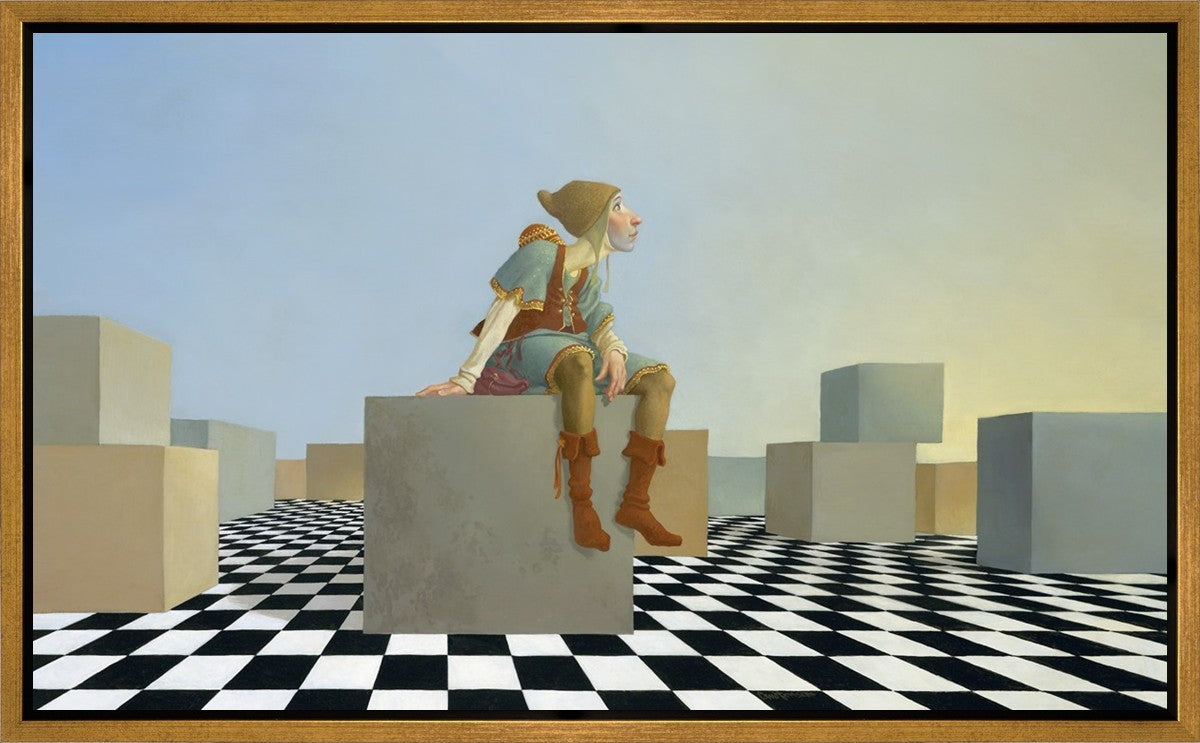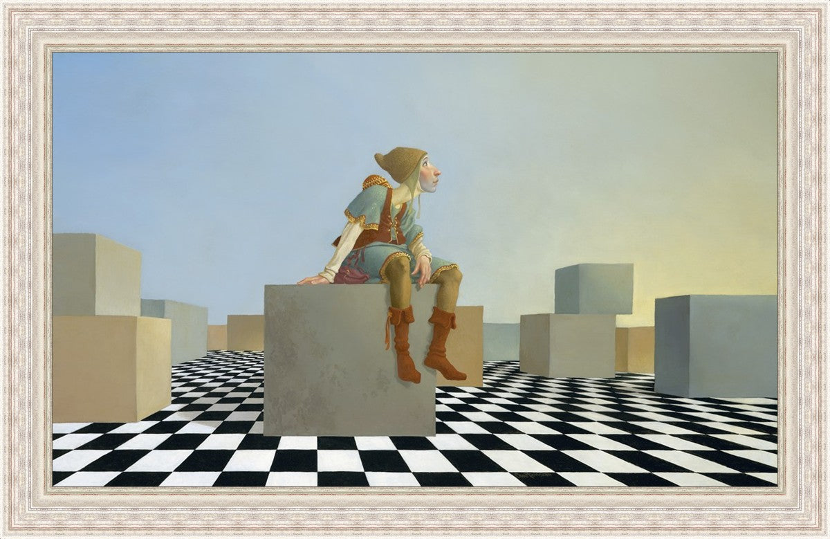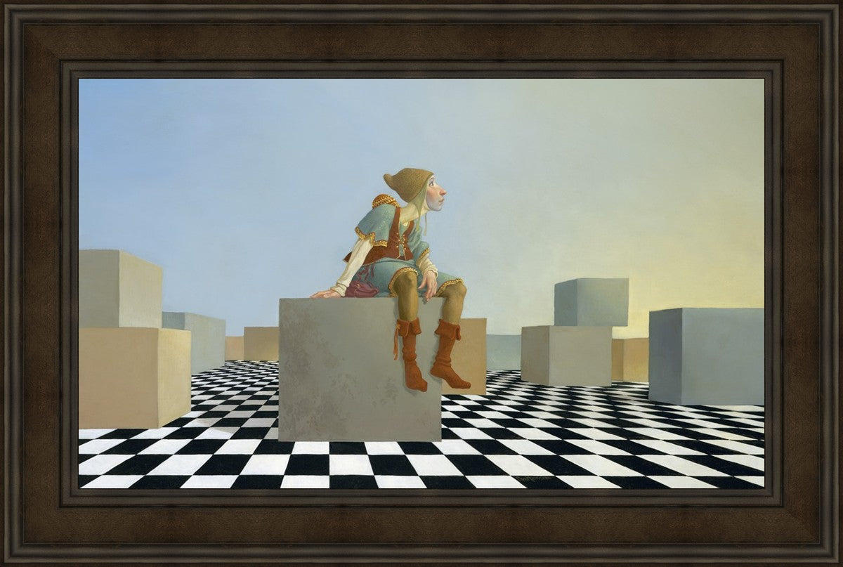 This hunchback “Everyman” of James C. Christensen’s symbology is not only thinking outside the box, he is outside of his box. He’s arrived, and if he had any trouble getting here, it’s behind him now. It’s like getting up very early in the morning, before everyone else, and taking that quiet time to reflect. It’s a perfect moment, sitting on the checkered game board of life, and contemplating a cloudless future. In a couple of hours he may be joined by others, or maybe not, but for now the sky’s the limit, the air smells great, and the possibilities are endless.