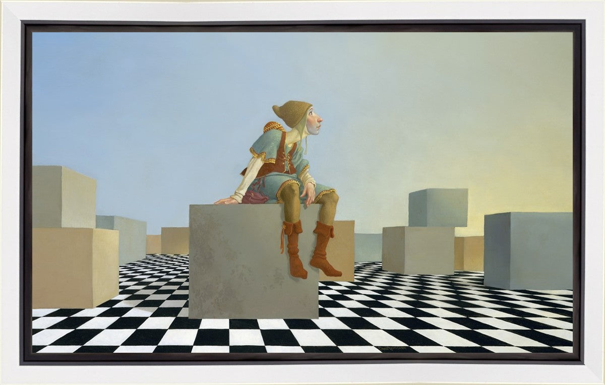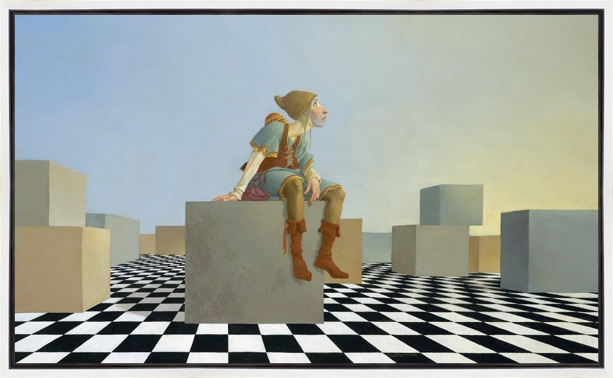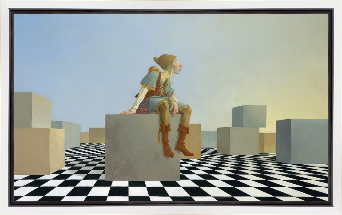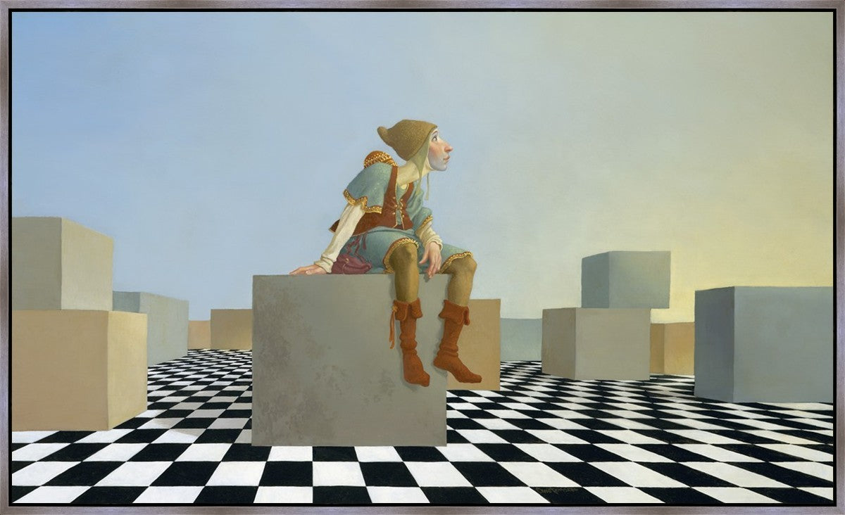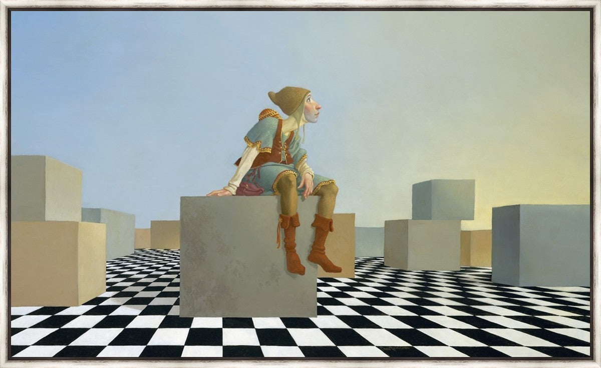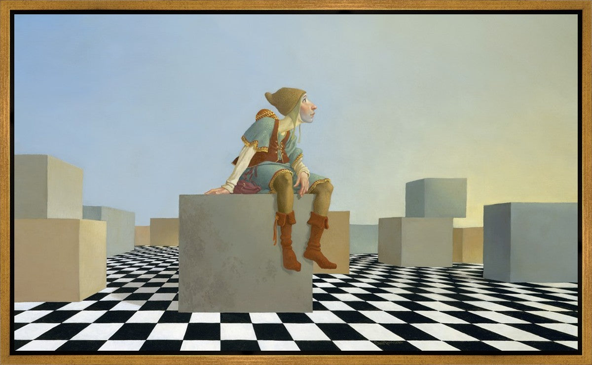 This hunchback “Everyman” of James C. Christensen’s symbology is not only thinking outside the box, he is outside of his box. He’s arrived, and if he had any trouble getting here, it’s behind him now. It’s like getting up very early in the morning, before everyone else, and taking that quiet time to reflect. It’s a perfect moment, sitting on the checkered game board of life, and contemplating a cloudless future. In a couple of hours he may be joined by others, or maybe not, but for now the sky’s the limit, the air smells great, and the possibilities are endless.