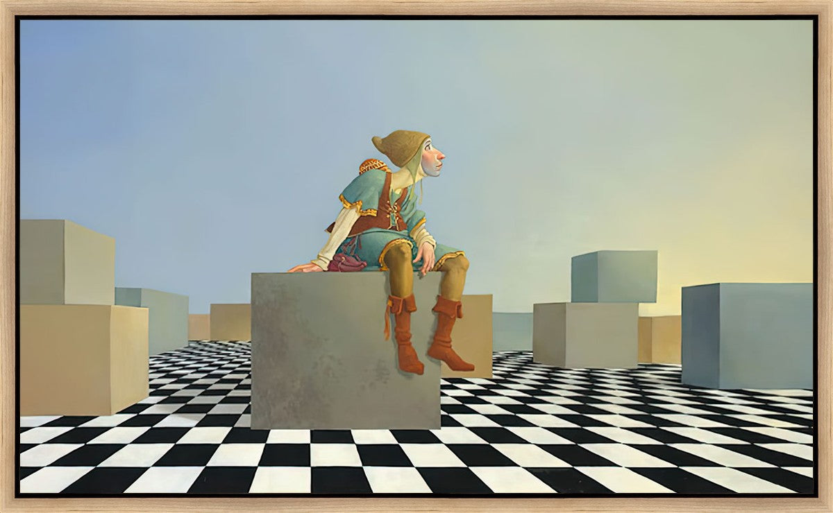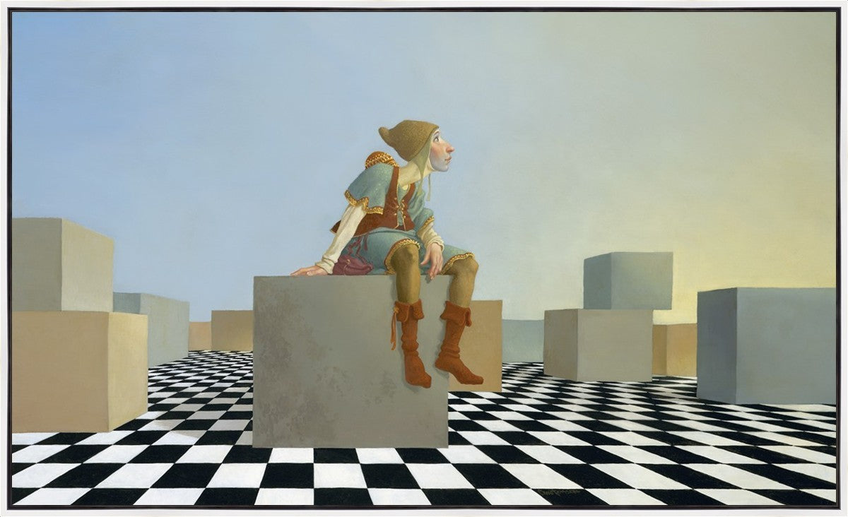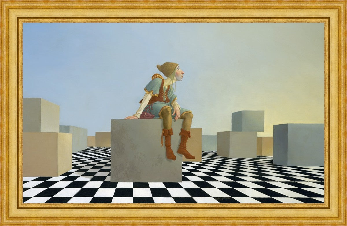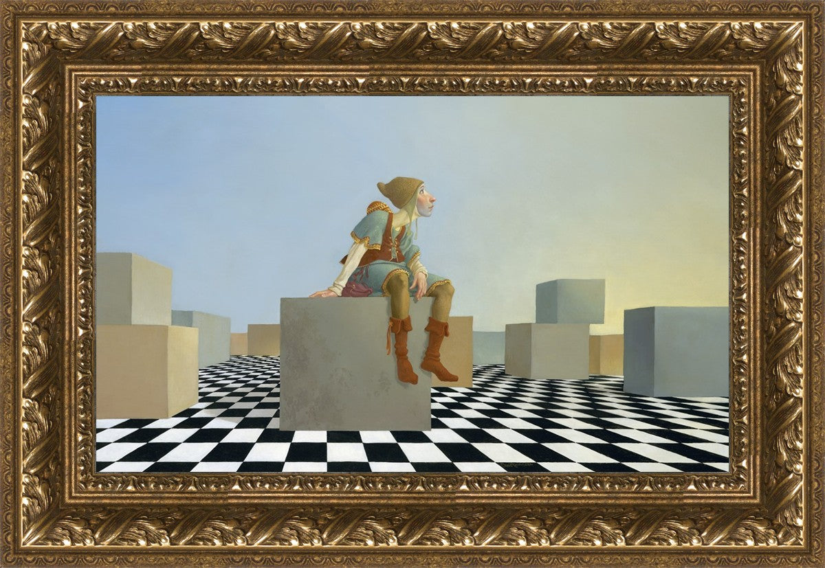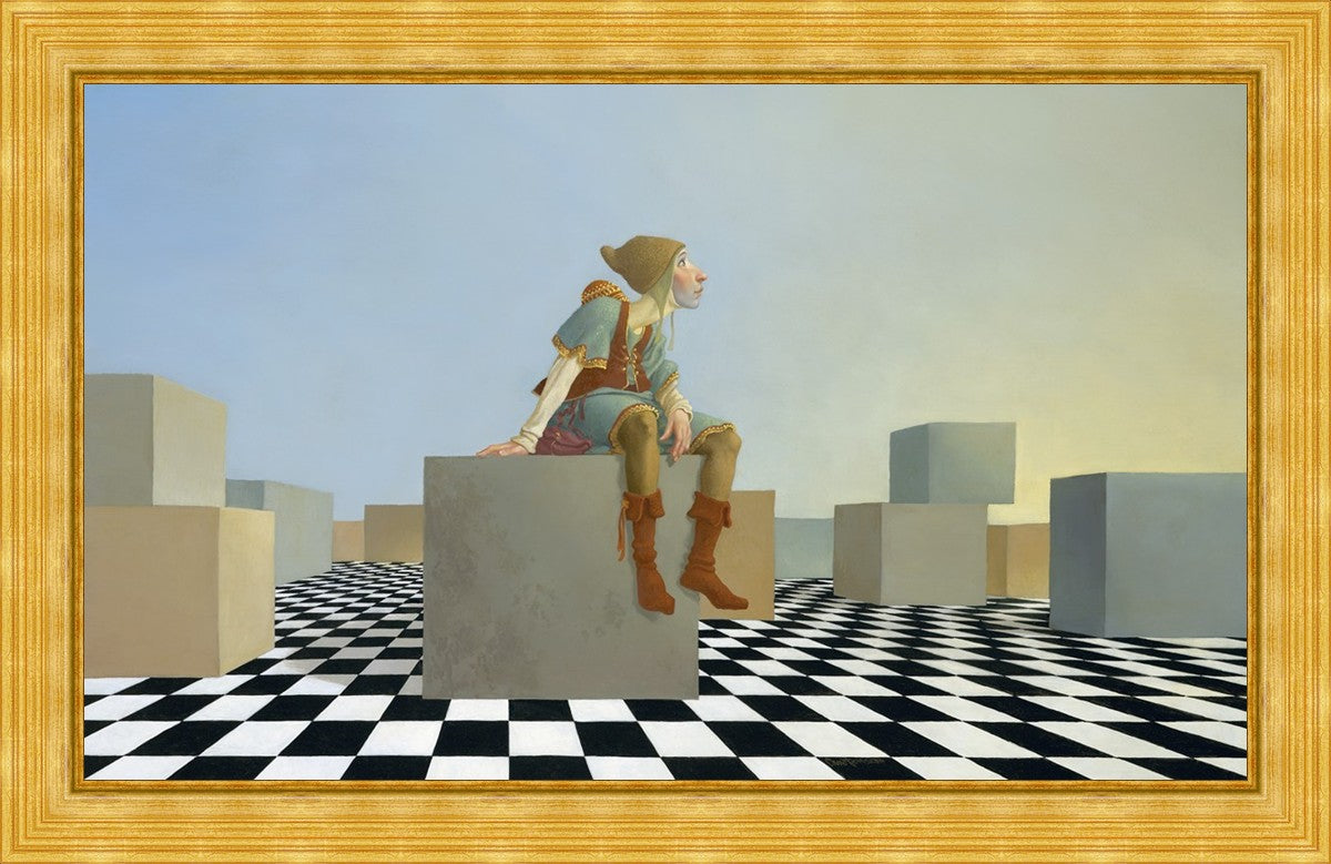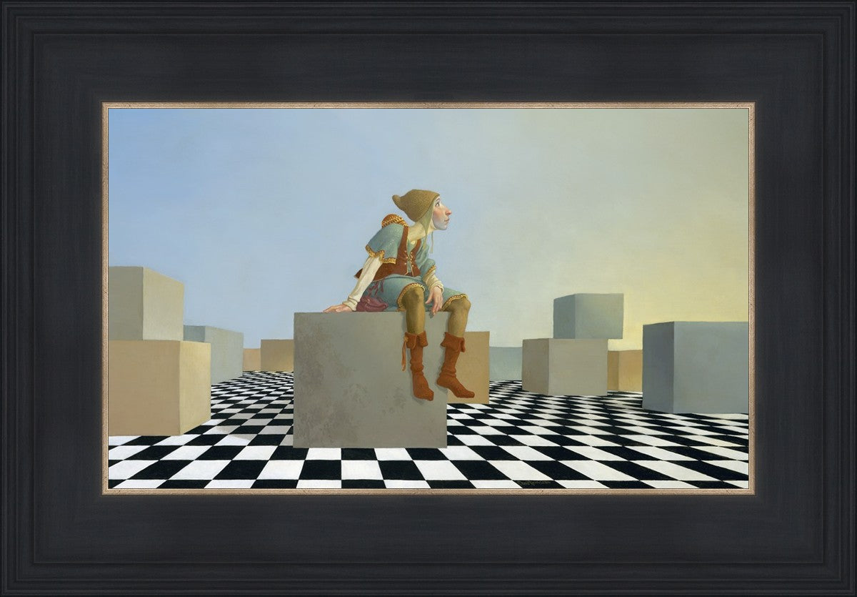 This hunchback “Everyman” of James C. Christensen’s symbology is not only thinking outside the box, he is outside of his box. He’s arrived, and if he had any trouble getting here, it’s behind him now. It’s like getting up very early in the morning, before everyone else, and taking that quiet time to reflect. It’s a perfect moment, sitting on the checkered game board of life, and contemplating a cloudless future. In a couple of hours he may be joined by others, or maybe not, but for now the sky’s the limit, the air smells great, and the possibilities are endless.