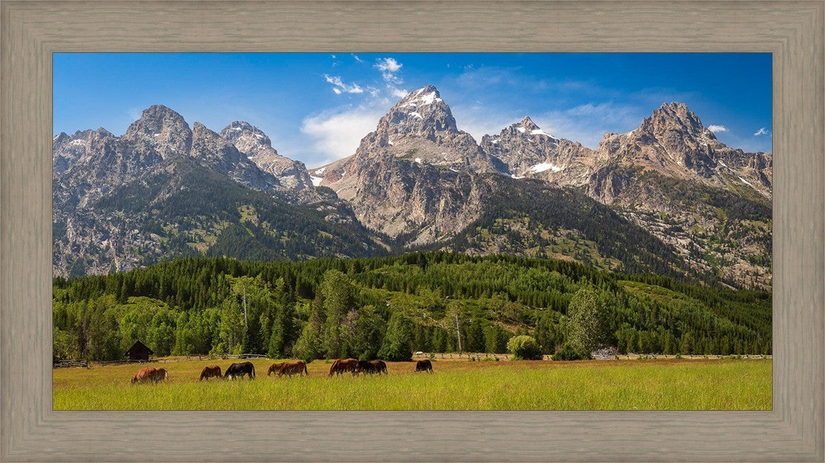 This panoramic view of the magnificent Grand Teton Mountain Range with horses in the foreground is the traditional symbol of the American West. This photograph looks best when printed wide in panorama format