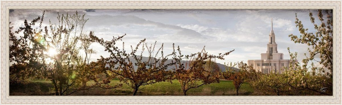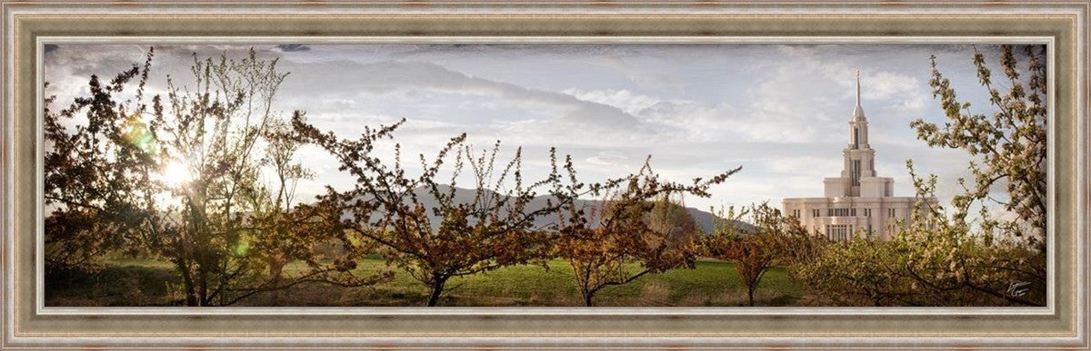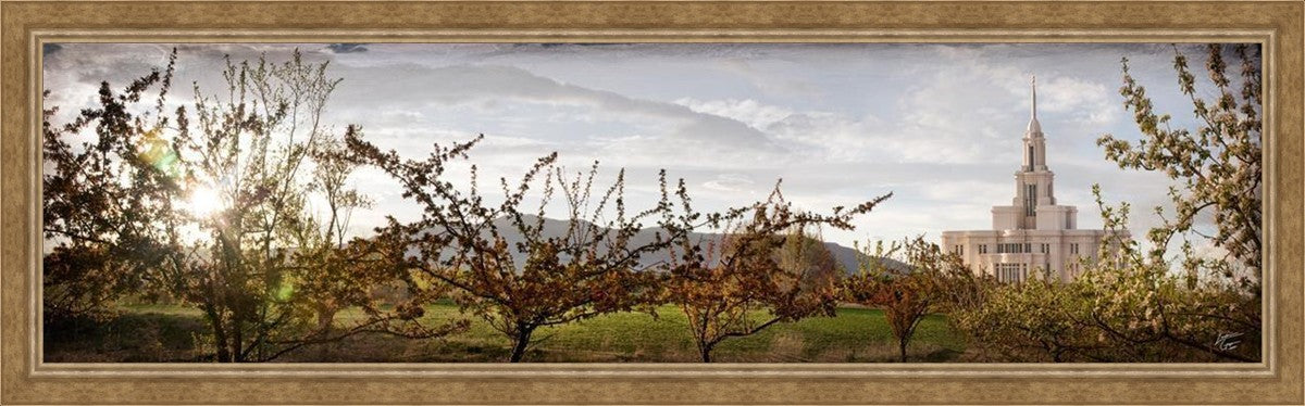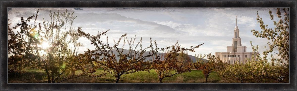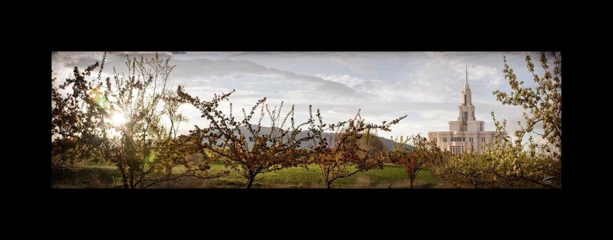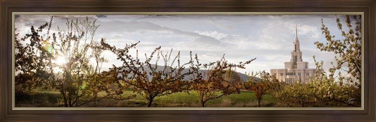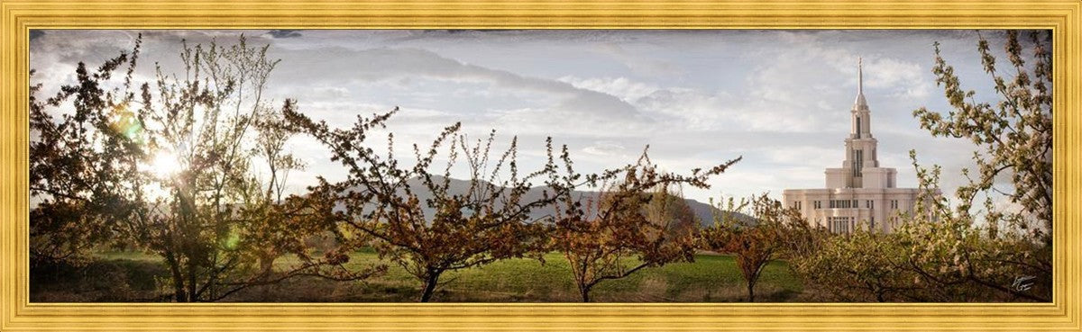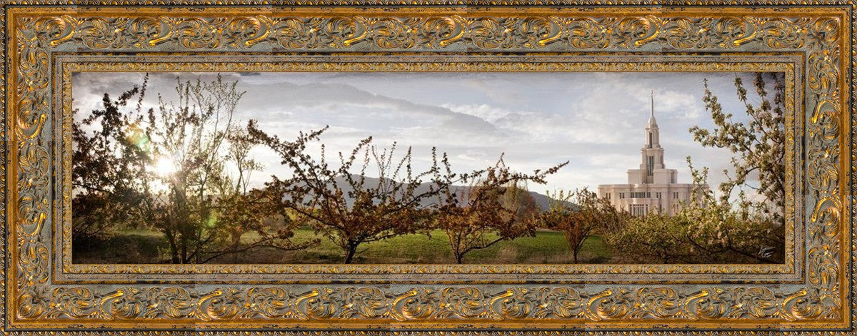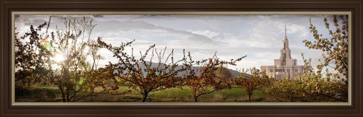 Since 1999 Landon has worked as an artisan in nearly 40 temples doing the decorative paint and gold leaf. He continues to do so as well as wood repair and graining. He was married in 2001 to Jacey Thomas in the Manti Utah temple. When she couldn’t find an image of the temple that she liked enough to purchase for their home, he decided to take one himself. That desire to create something original and different inspired his current series of temple art. They are taken from a panoramic viewpoint and stylized with an artistic border that reflect his paintings. All modern structures apart from the temple have been omitted.