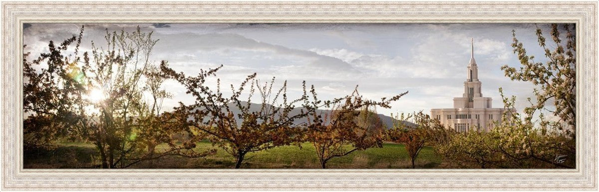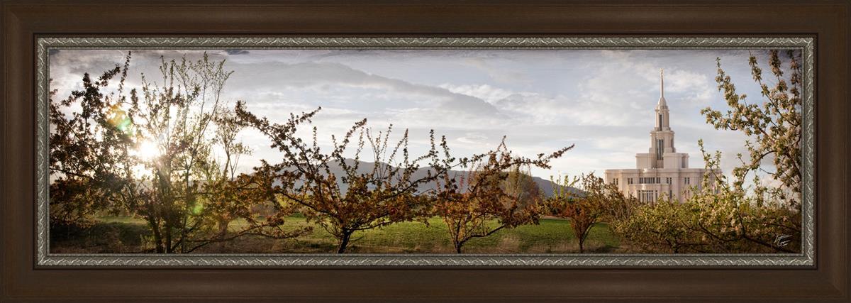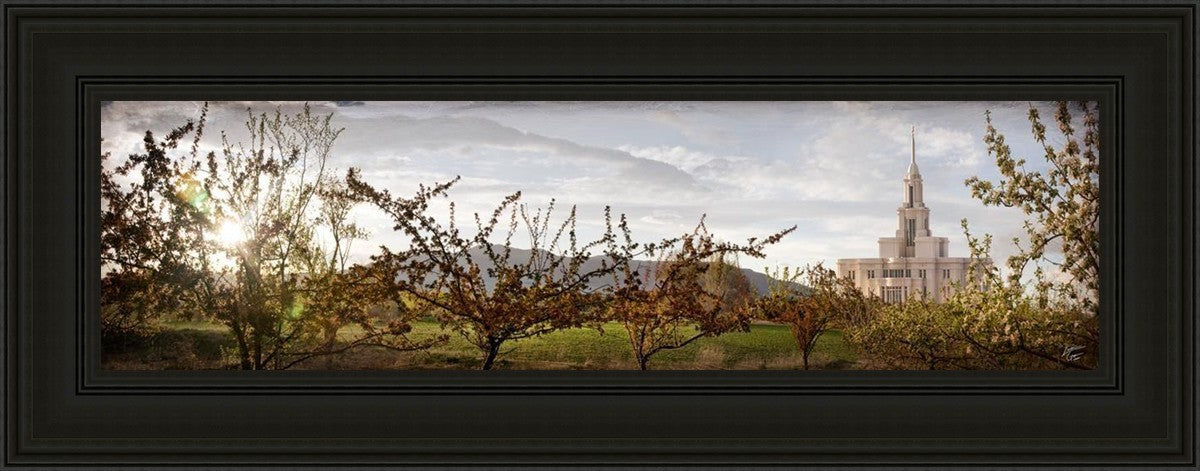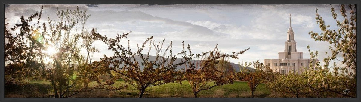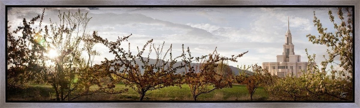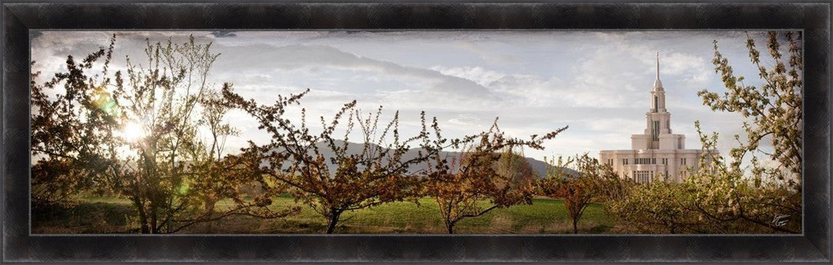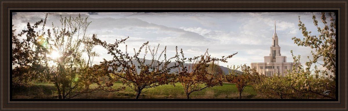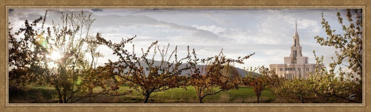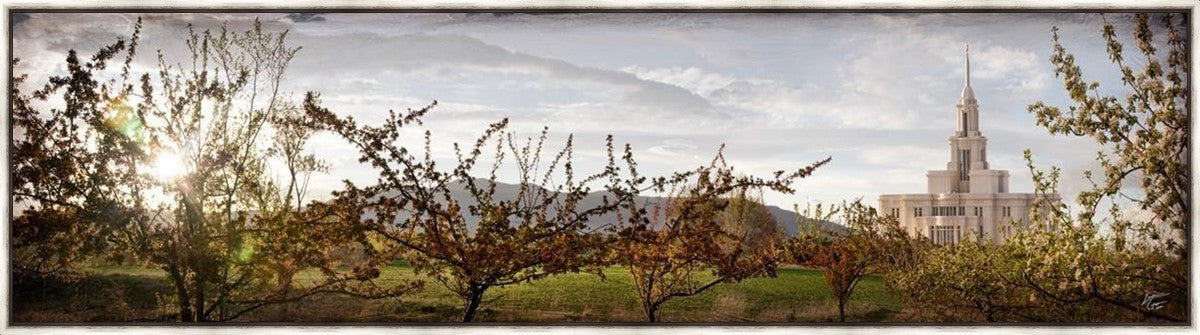 Since 1999 Landon has worked as an artisan in nearly 40 temples doing the decorative paint and gold leaf. He continues to do so as well as wood repair and graining. He was married in 2001 to Jacey Thomas in the Manti Utah temple. When she couldn’t find an image of the temple that she liked enough to purchase for their home, he decided to take one himself. That desire to create something original and different inspired his current series of temple art. They are taken from a panoramic viewpoint and stylized with an artistic border that reflect his paintings. All modern structures apart from the temple have been omitted.
