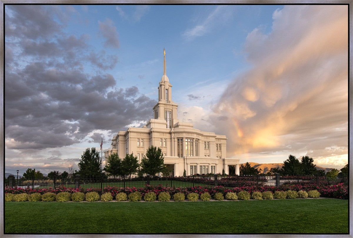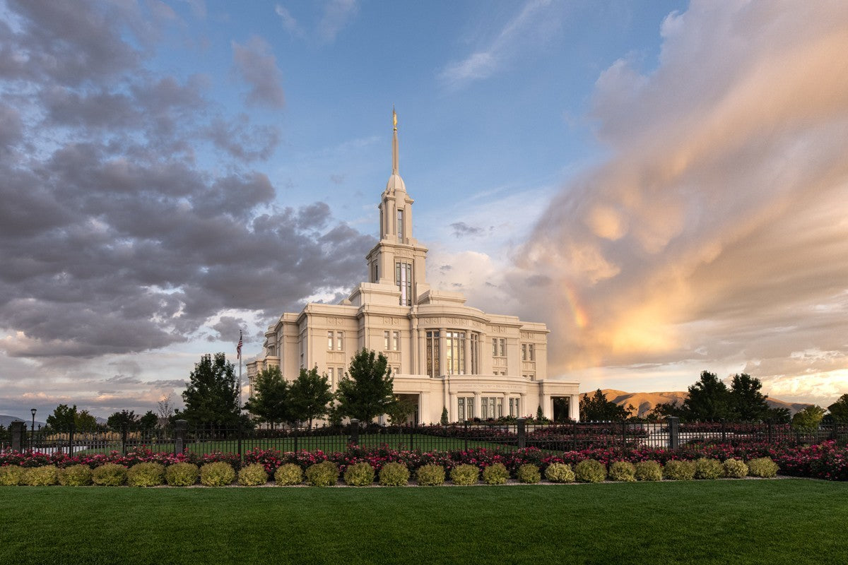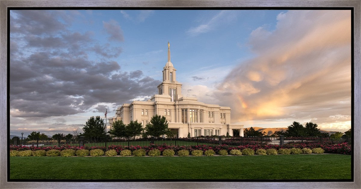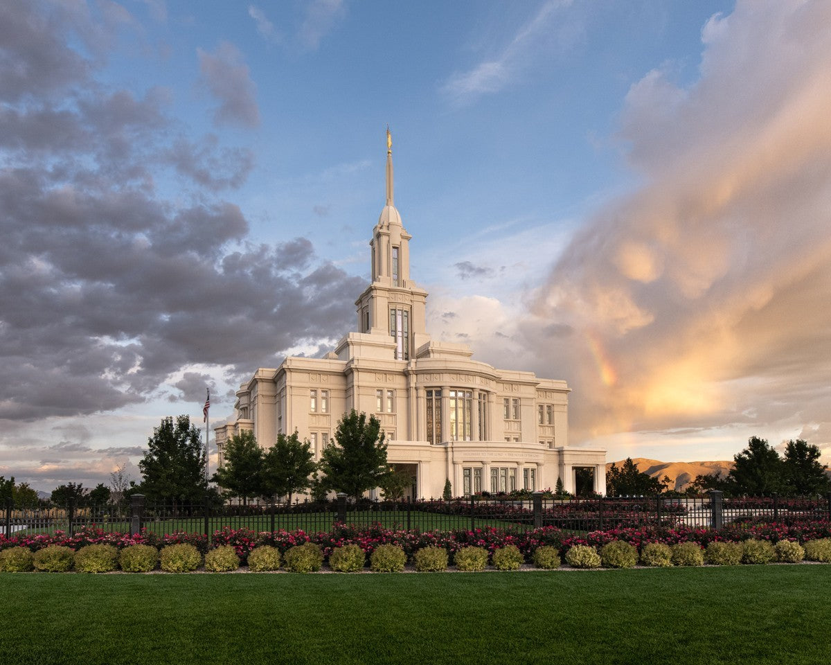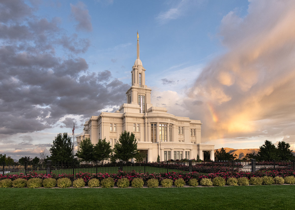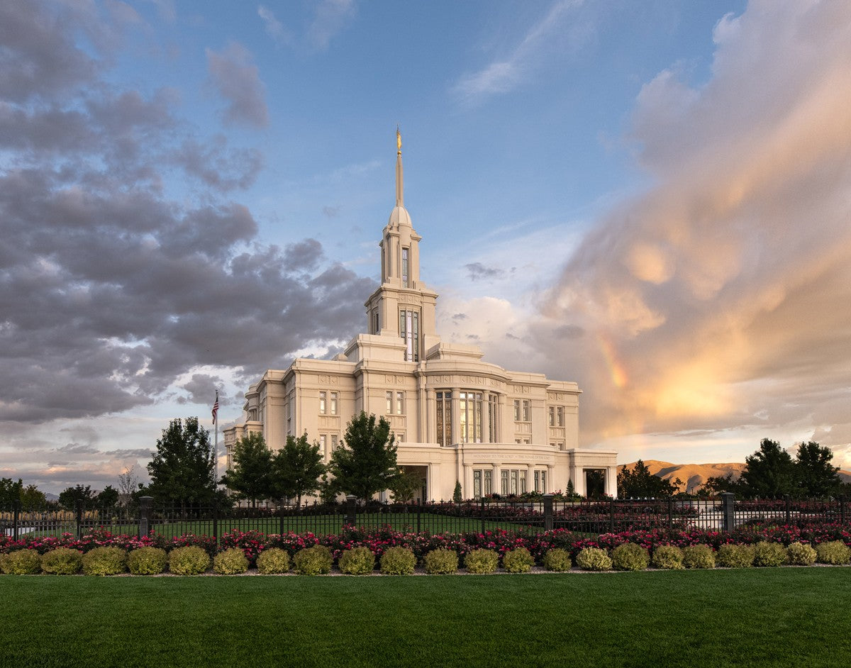 Because of the shadow from the mountains, I was able to capture this unique sunrise picture of the Payson Utah Temple with a hint of a rainbow.