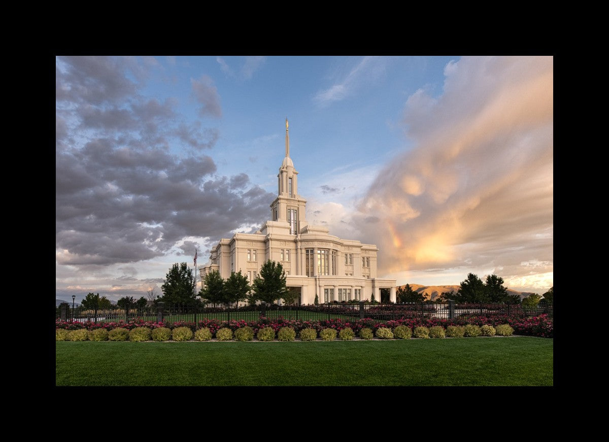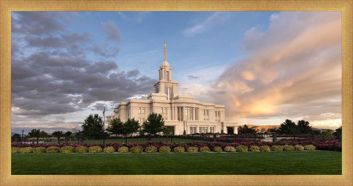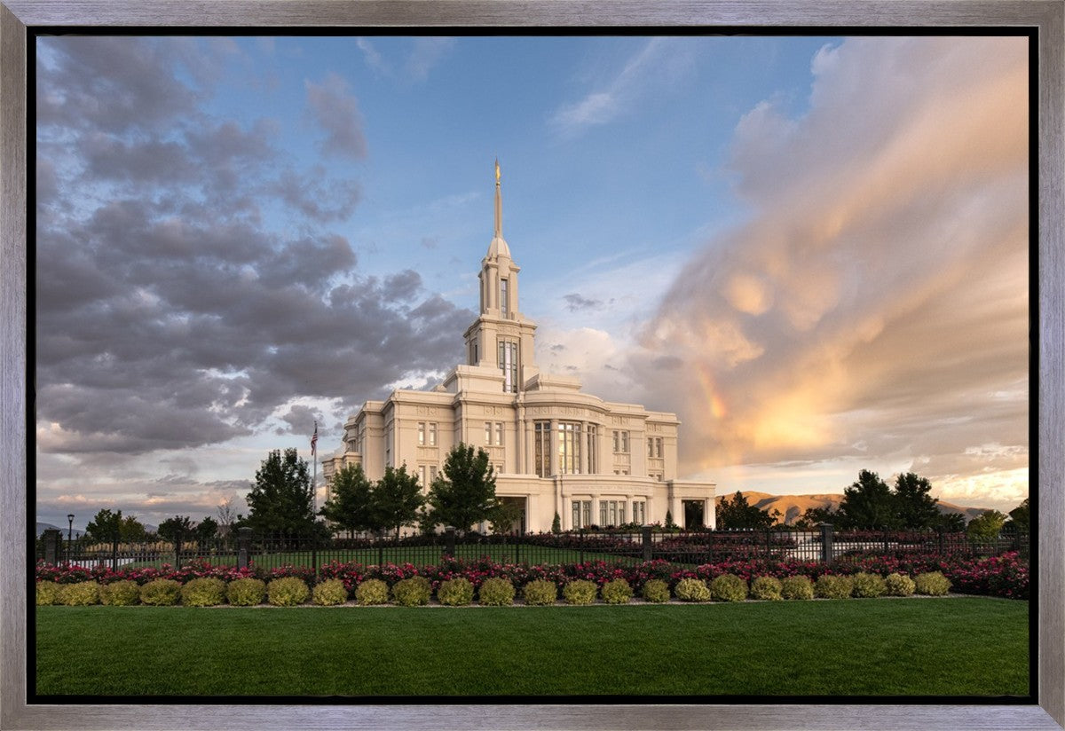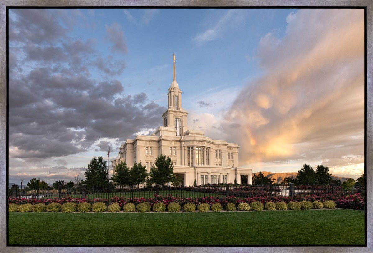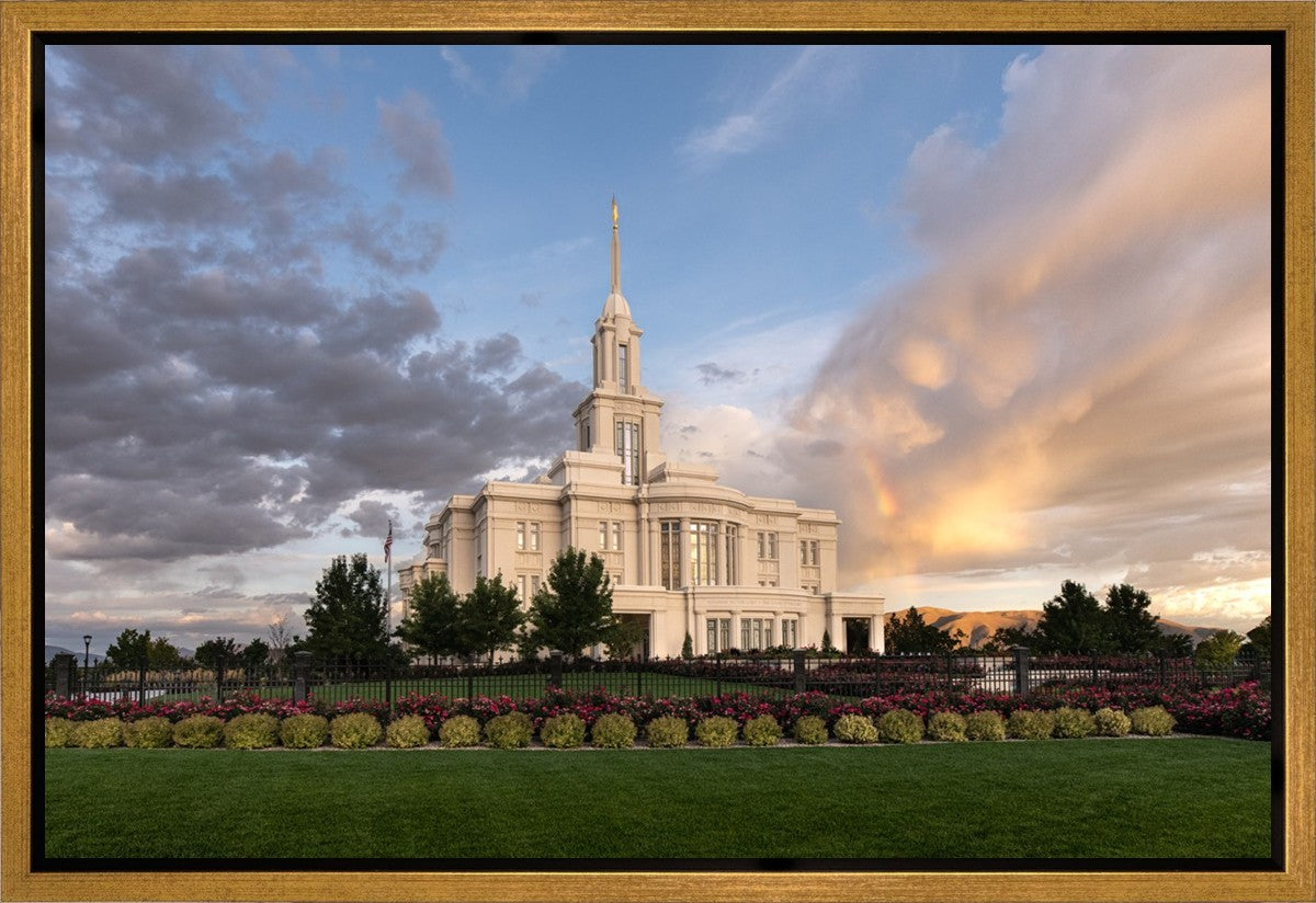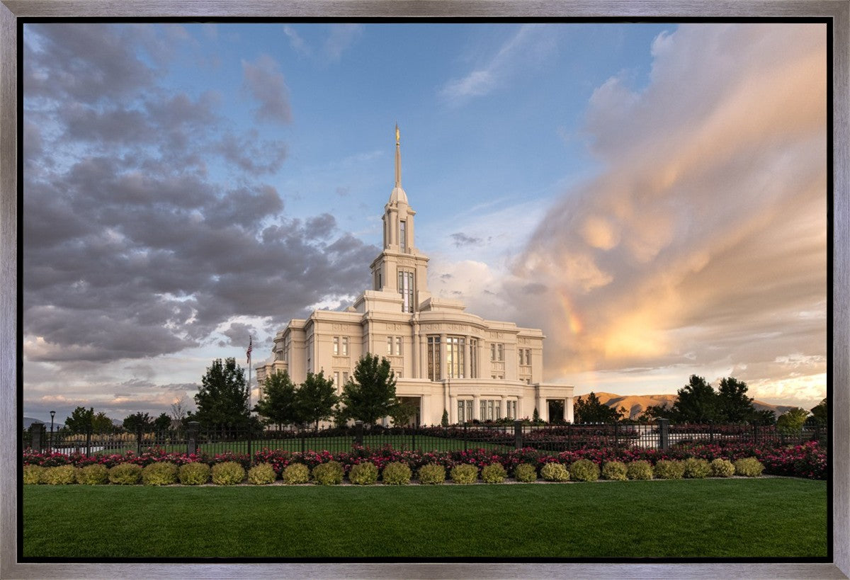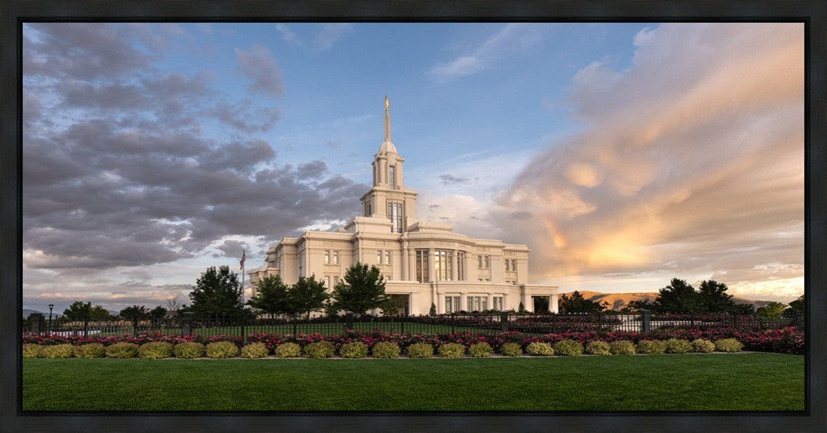 Because of the shadow from the mountains, I was able to capture this unique sunrise picture of the Payson Utah Temple with a hint of a rainbow.