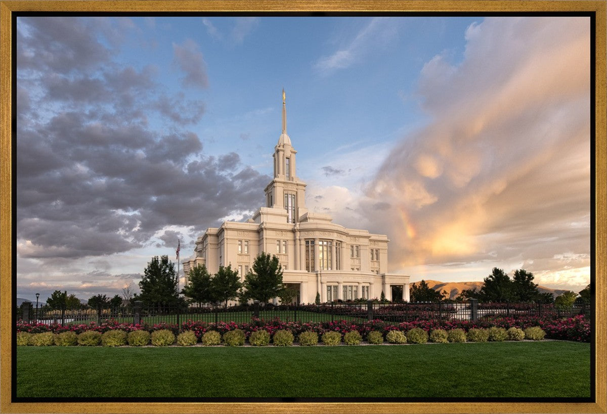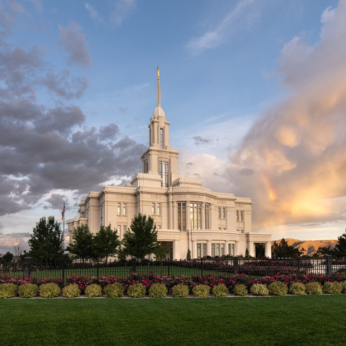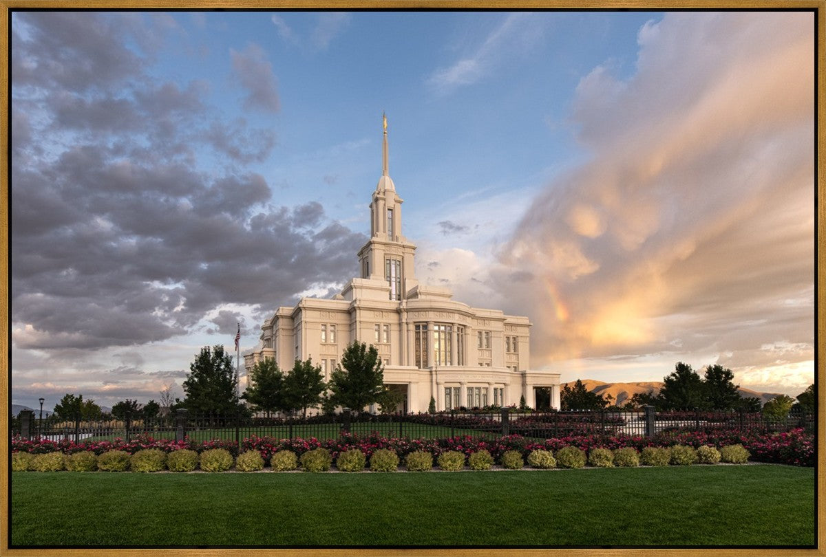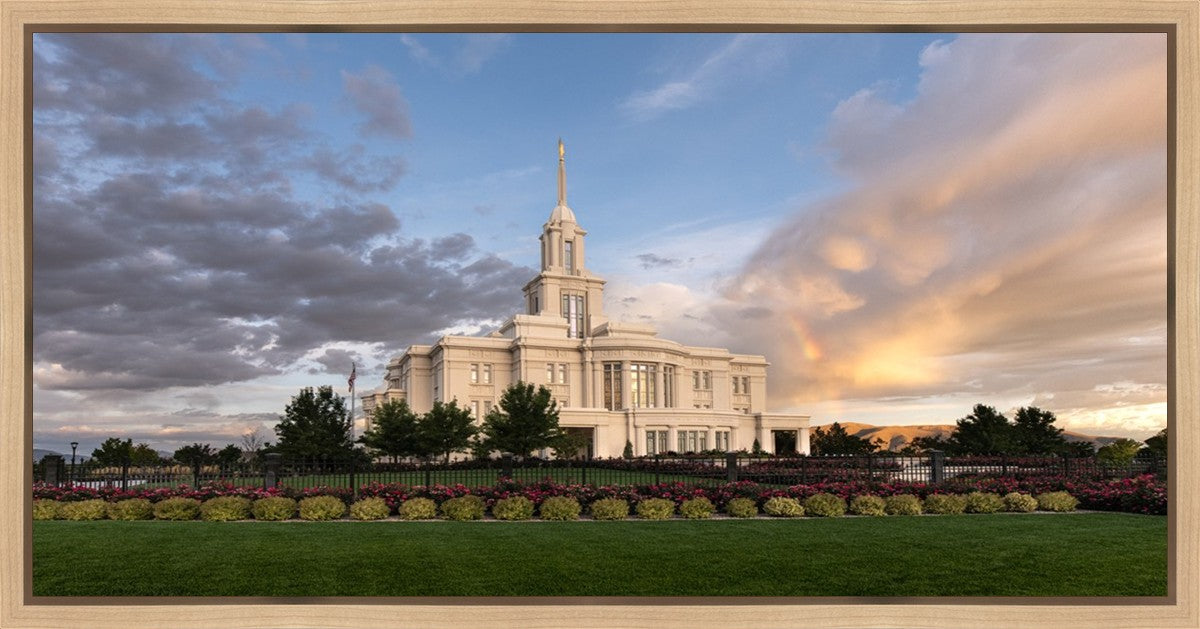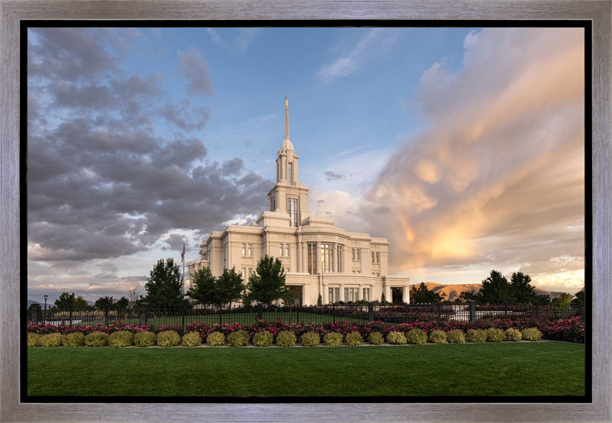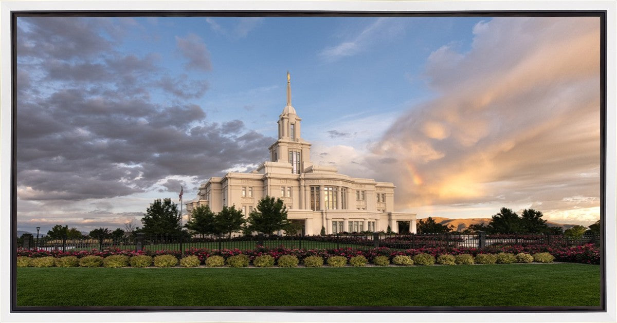 Because of the shadow from the mountains, I was able to capture this unique sunrise picture of the Payson Utah Temple with a hint of a rainbow.