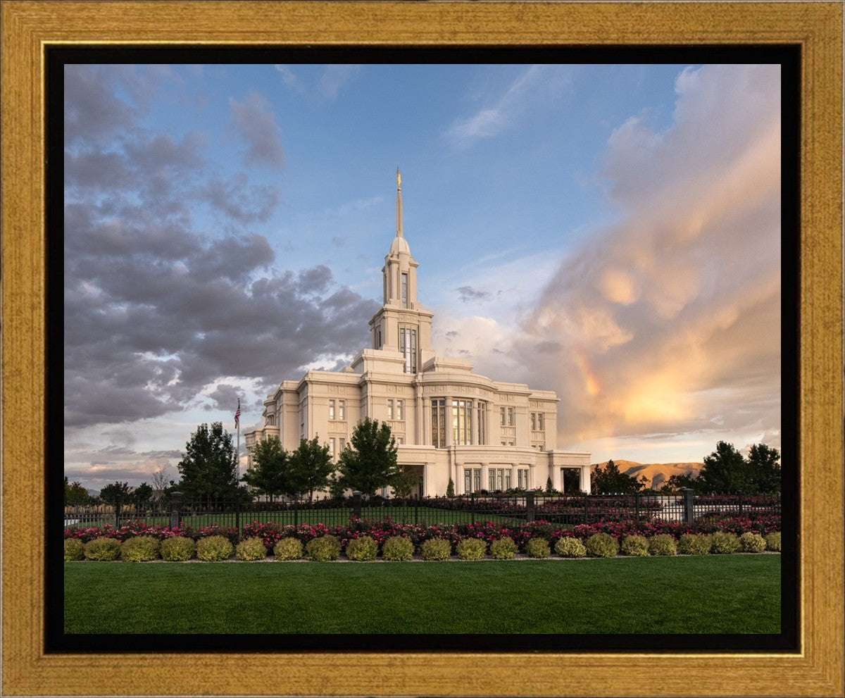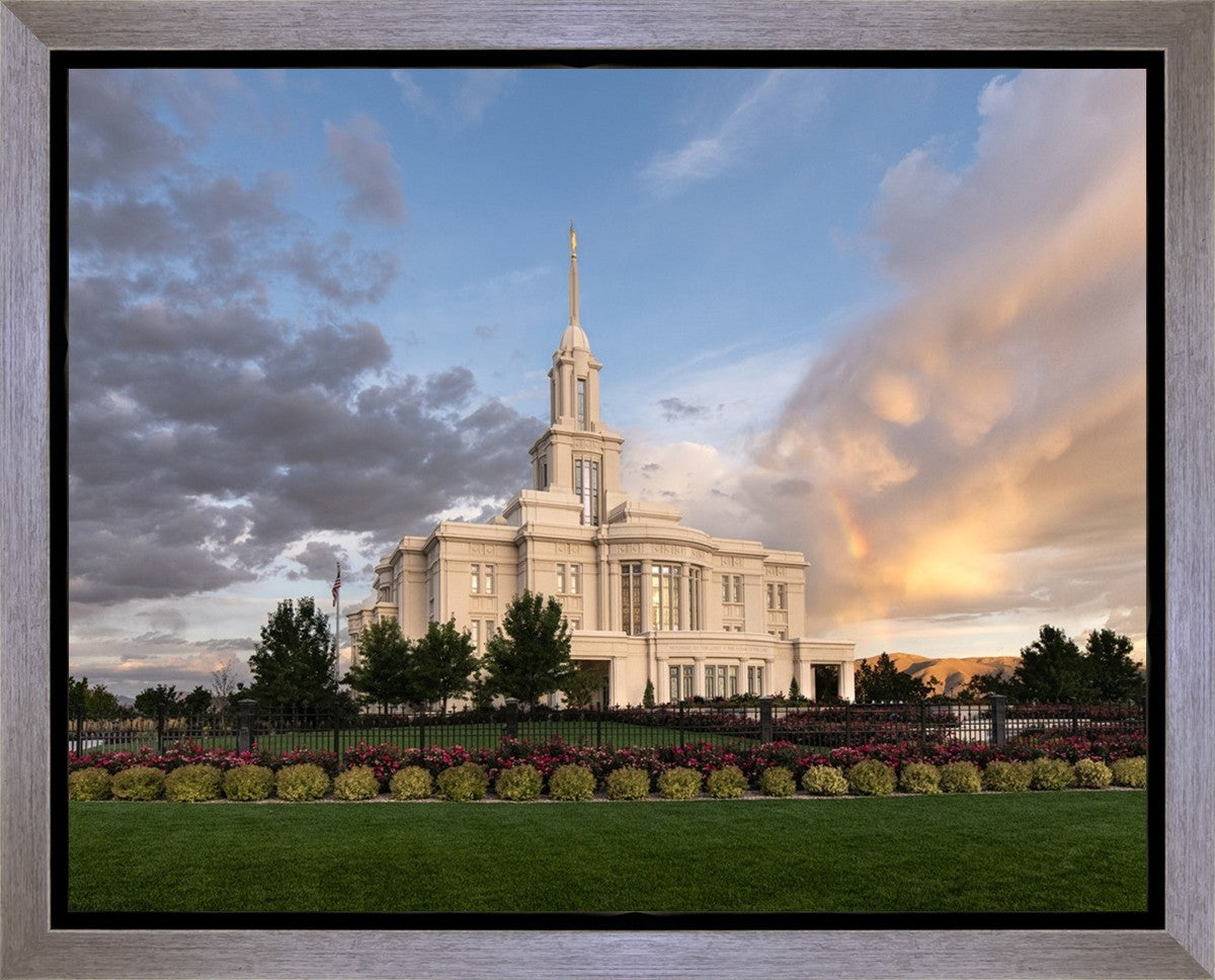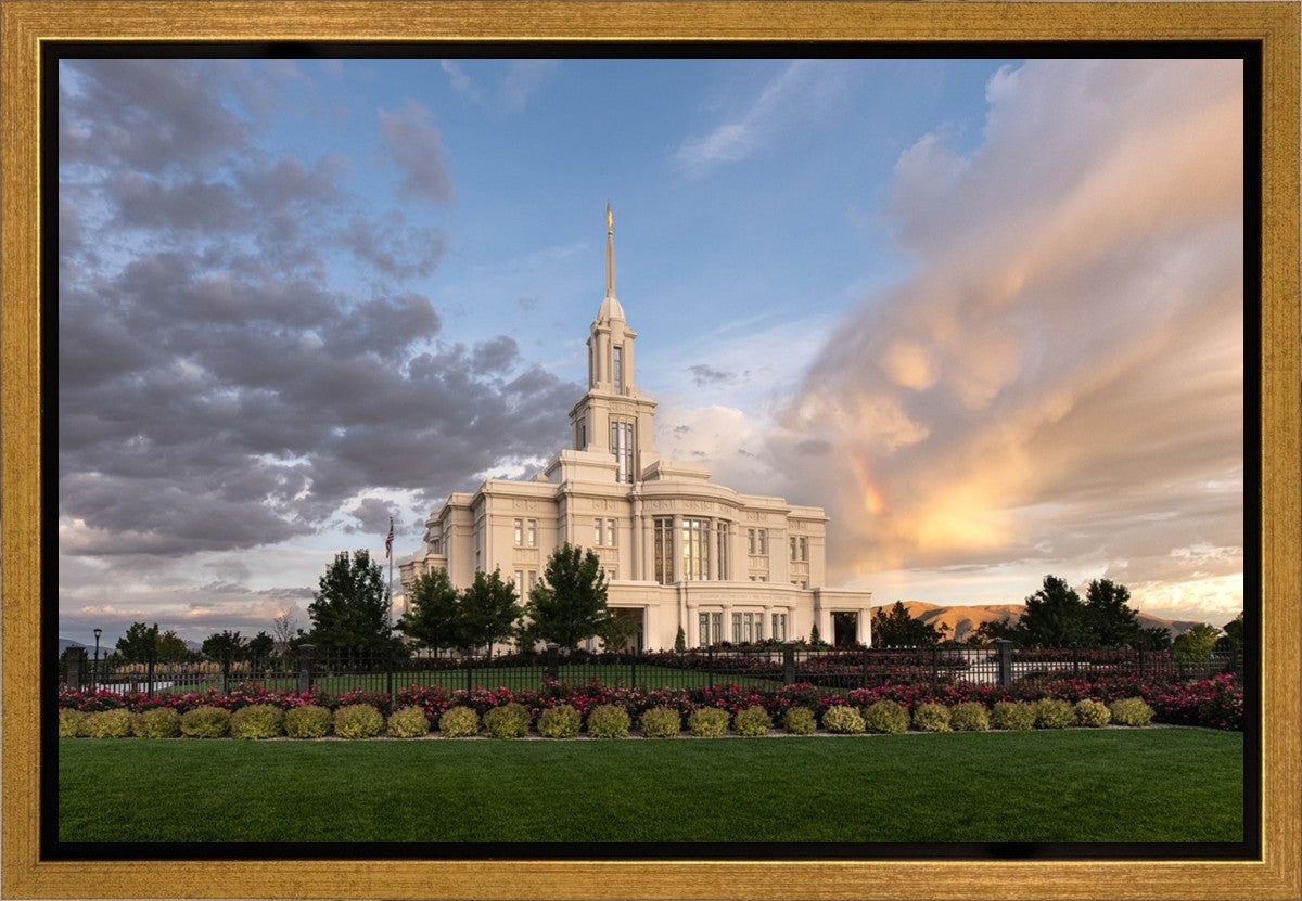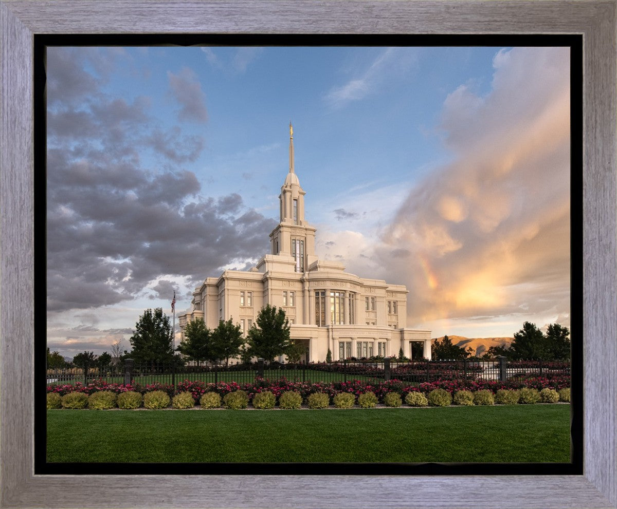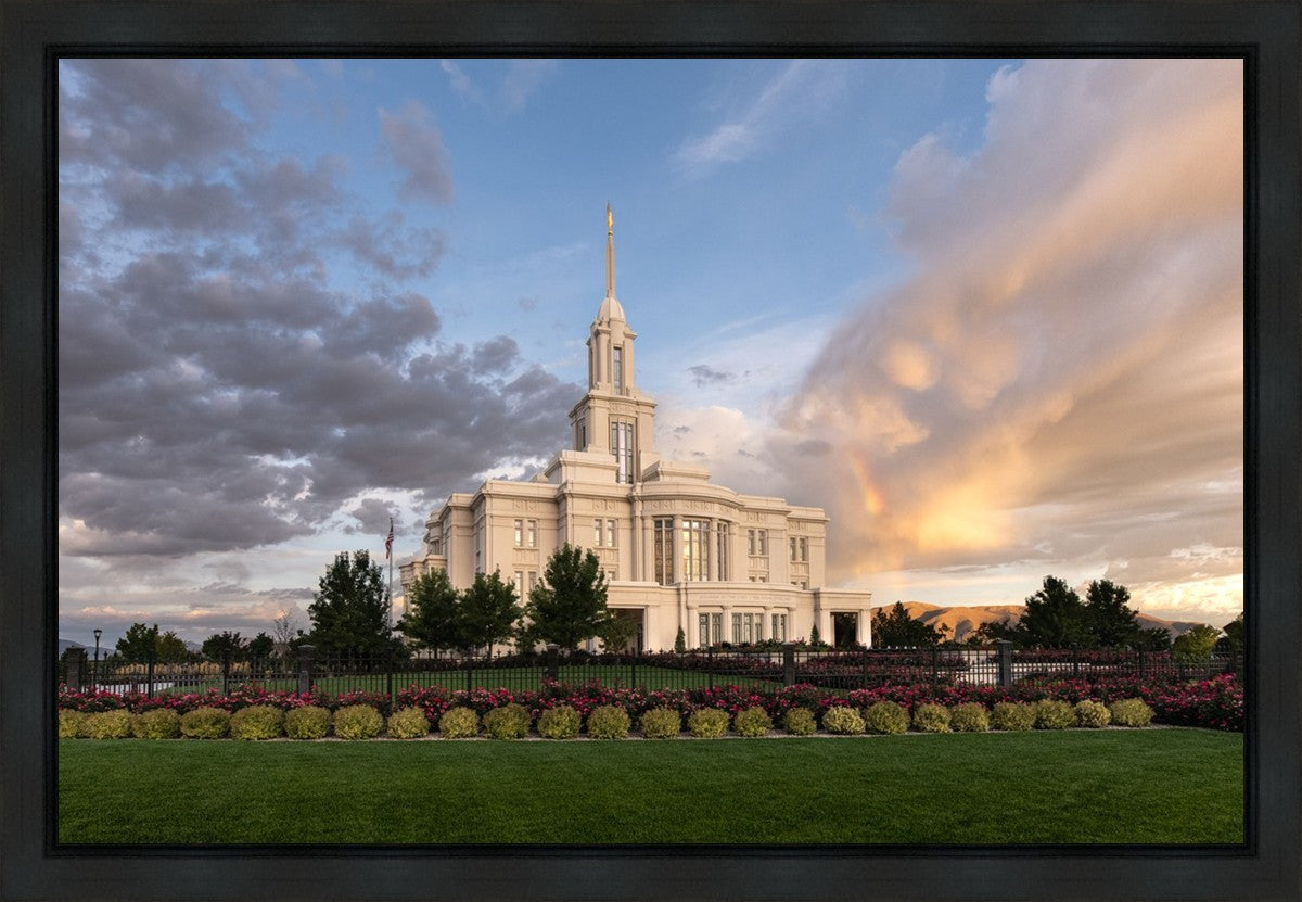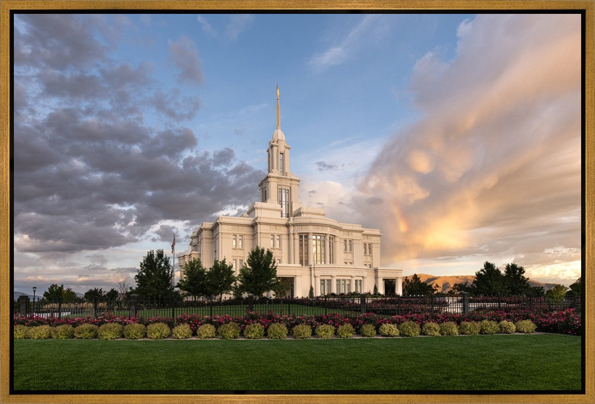 Because of the shadow from the mountains, I was able to capture this unique sunrise picture of the Payson Utah Temple with a hint of a rainbow.