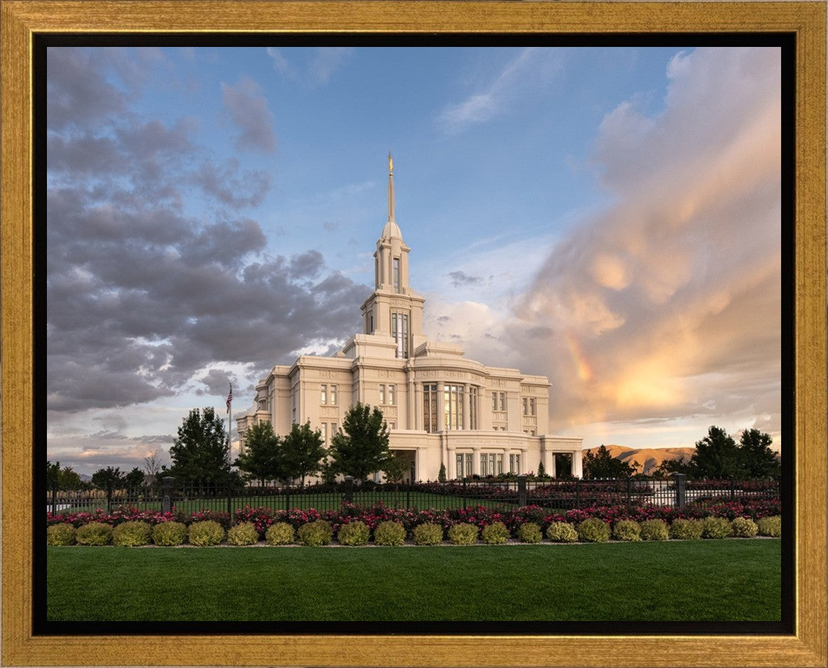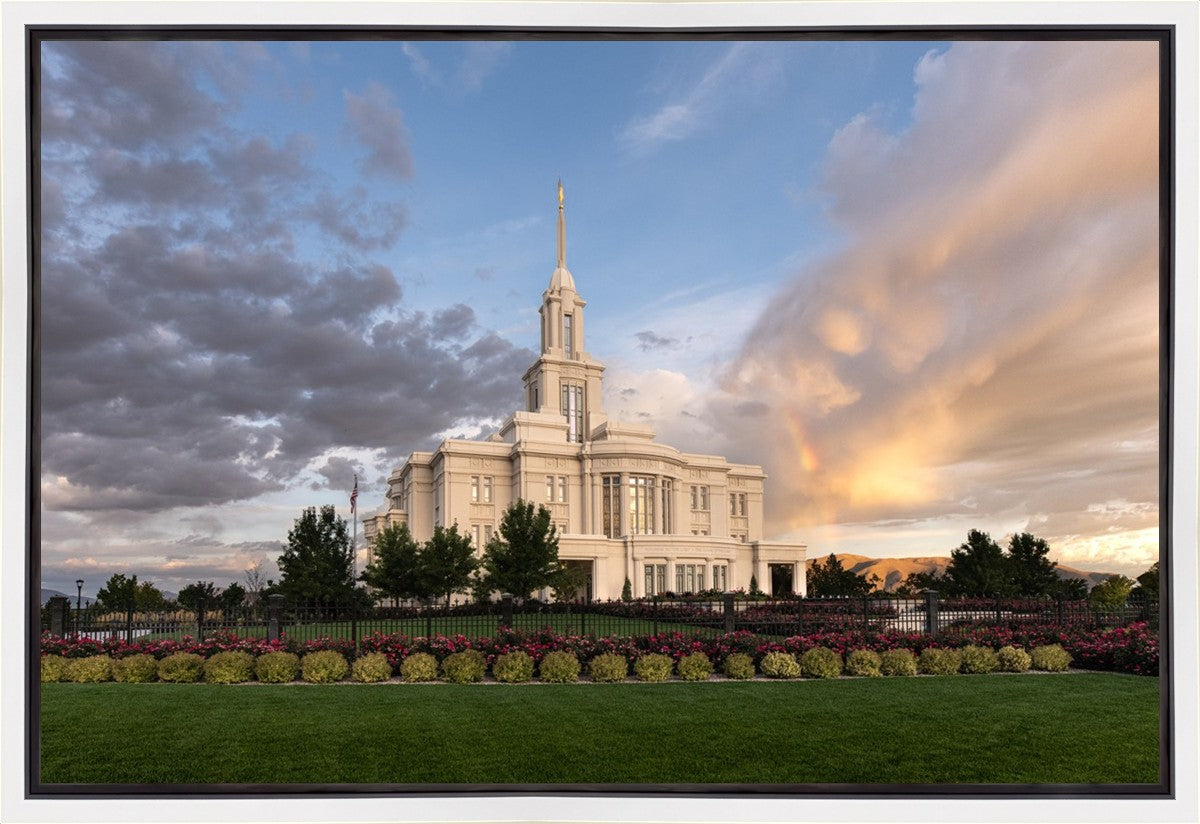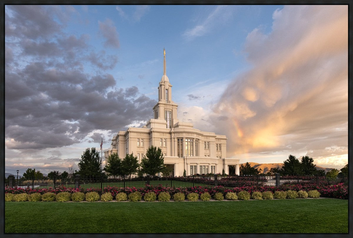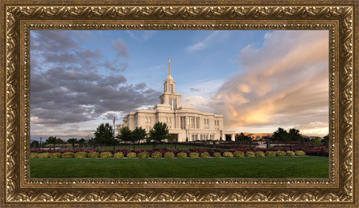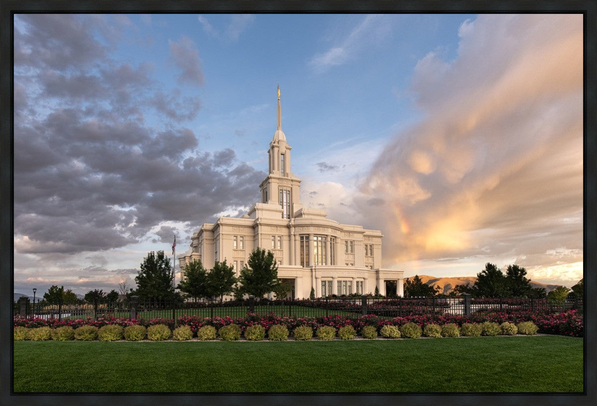 Because of the shadow from the mountains, I was able to capture this unique sunrise picture of the Payson Utah Temple with a hint of a rainbow.