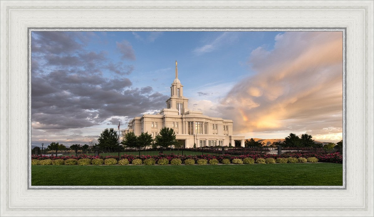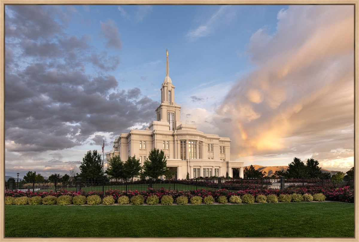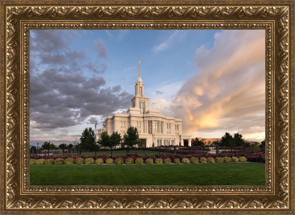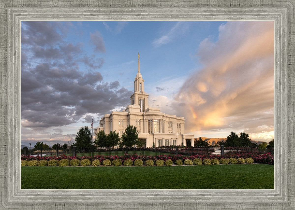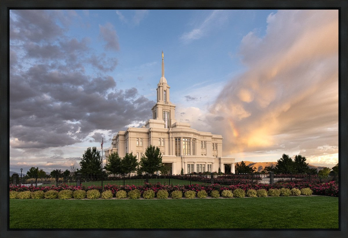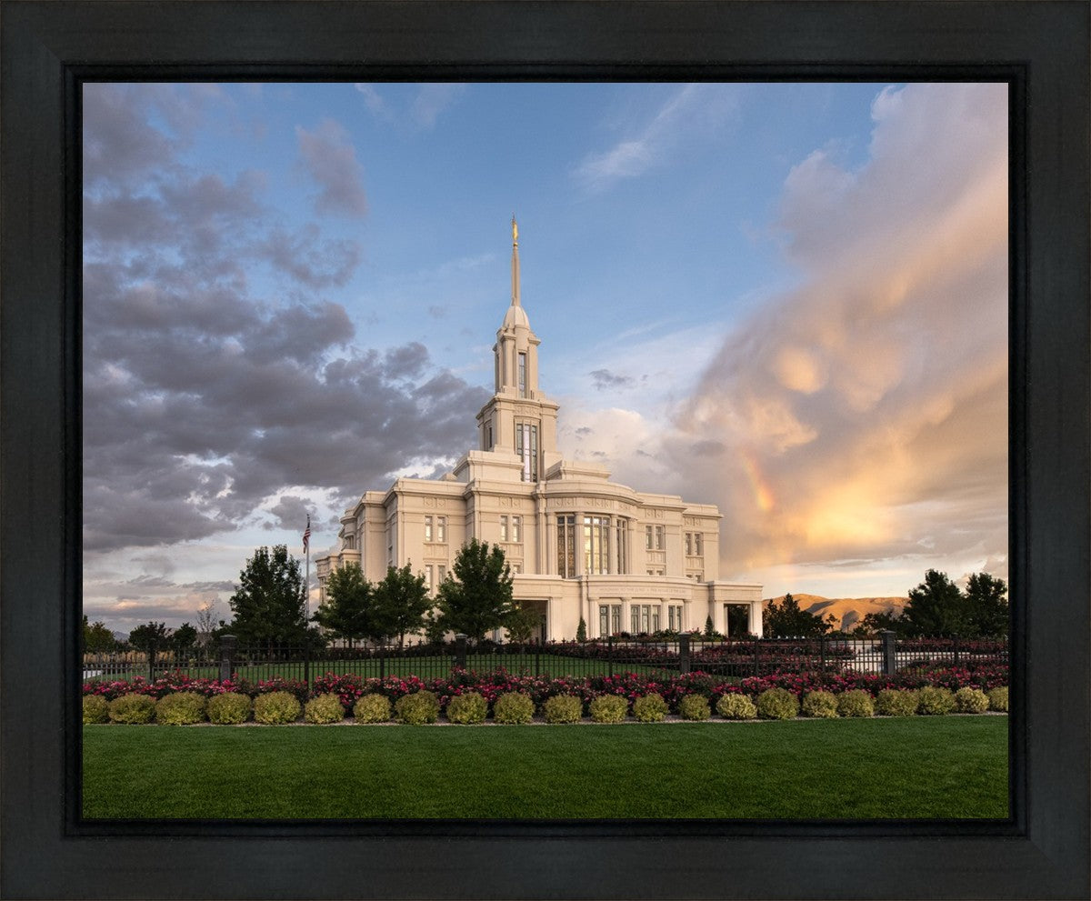 Because of the shadow from the mountains, I was able to capture this unique sunrise picture of the Payson Utah Temple with a hint of a rainbow.