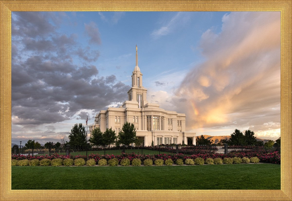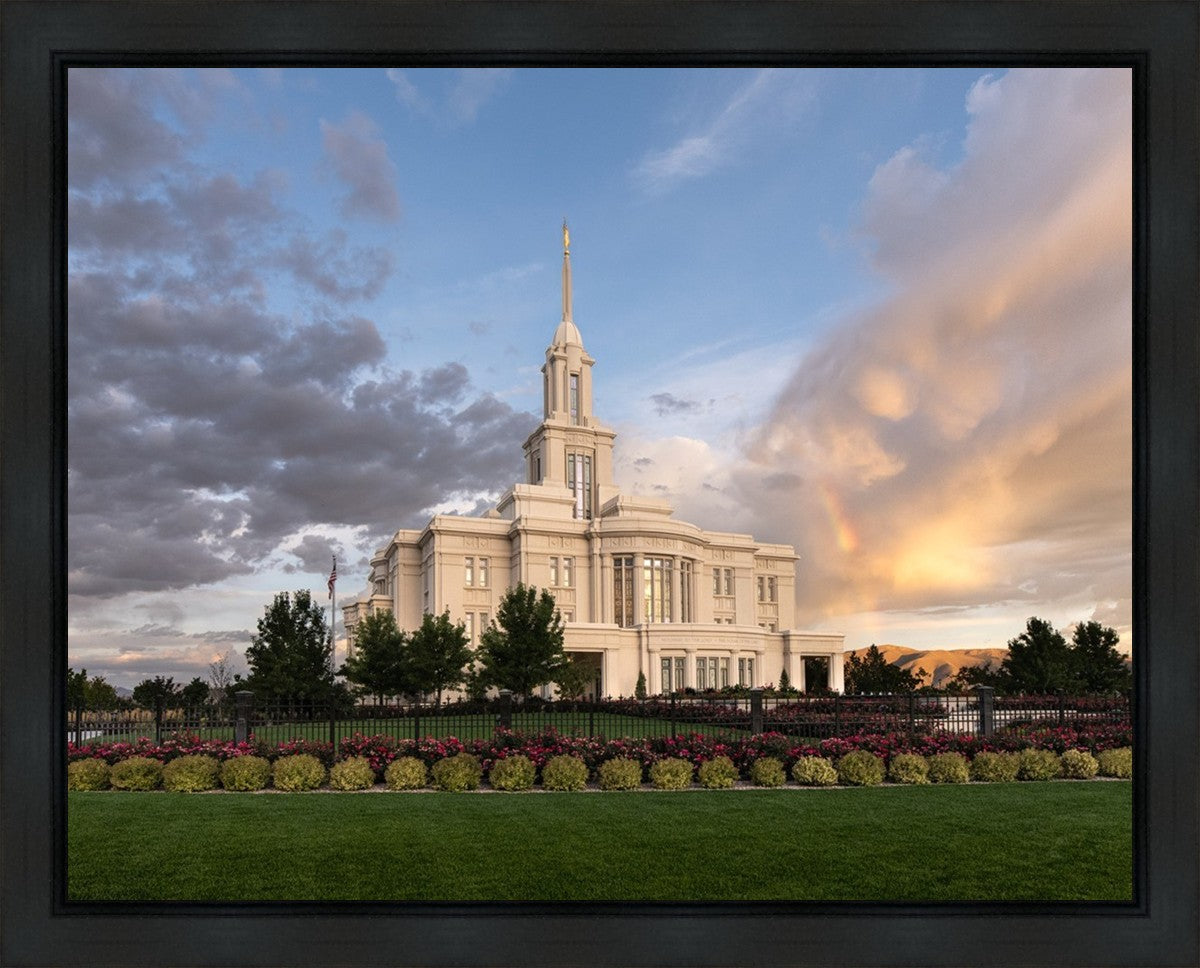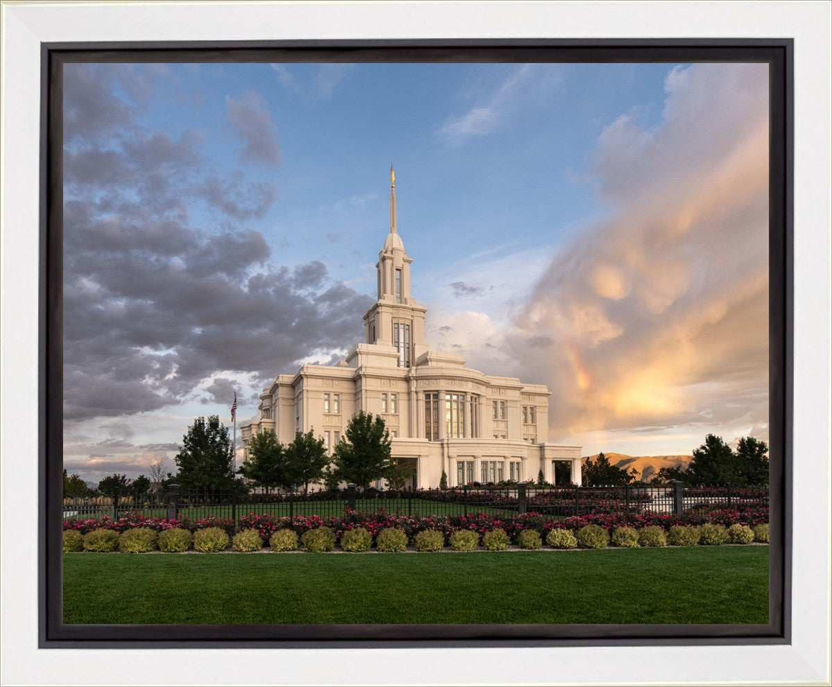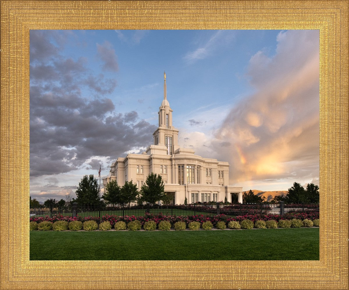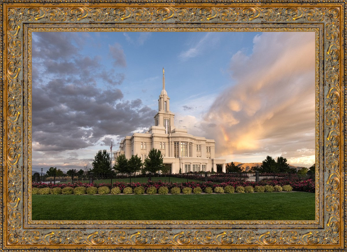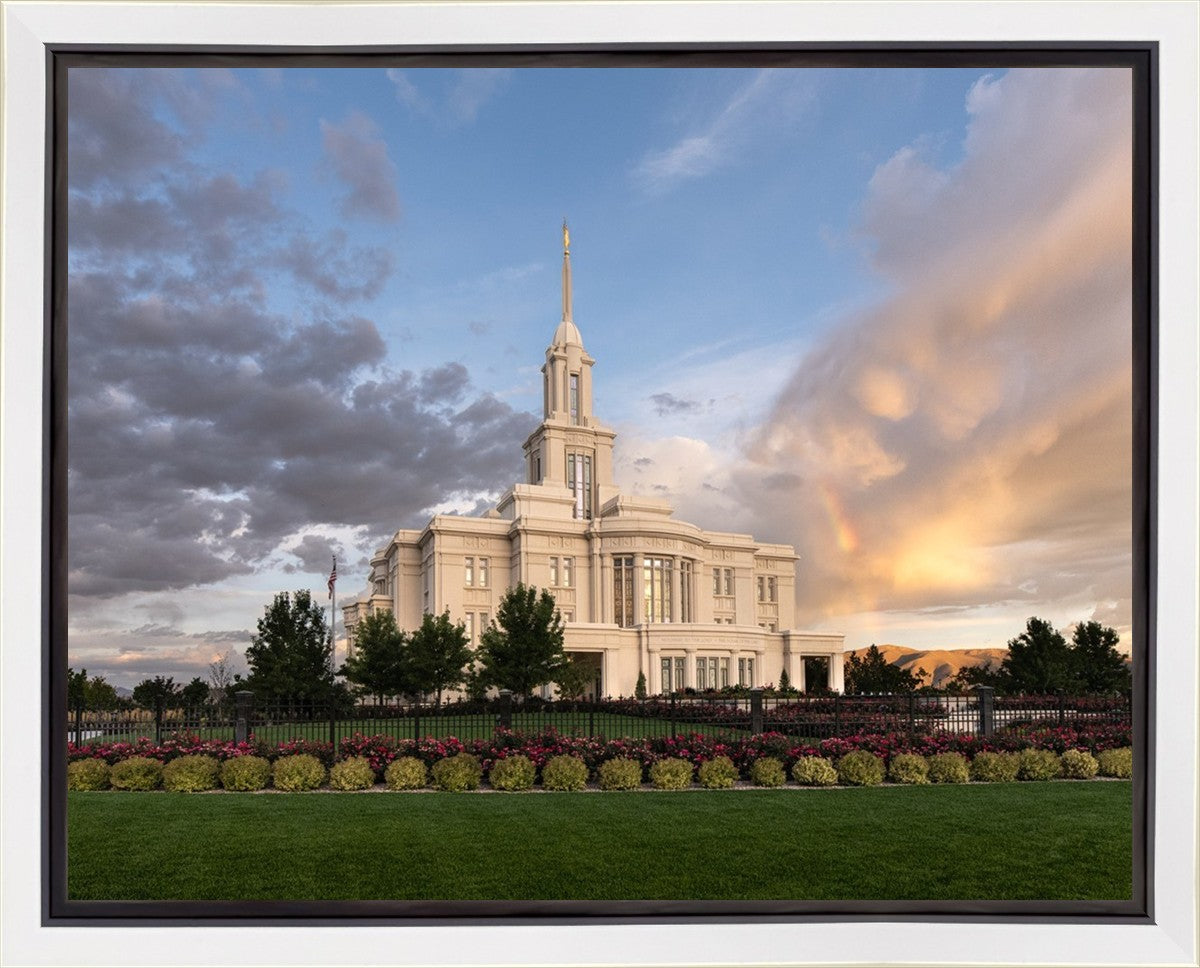 Because of the shadow from the mountains, I was able to capture this unique sunrise picture of the Payson Utah Temple with a hint of a rainbow.