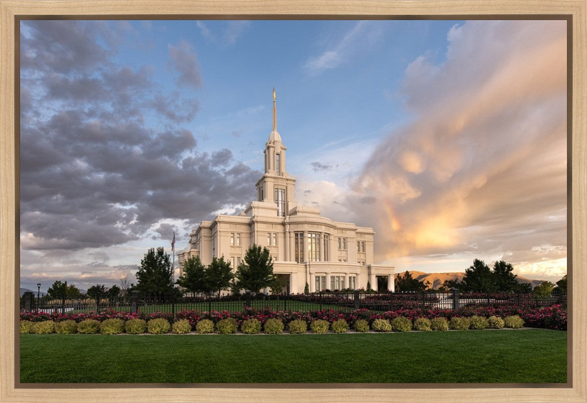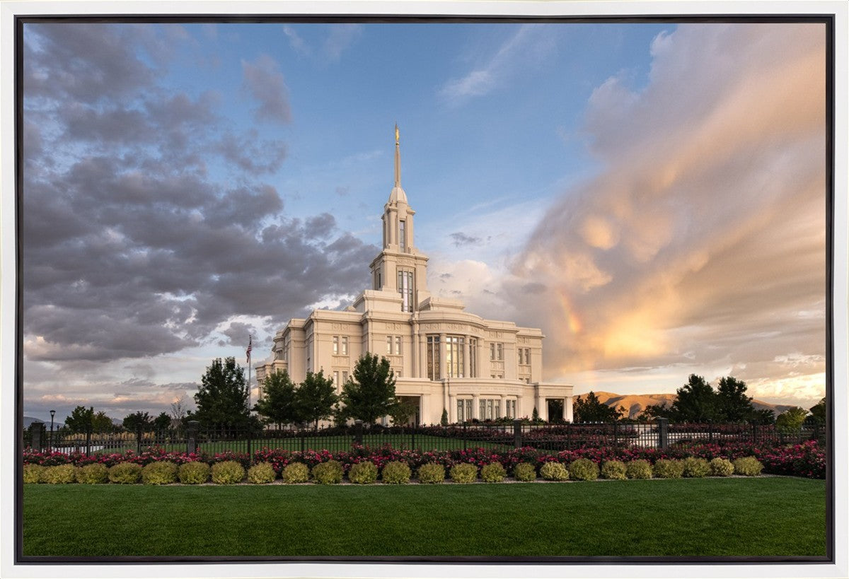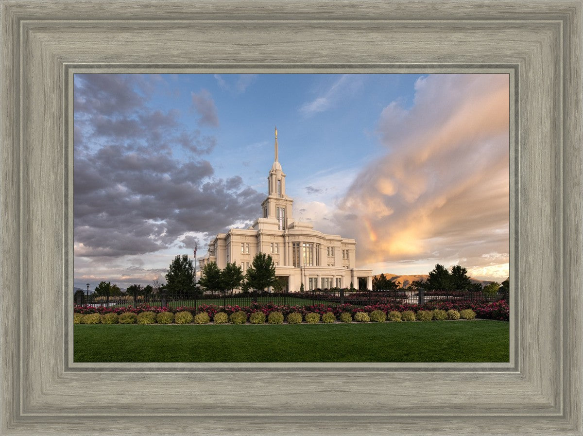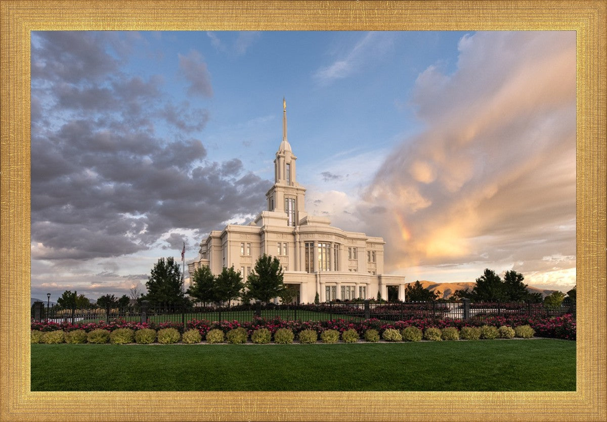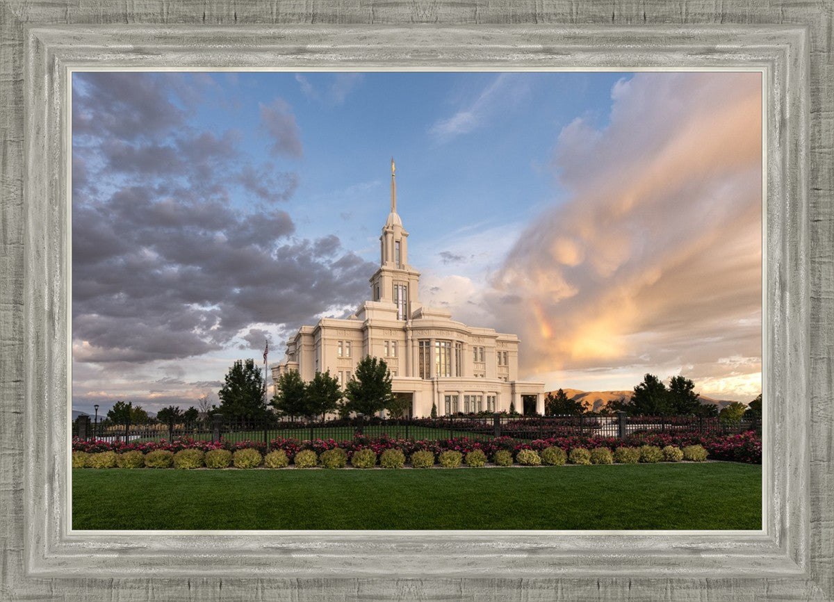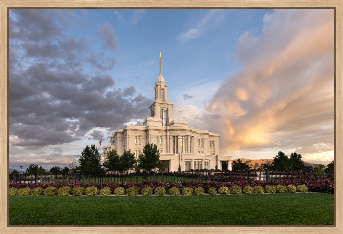 Because of the shadow from the mountains, I was able to capture this unique sunrise picture of the Payson Utah Temple with a hint of a rainbow.