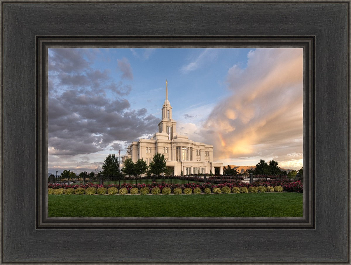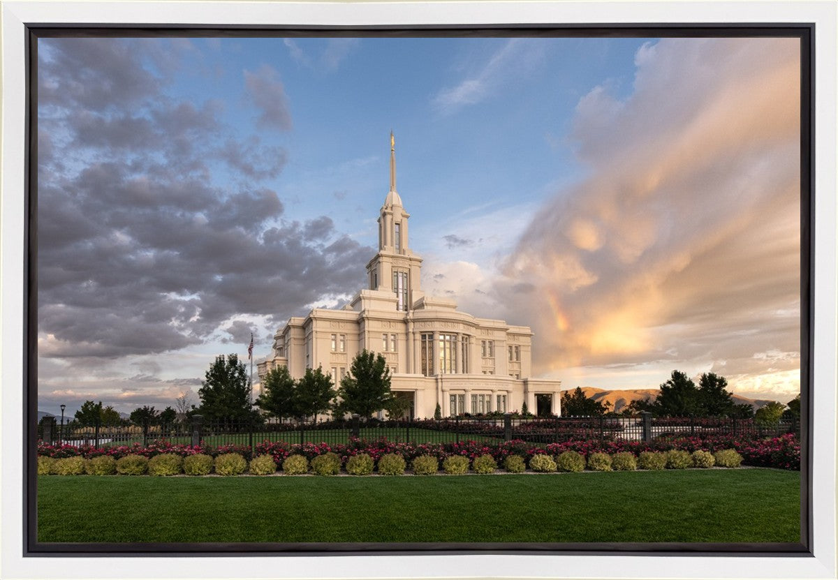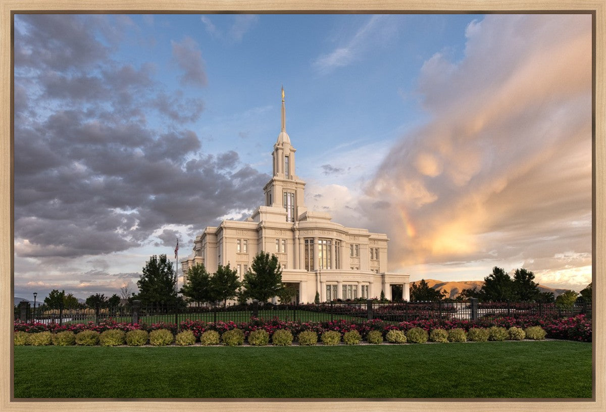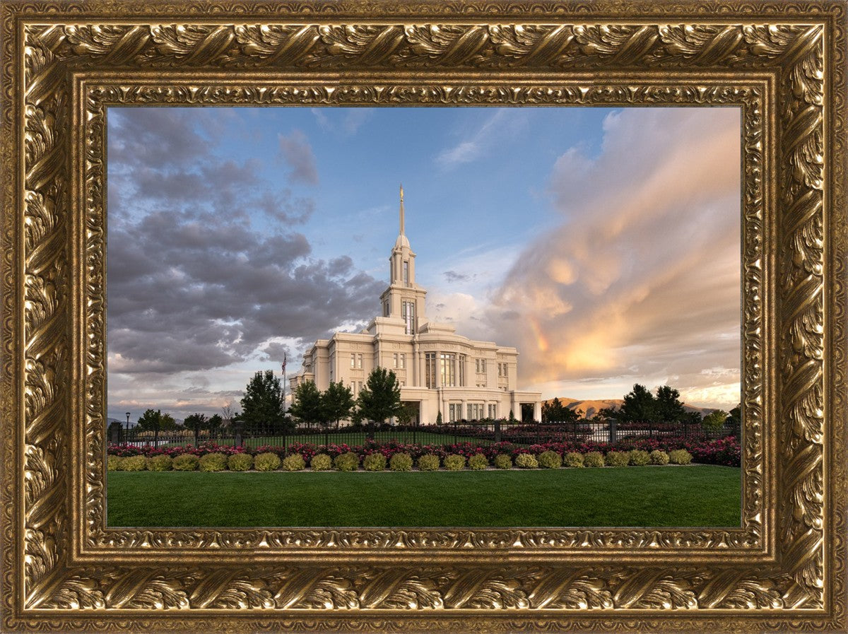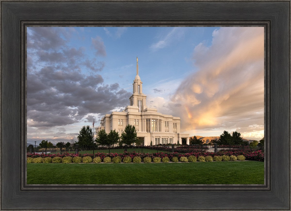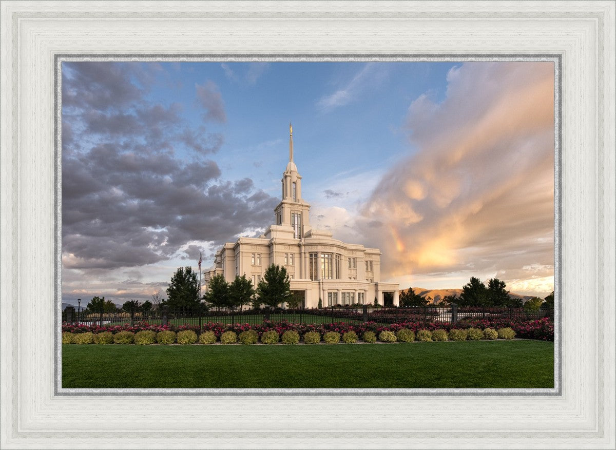 Because of the shadow from the mountains, I was able to capture this unique sunrise picture of the Payson Utah Temple with a hint of a rainbow.