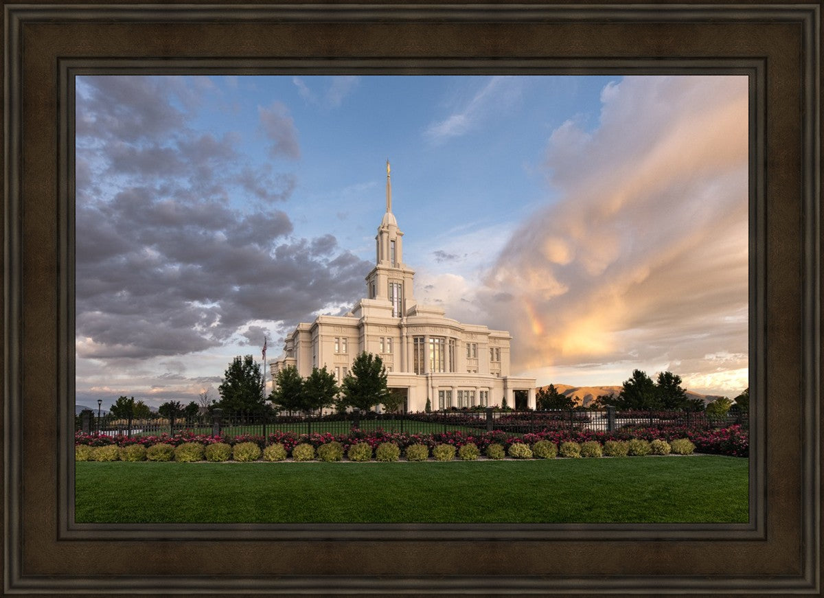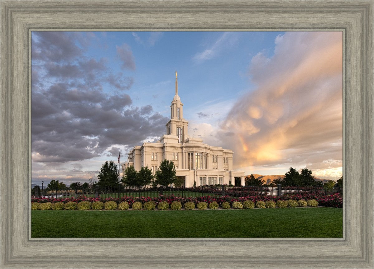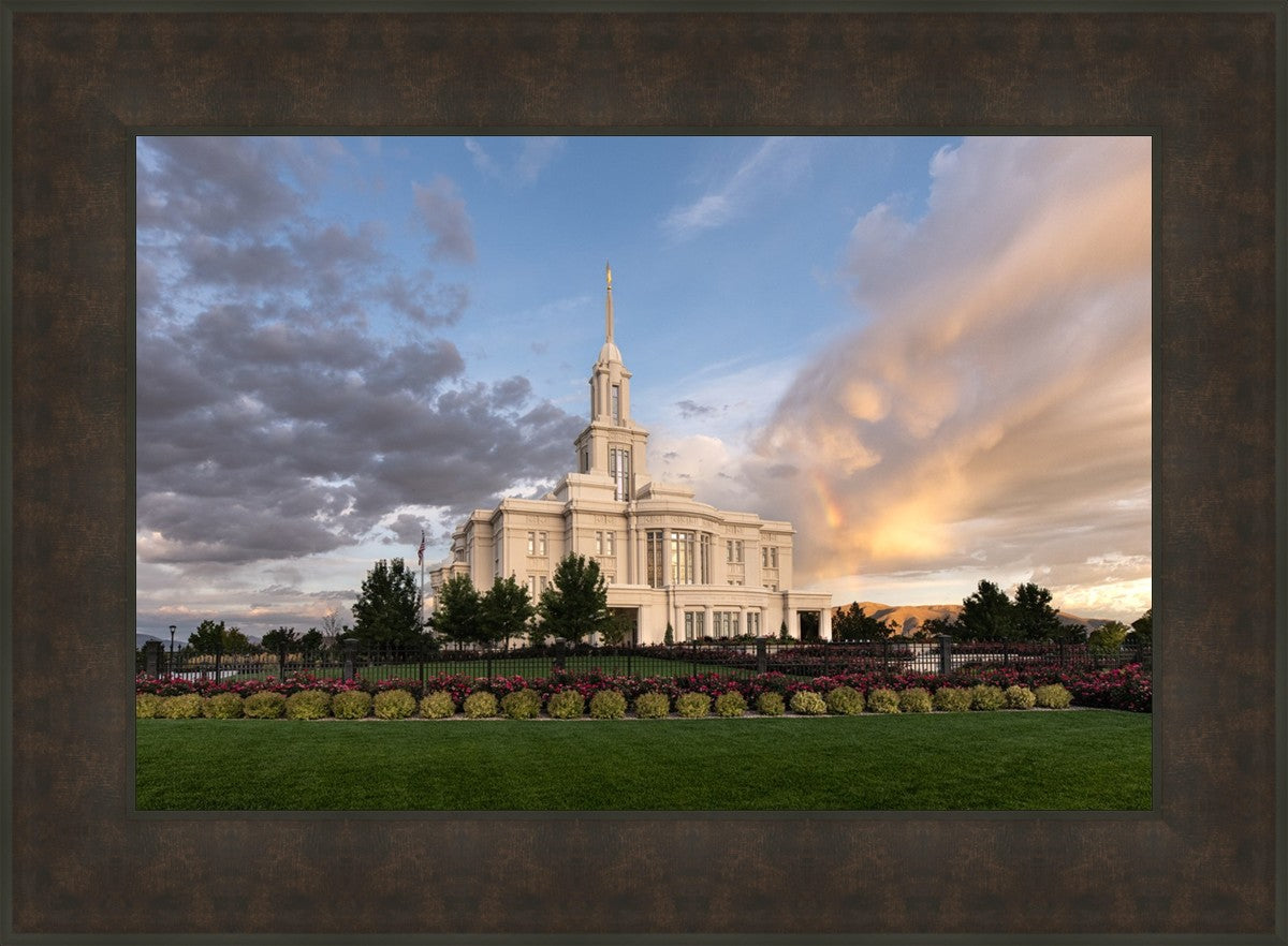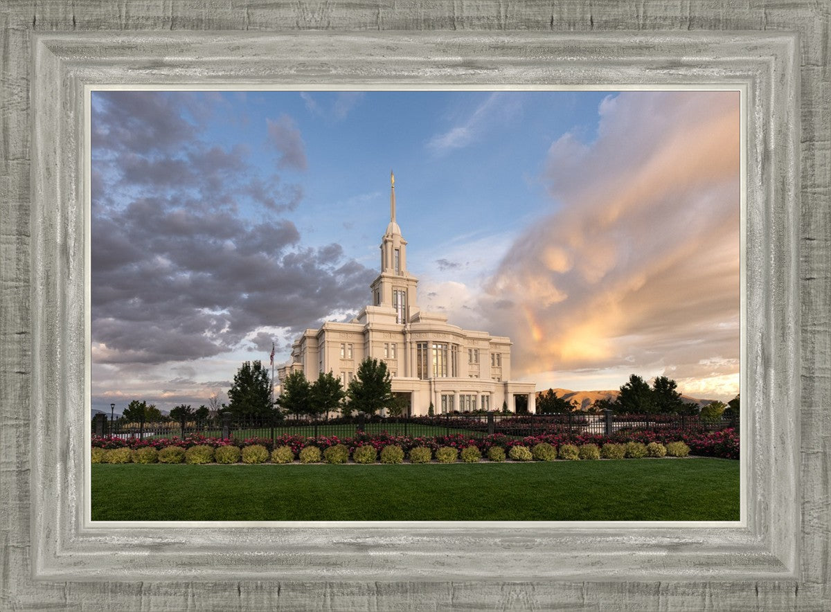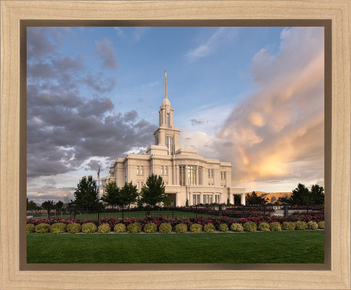Because of the shadow from the mountains, I was able to capture this unique sunrise picture of the Payson Utah Temple with a hint of a rainbow.