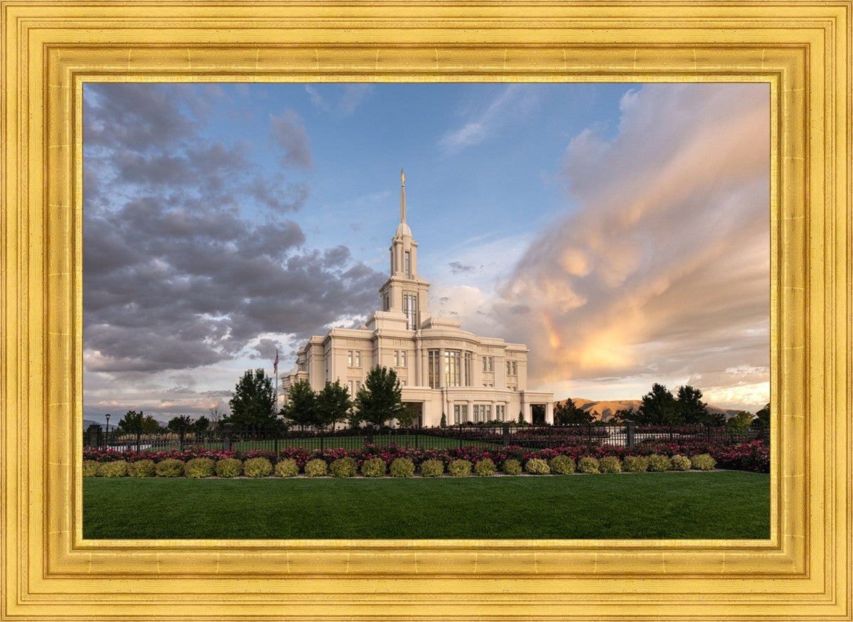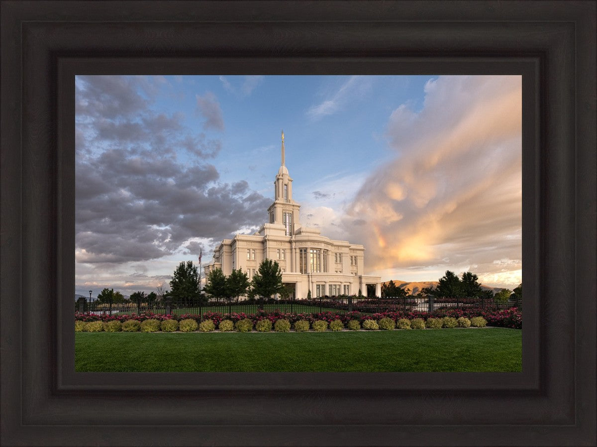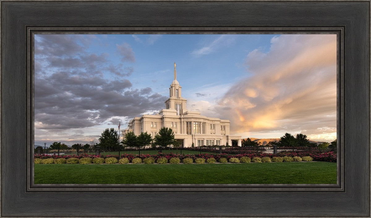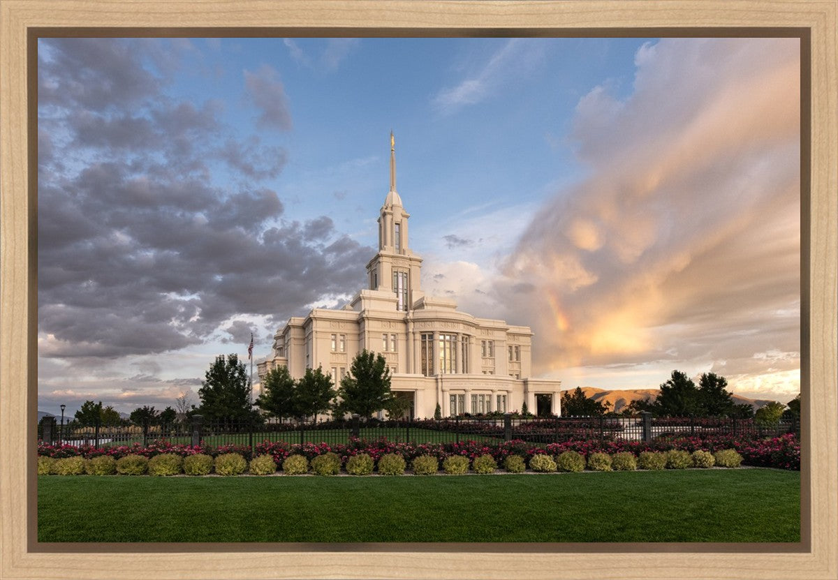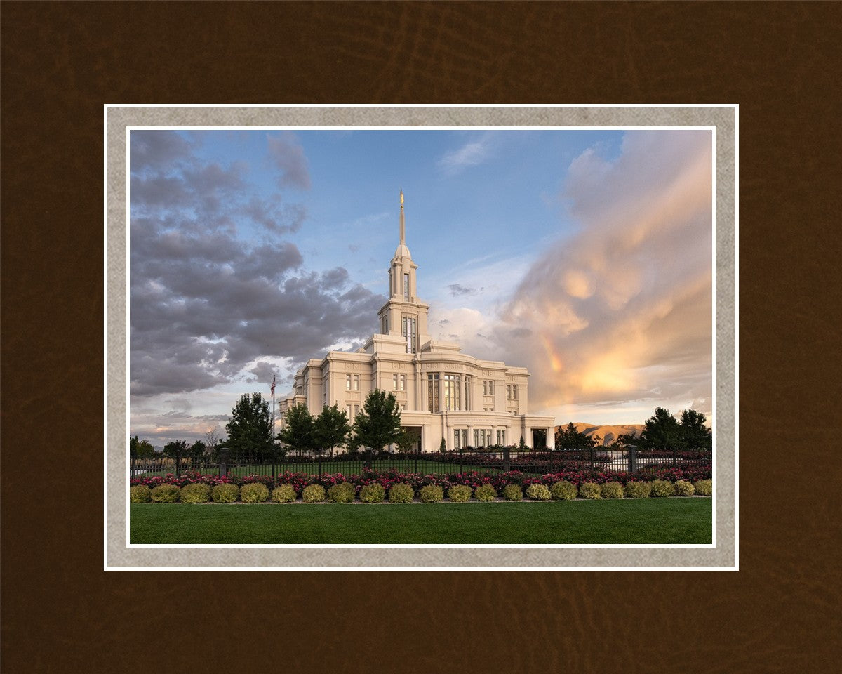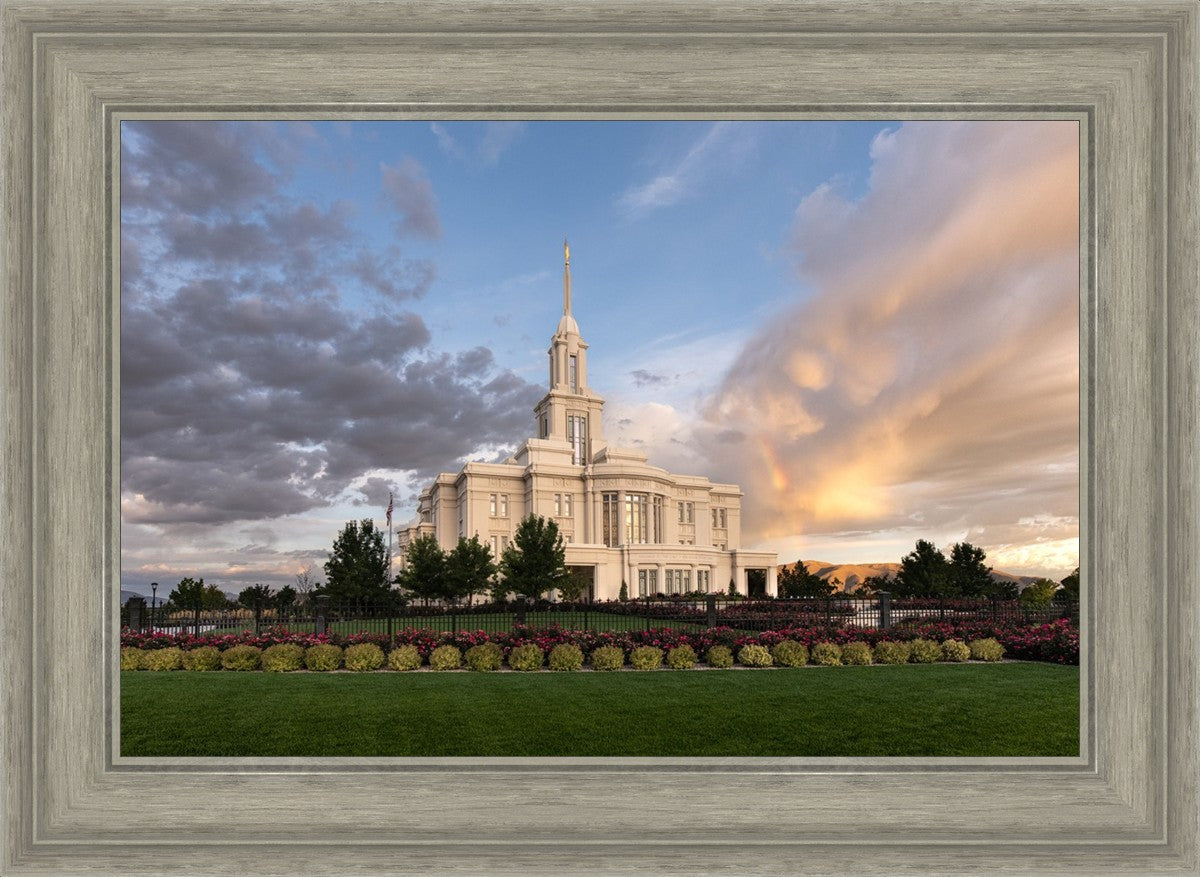 Because of the shadow from the mountains, I was able to capture this unique sunrise picture of the Payson Utah Temple with a hint of a rainbow.