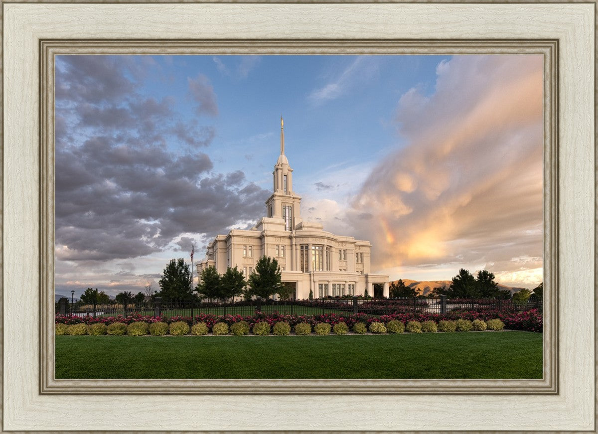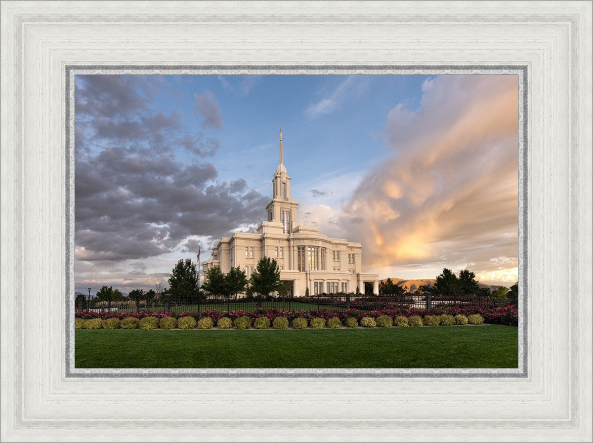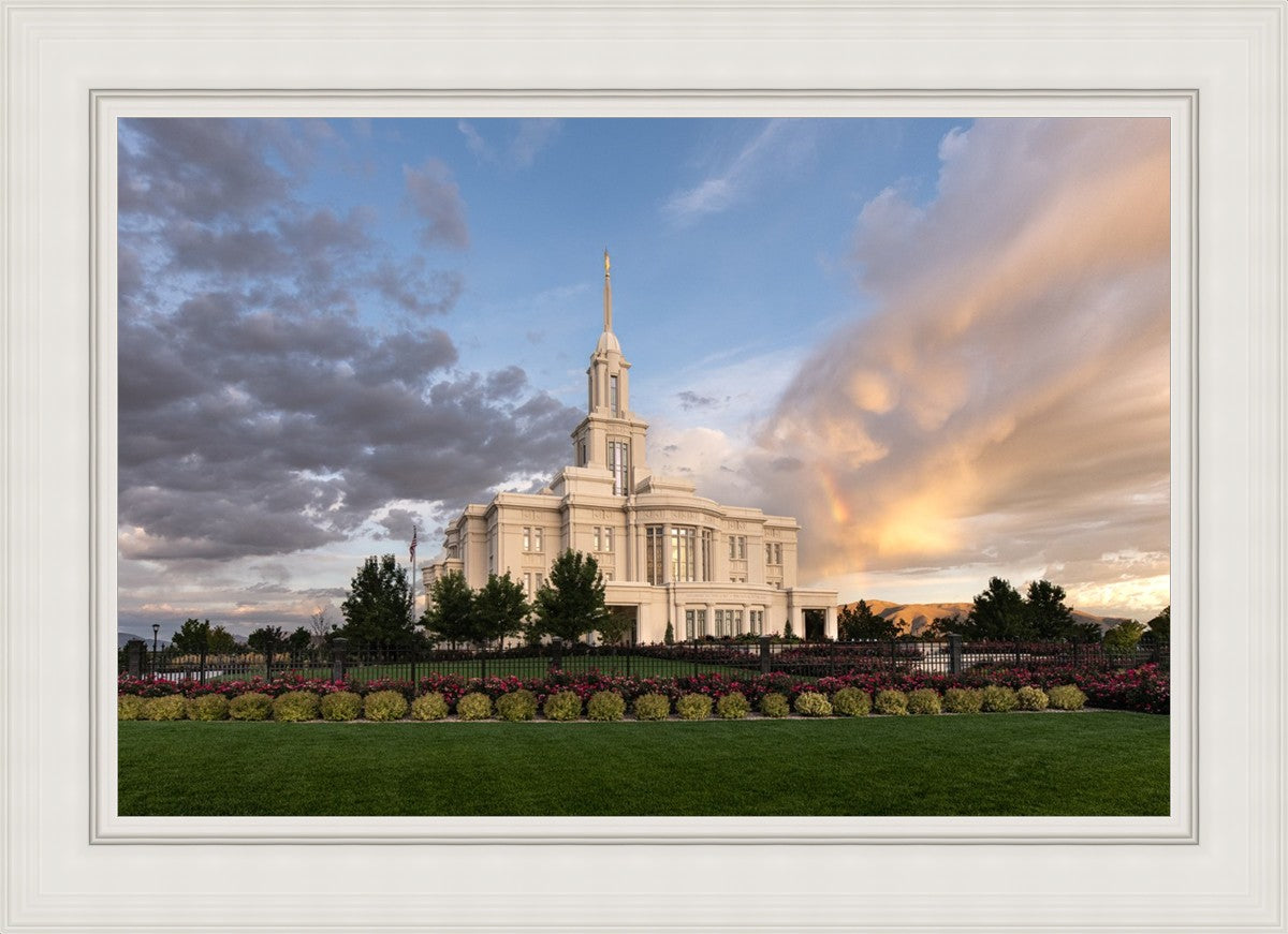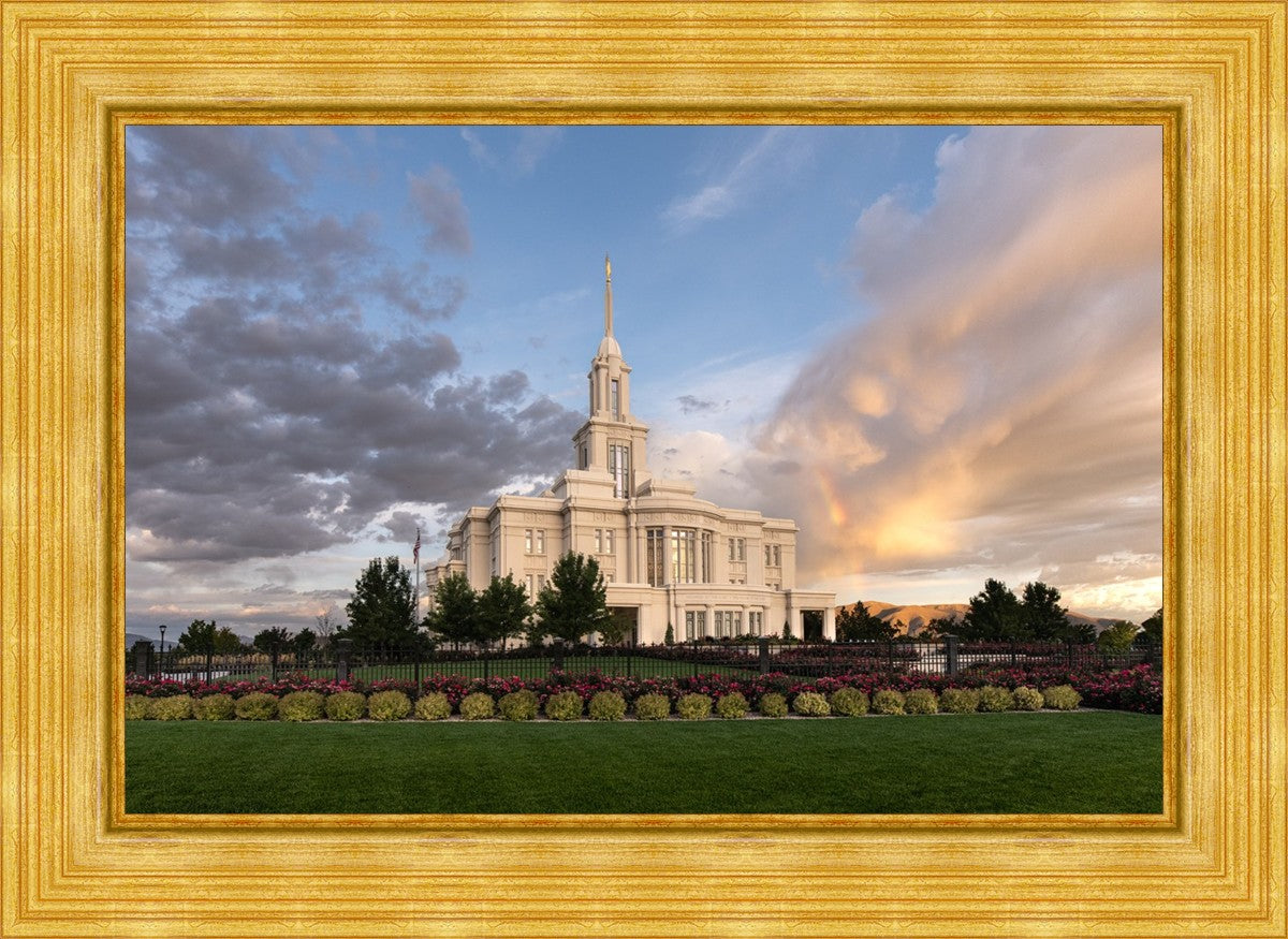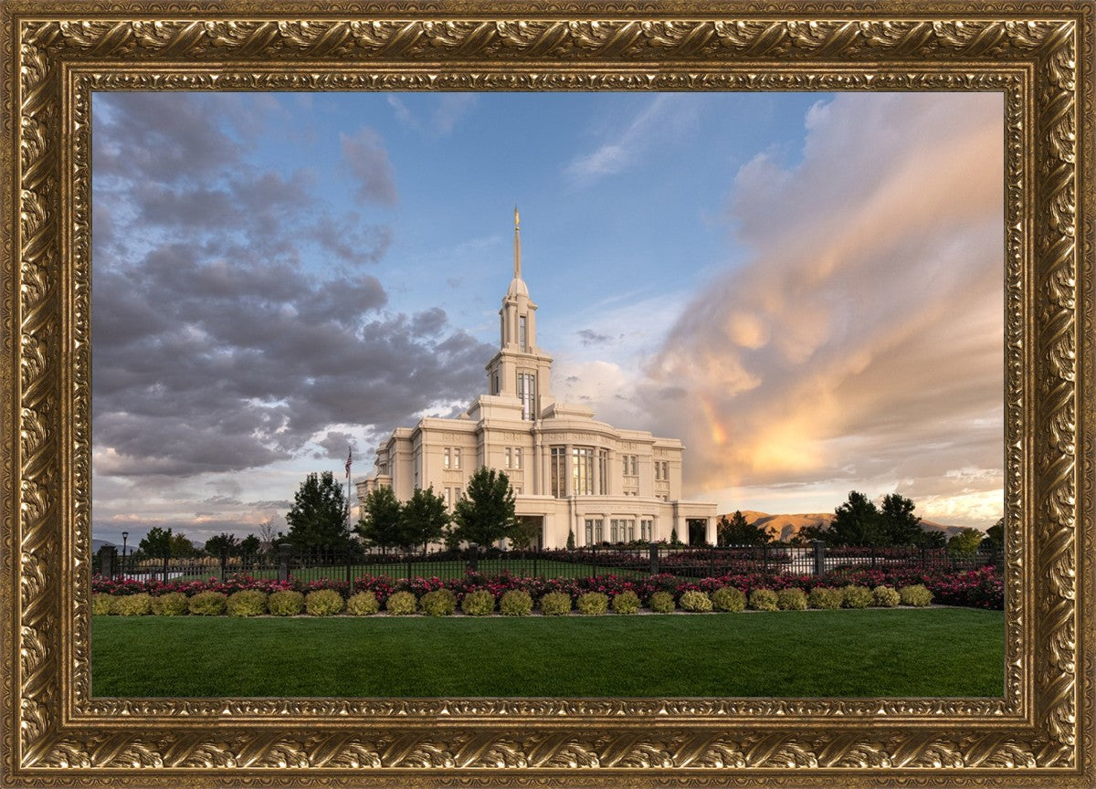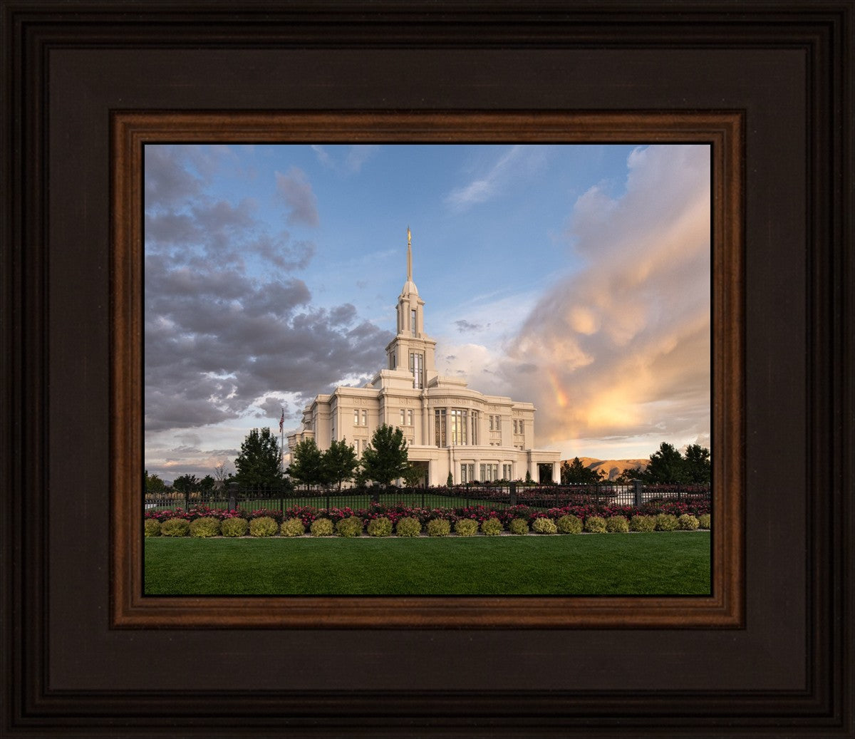 Because of the shadow from the mountains, I was able to capture this unique sunrise picture of the Payson Utah Temple with a hint of a rainbow.