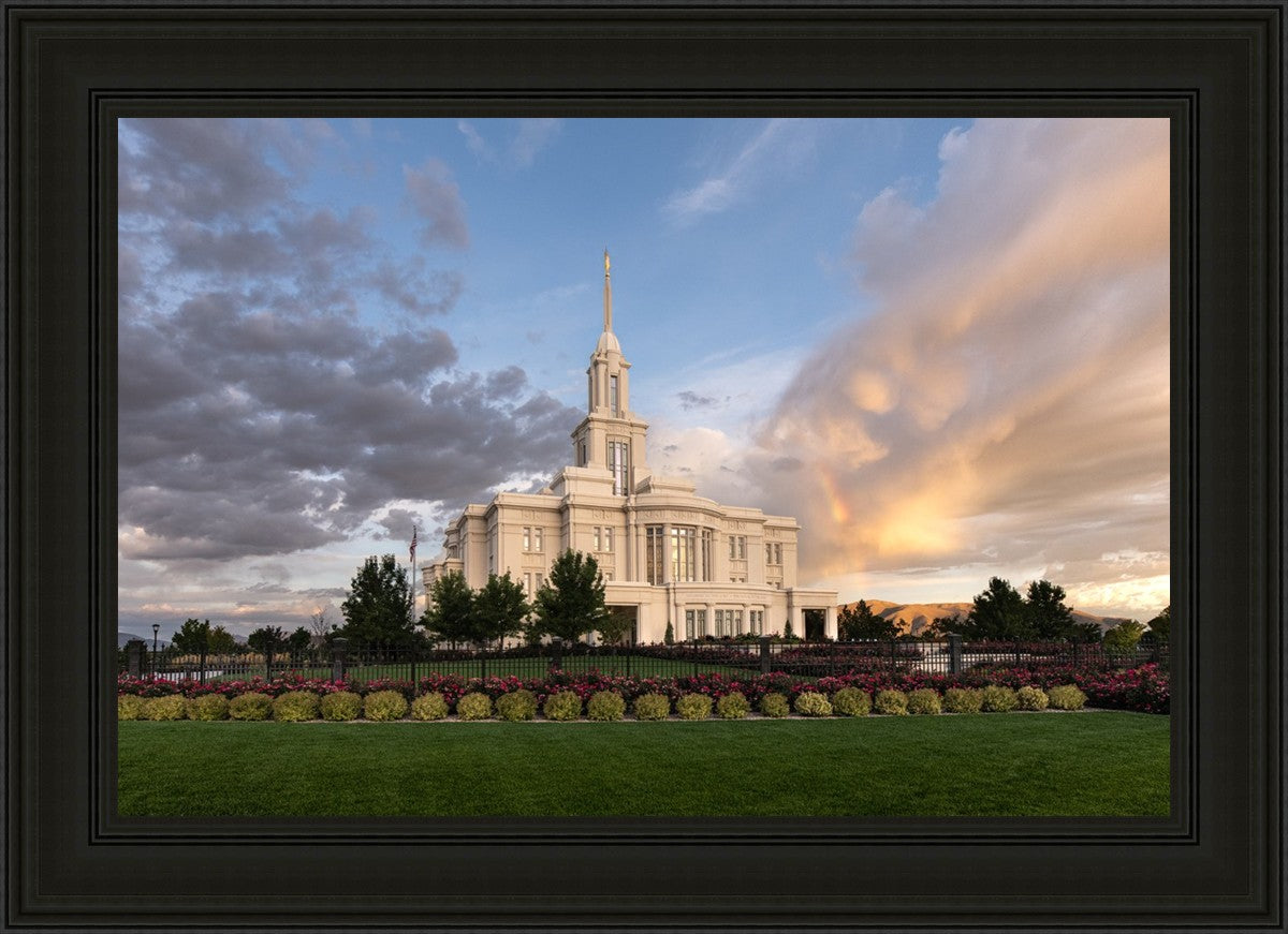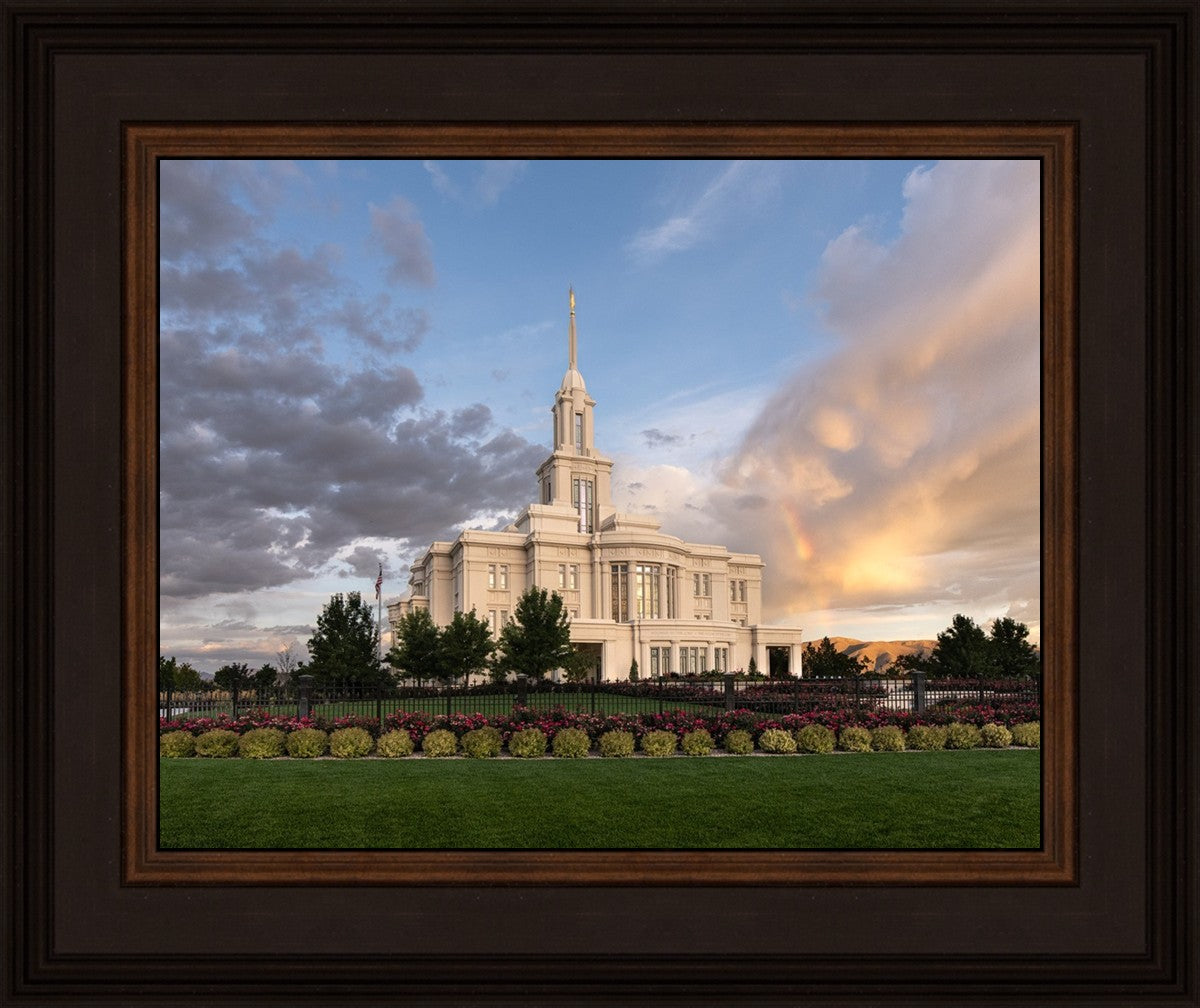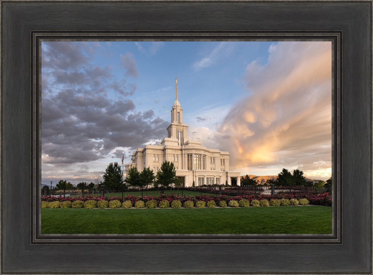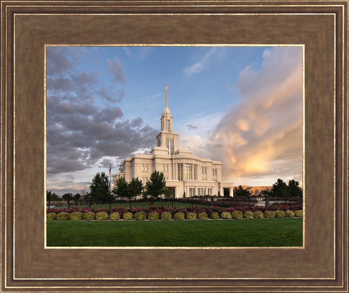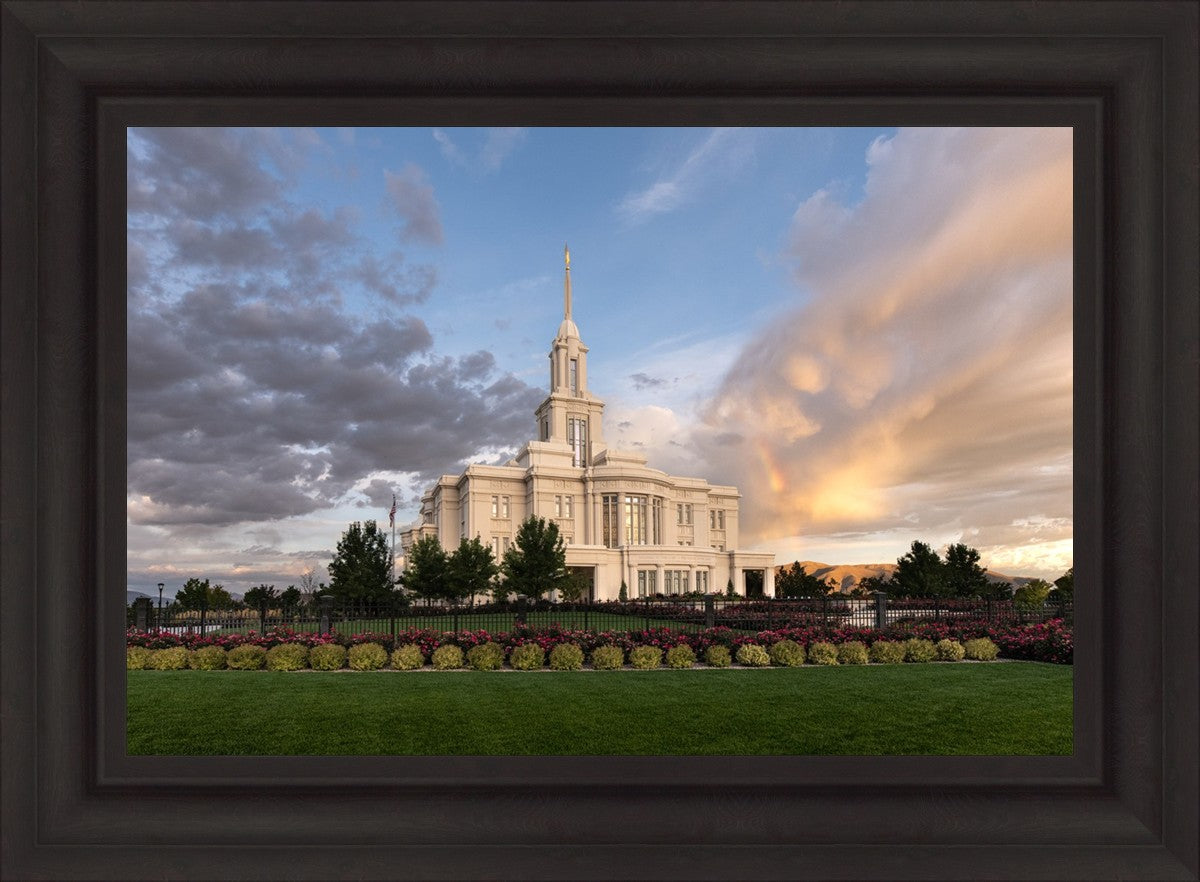 Because of the shadow from the mountains, I was able to capture this unique sunrise picture of the Payson Utah Temple with a hint of a rainbow.