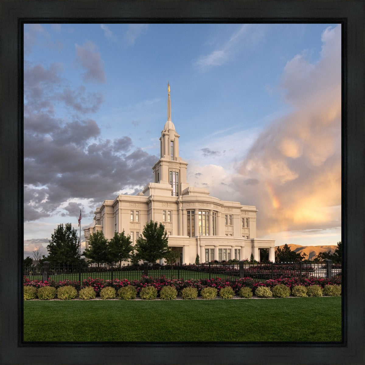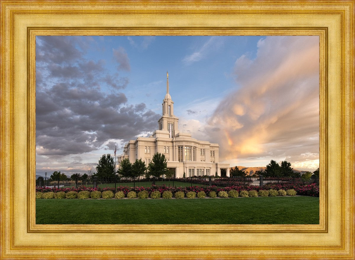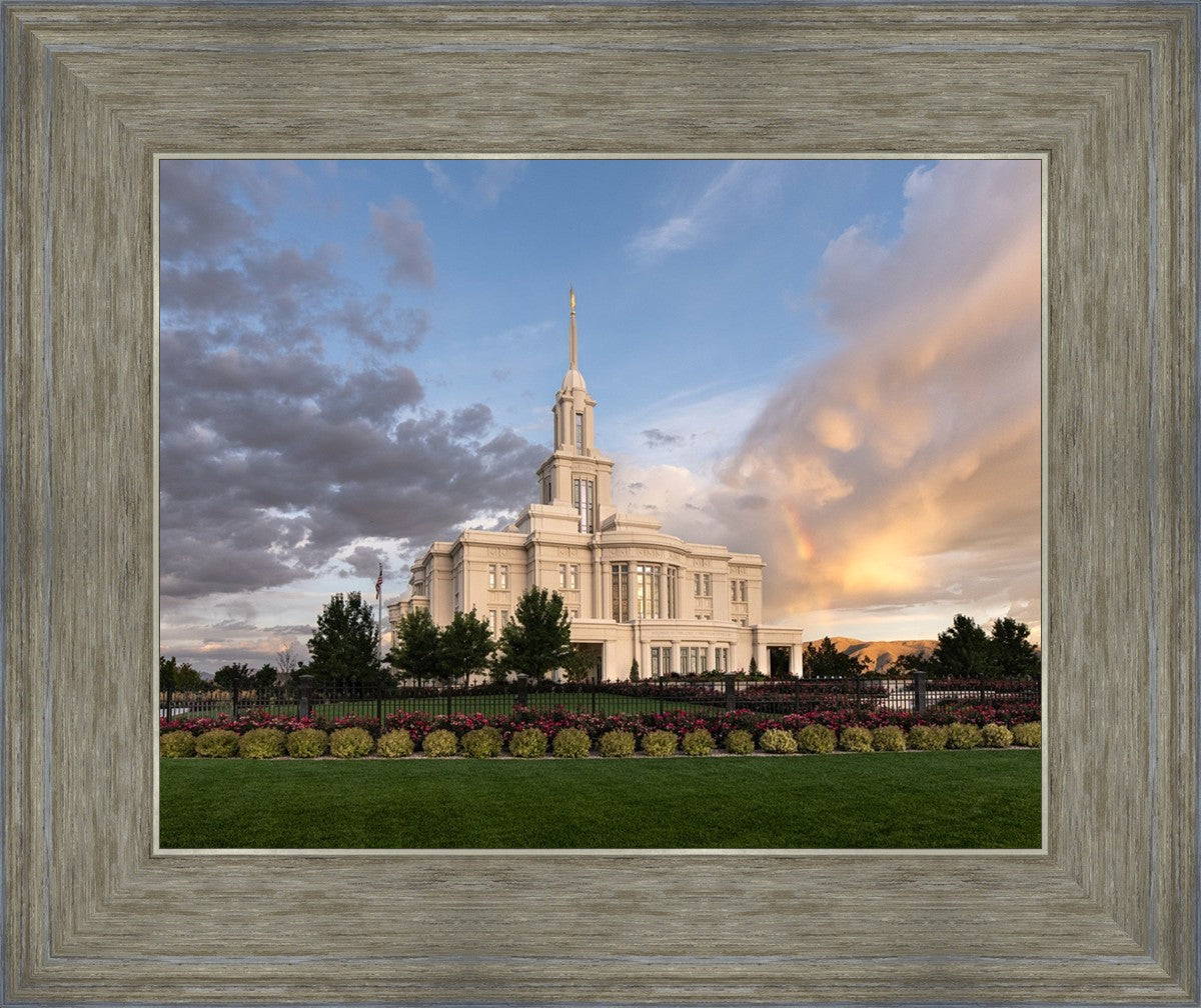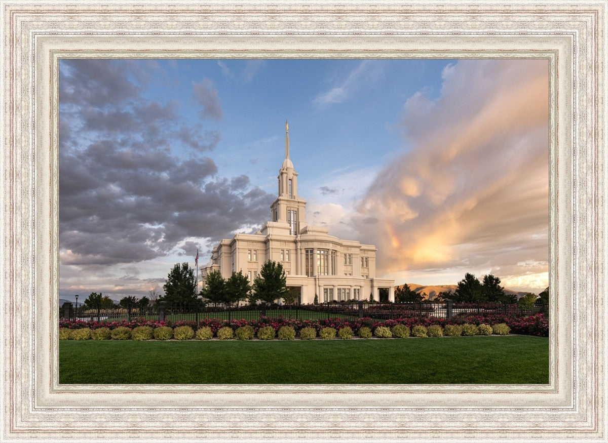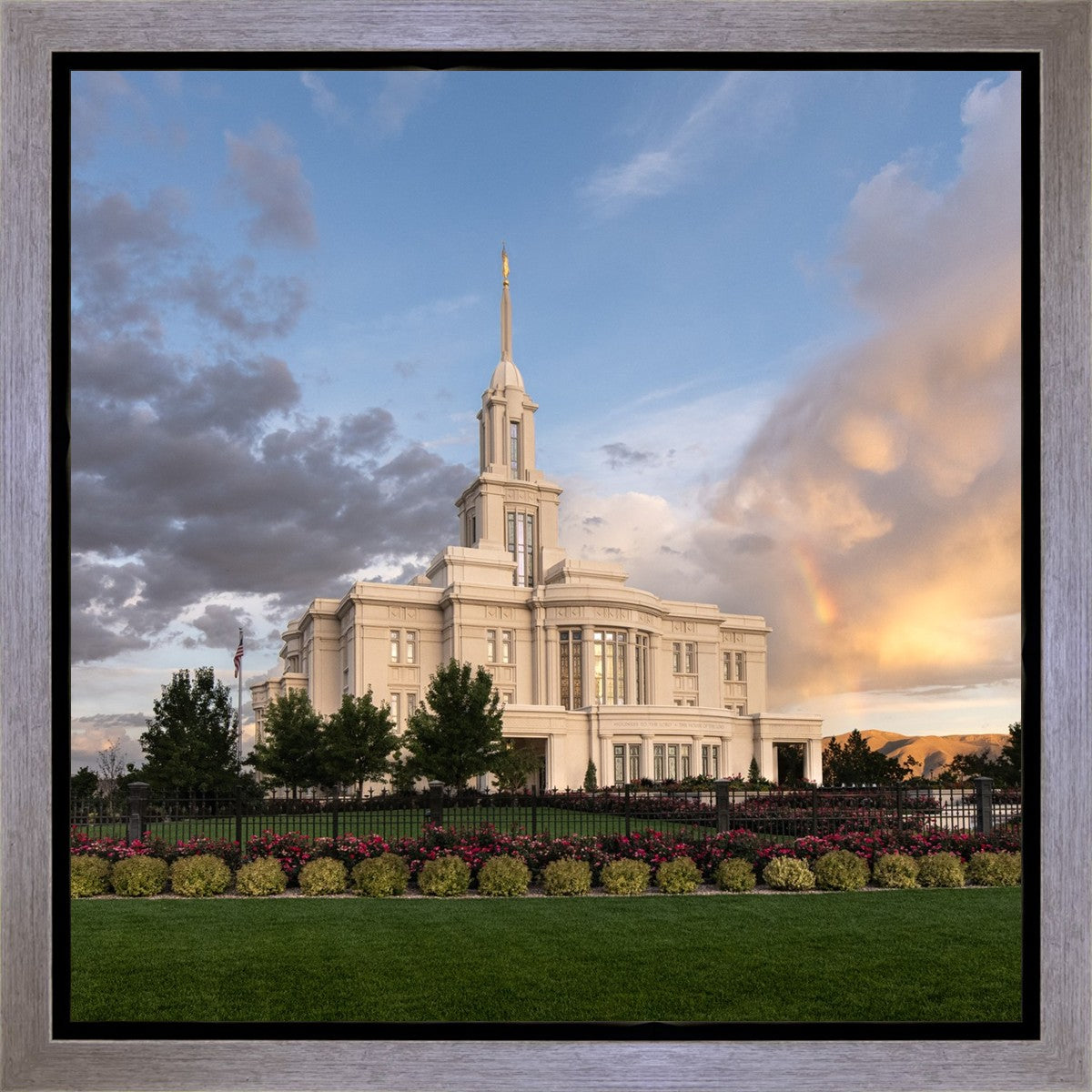 Because of the shadow from the mountains, I was able to capture this unique sunrise picture of the Payson Utah Temple with a hint of a rainbow.