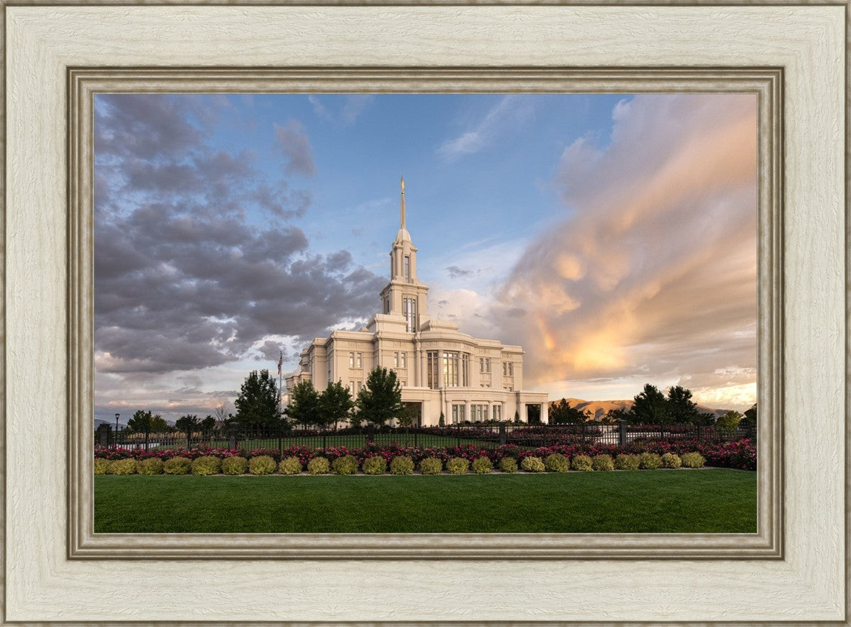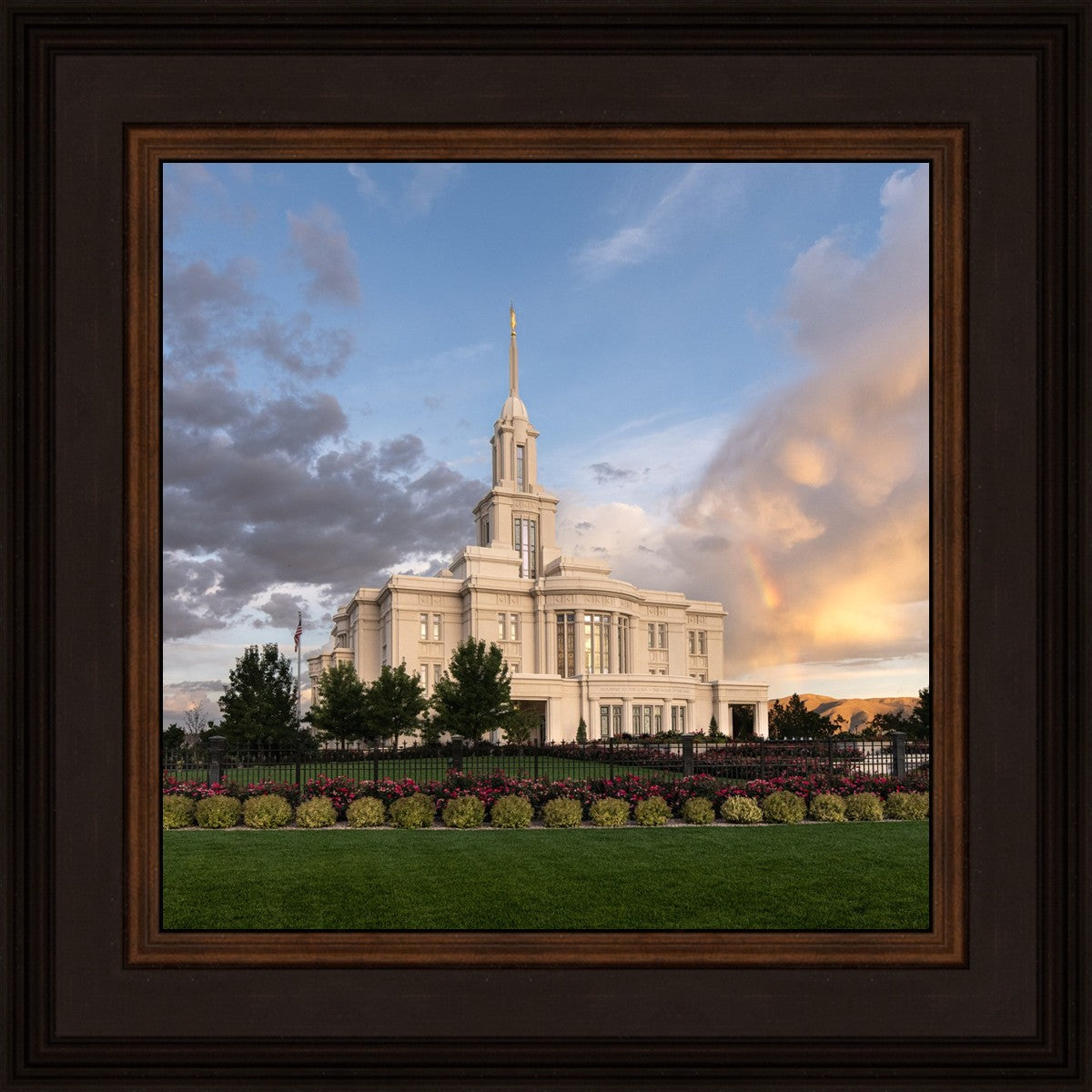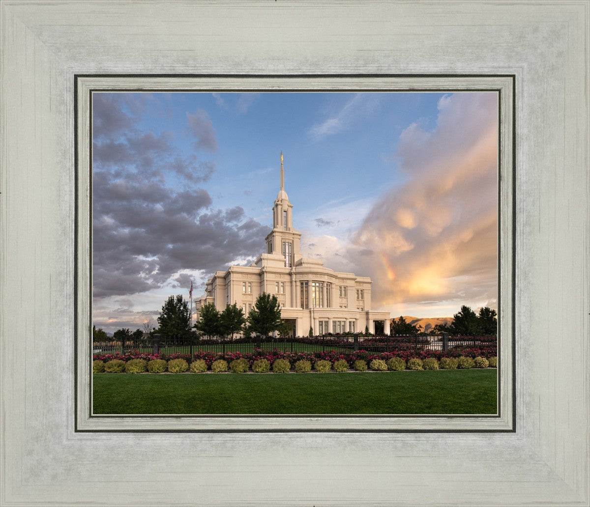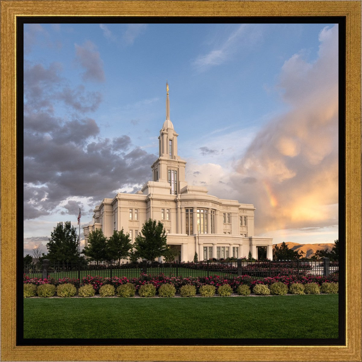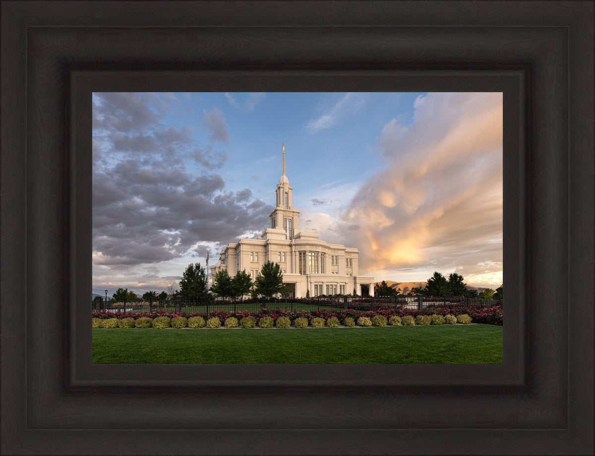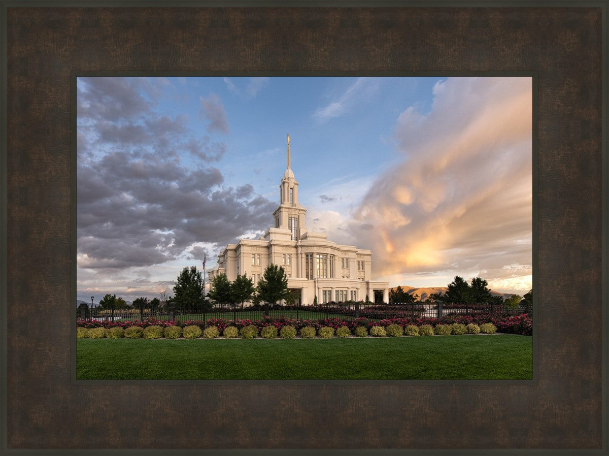 Because of the shadow from the mountains, I was able to capture this unique sunrise picture of the Payson Utah Temple with a hint of a rainbow.