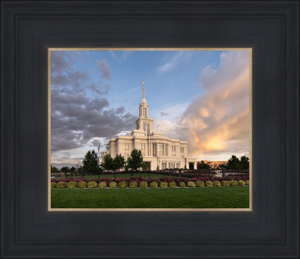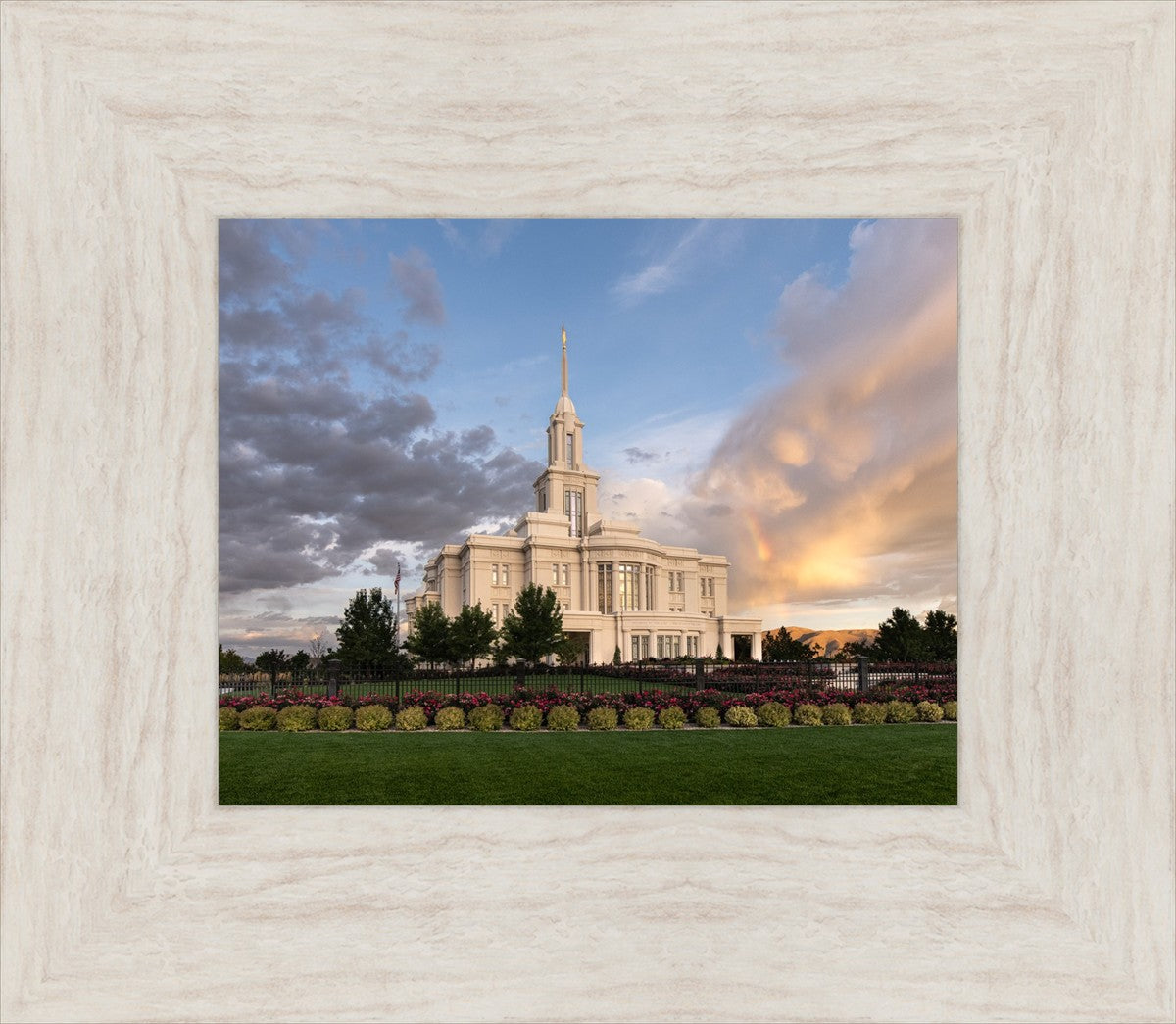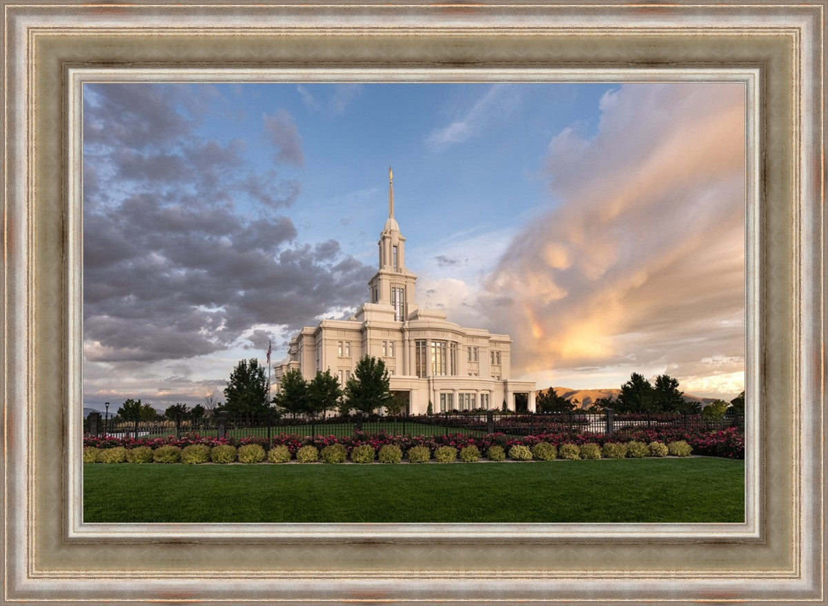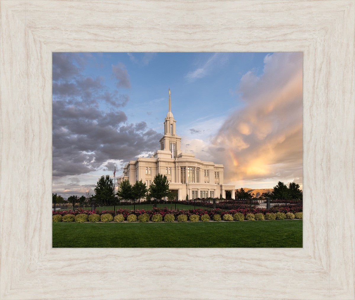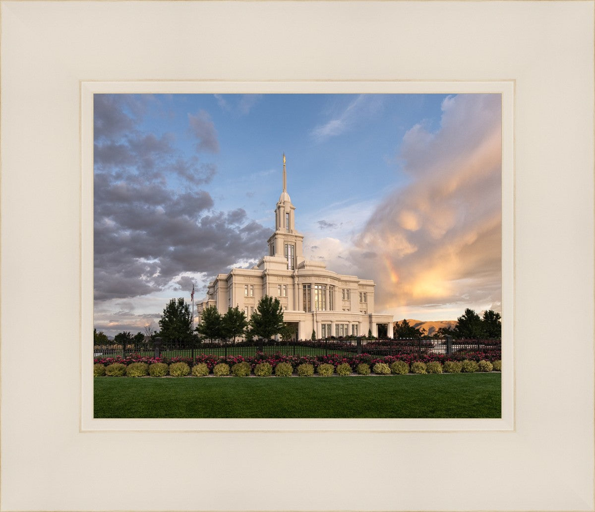 Because of the shadow from the mountains, I was able to capture this unique sunrise picture of the Payson Utah Temple with a hint of a rainbow.