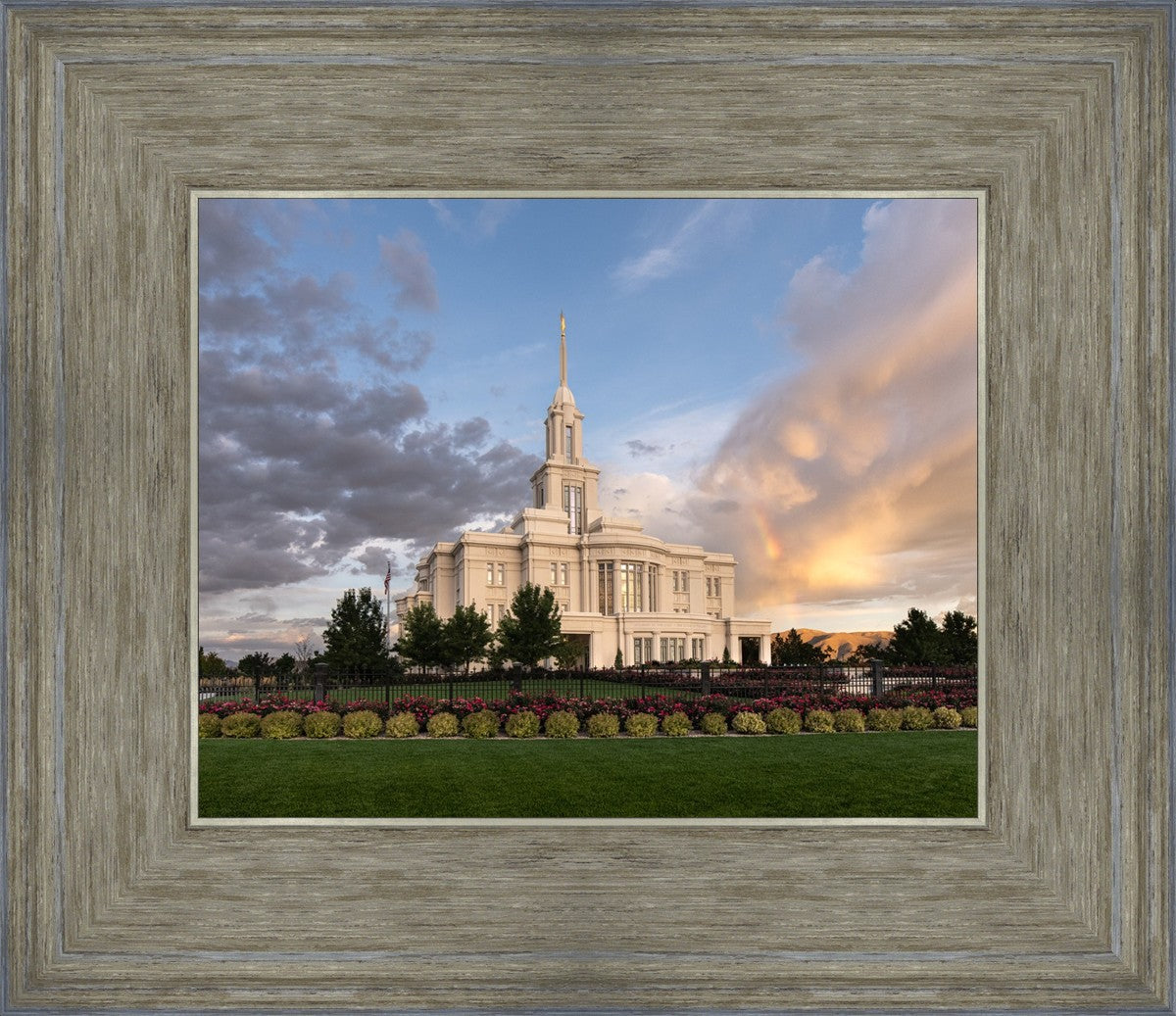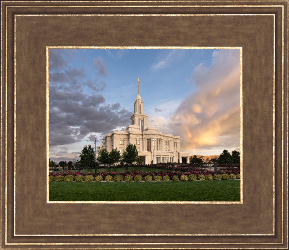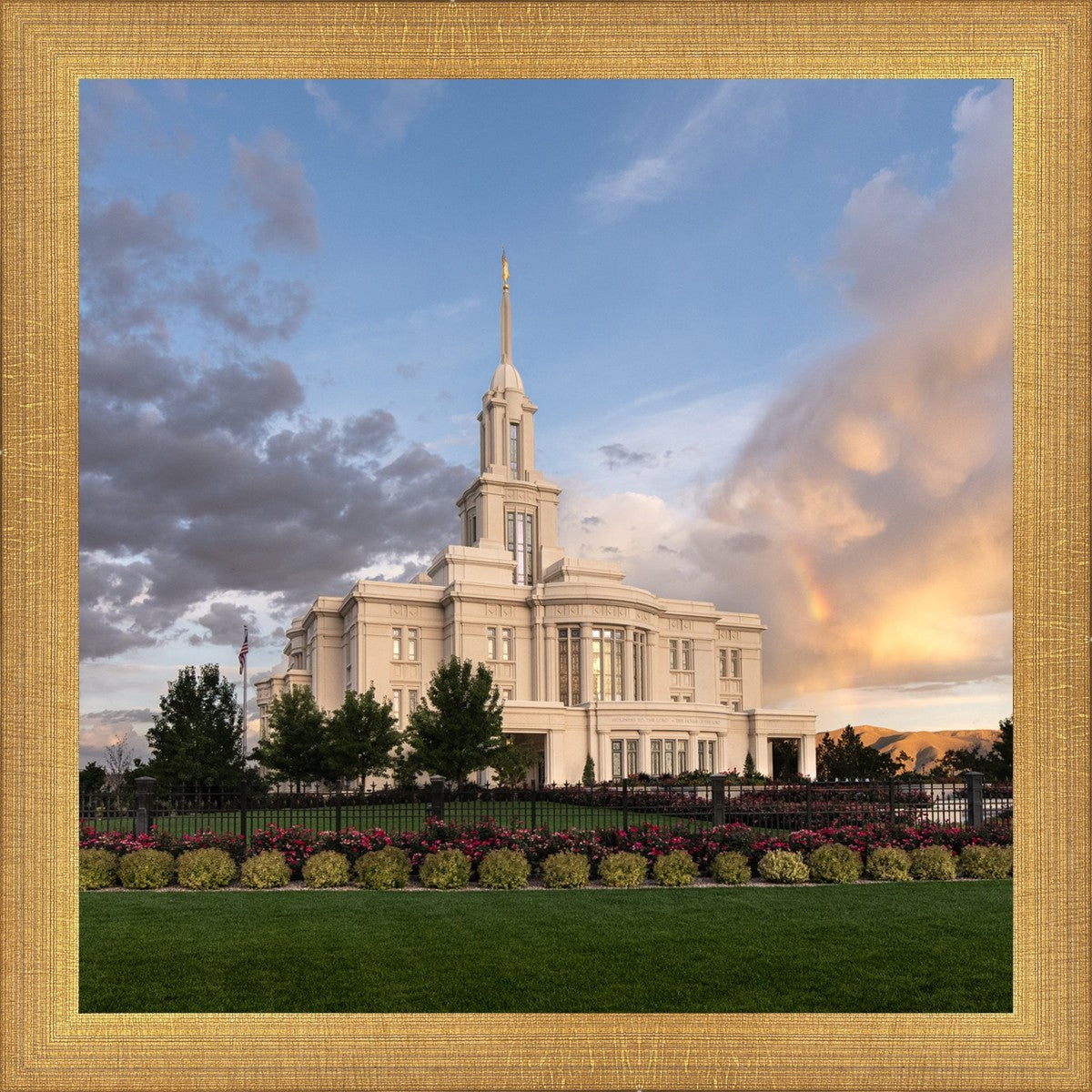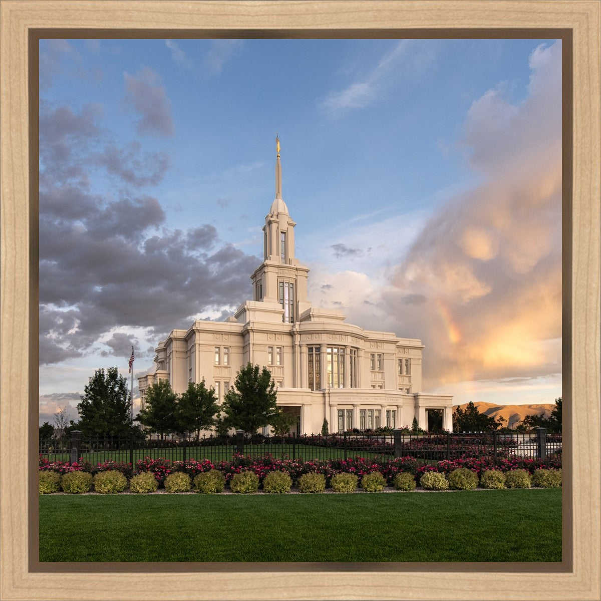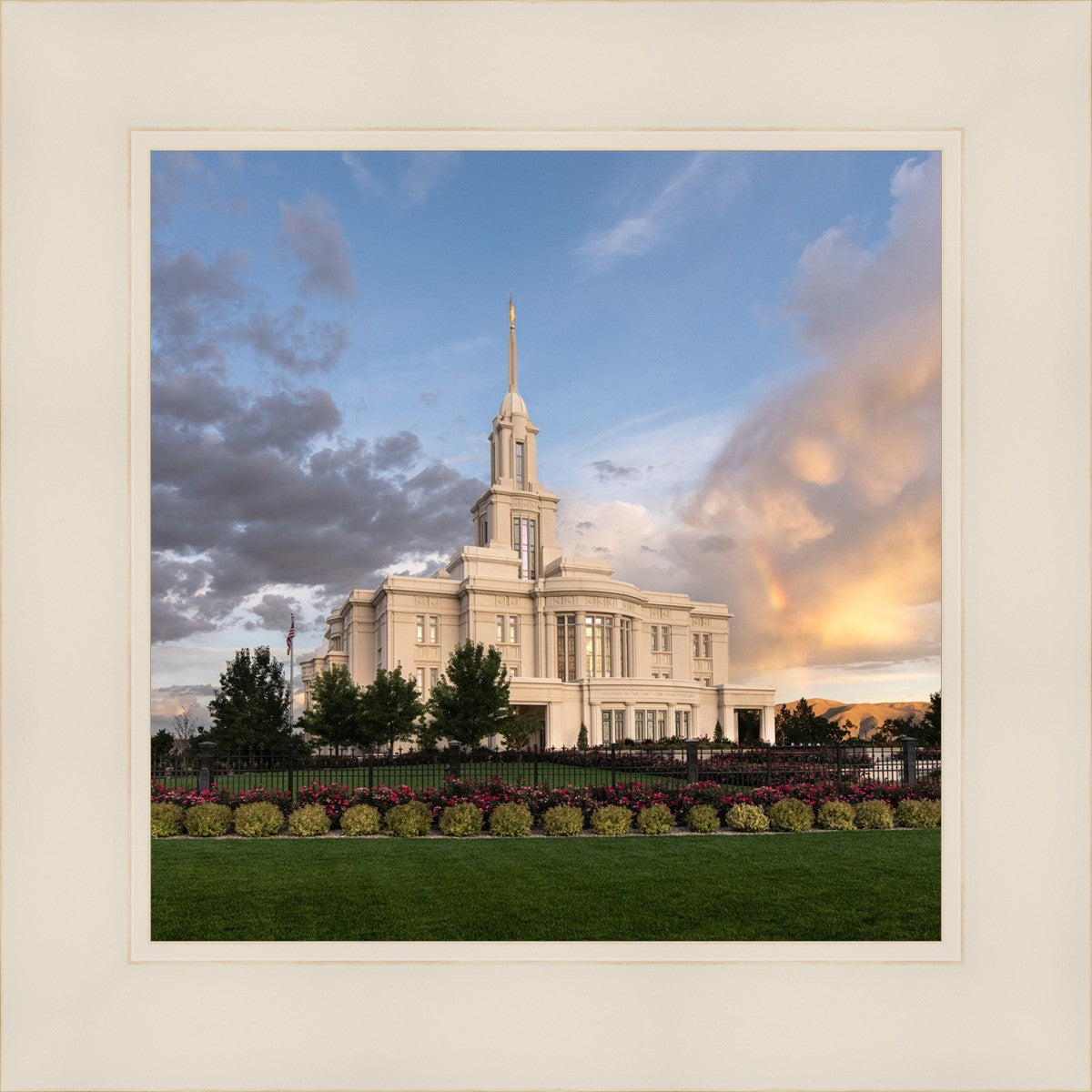 Because of the shadow from the mountains, I was able to capture this unique sunrise picture of the Payson Utah Temple with a hint of a rainbow.