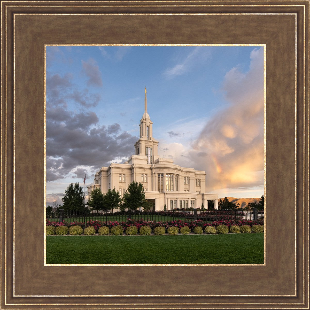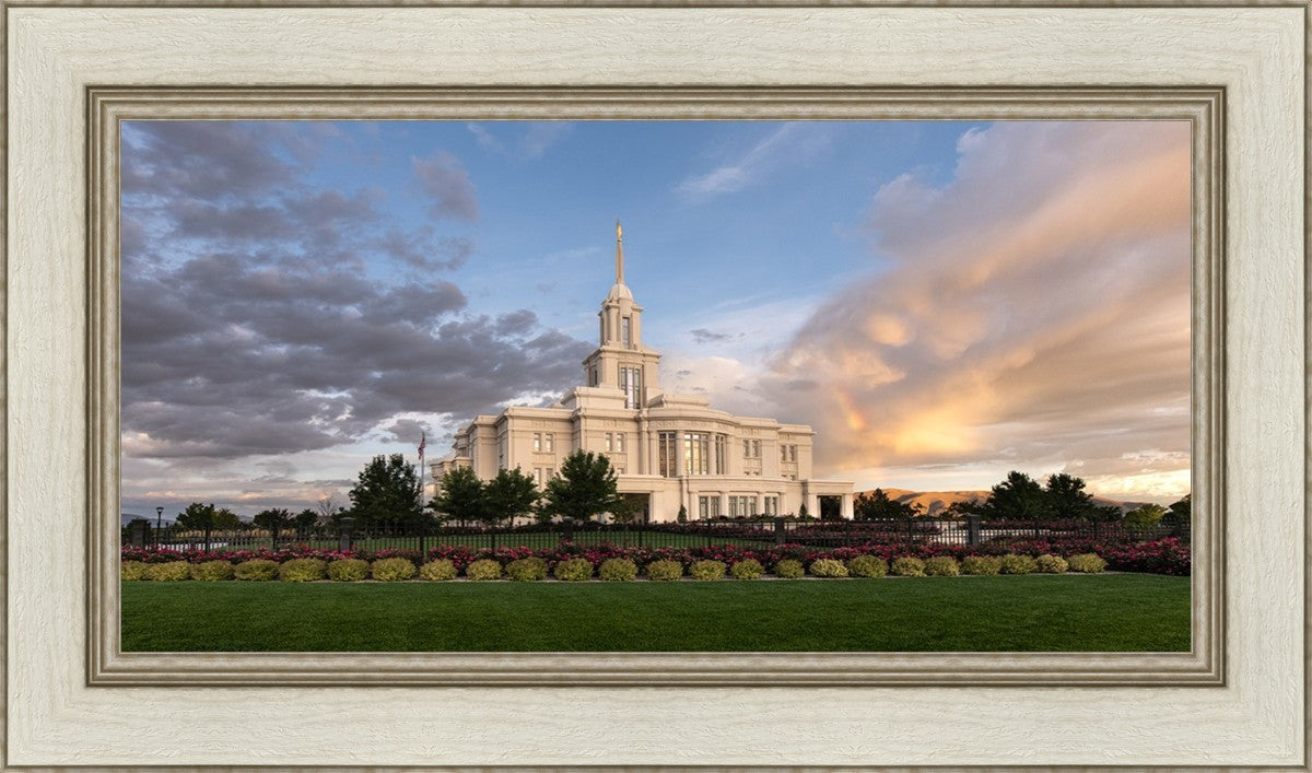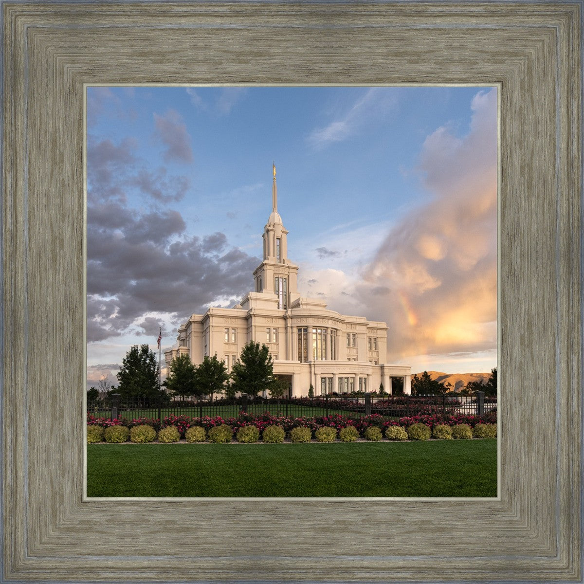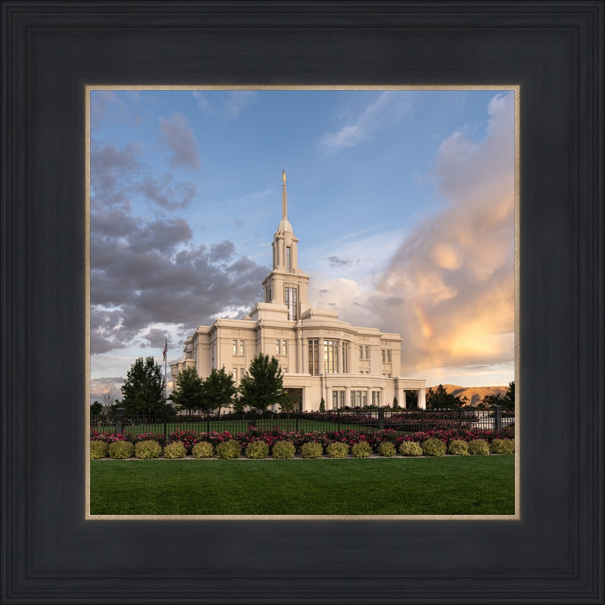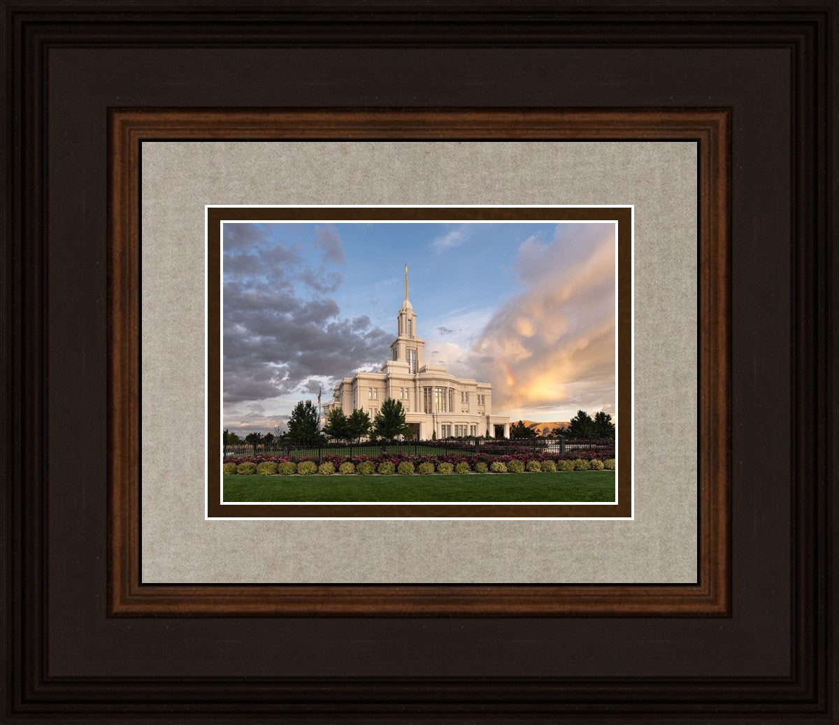 Because of the shadow from the mountains, I was able to capture this unique sunrise picture of the Payson Utah Temple with a hint of a rainbow.