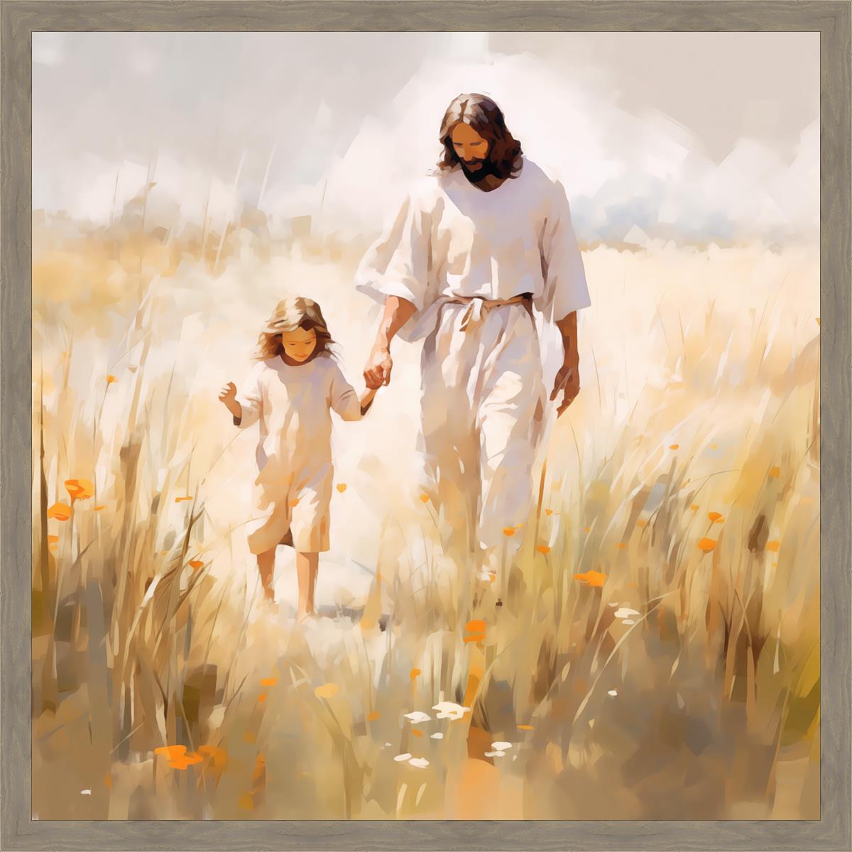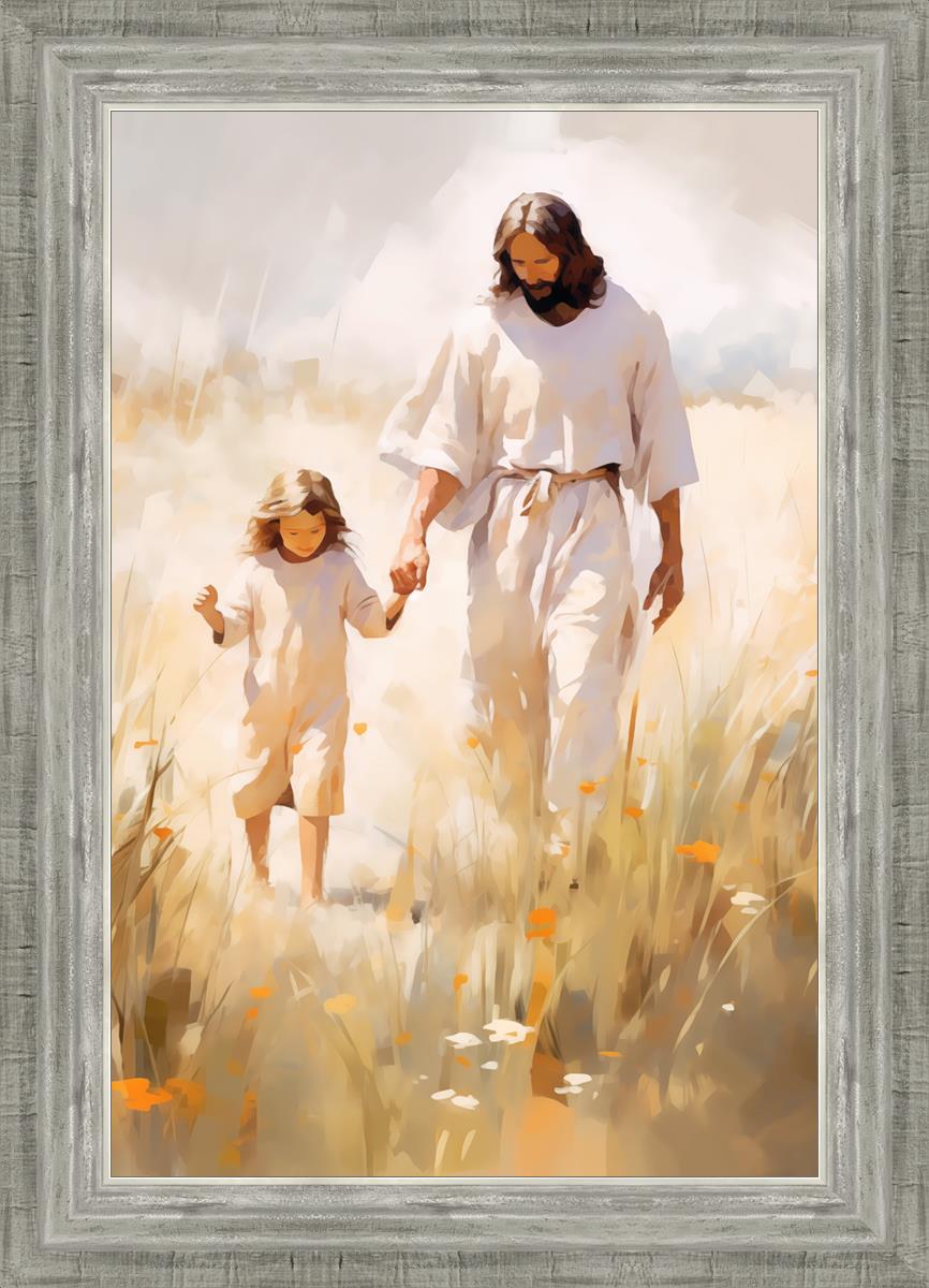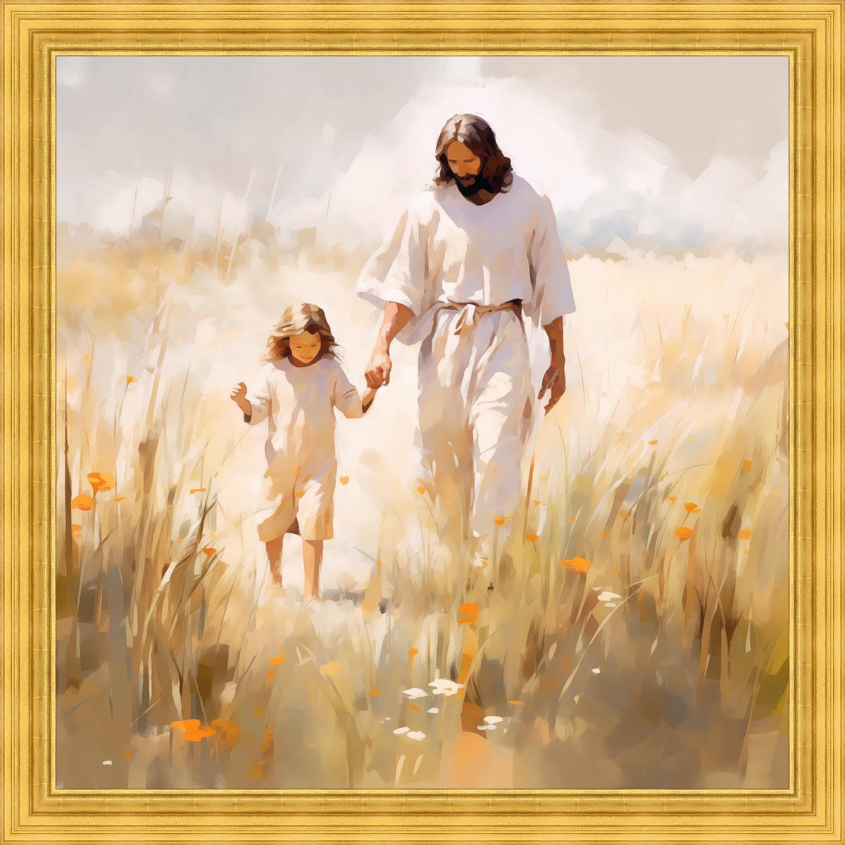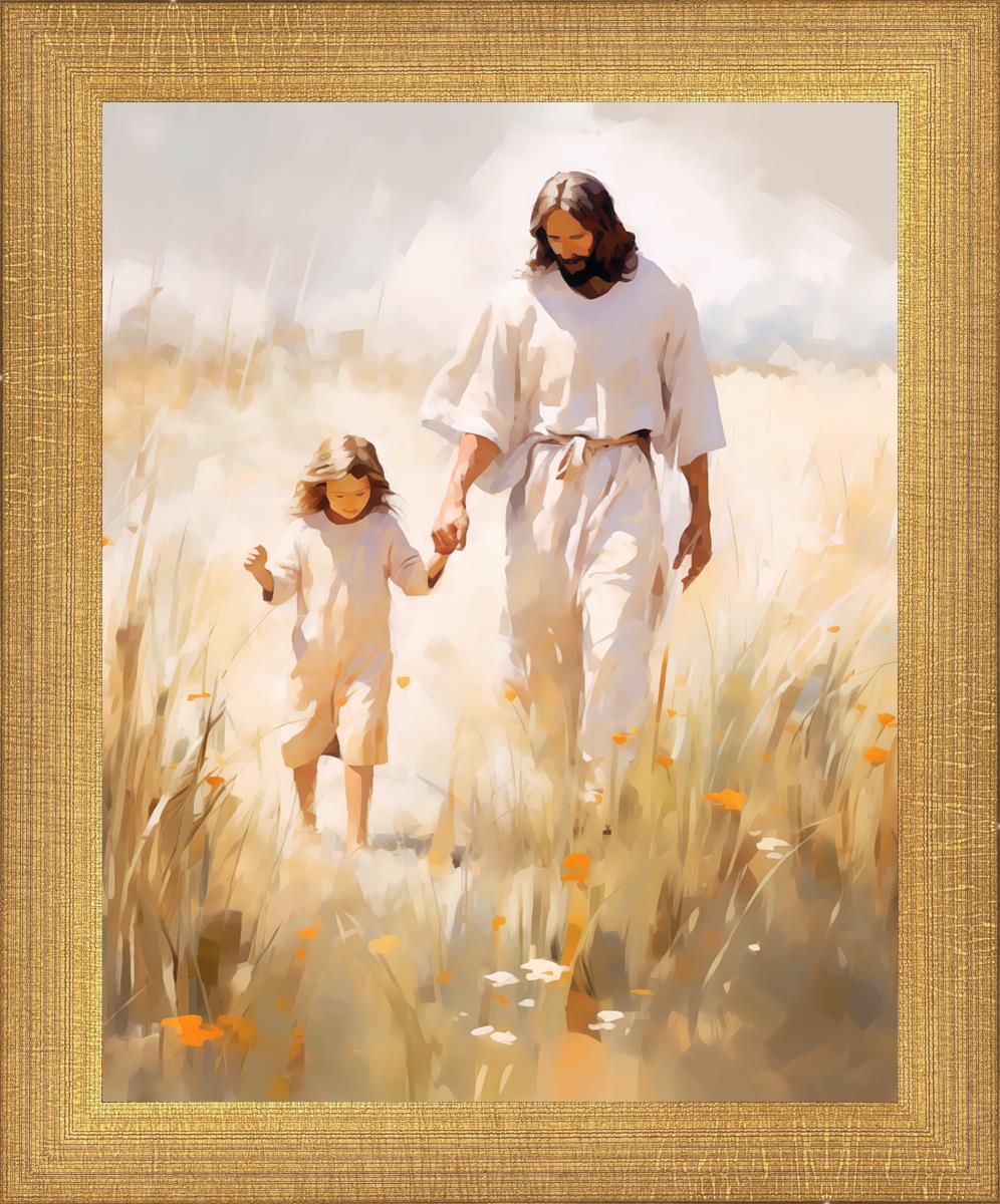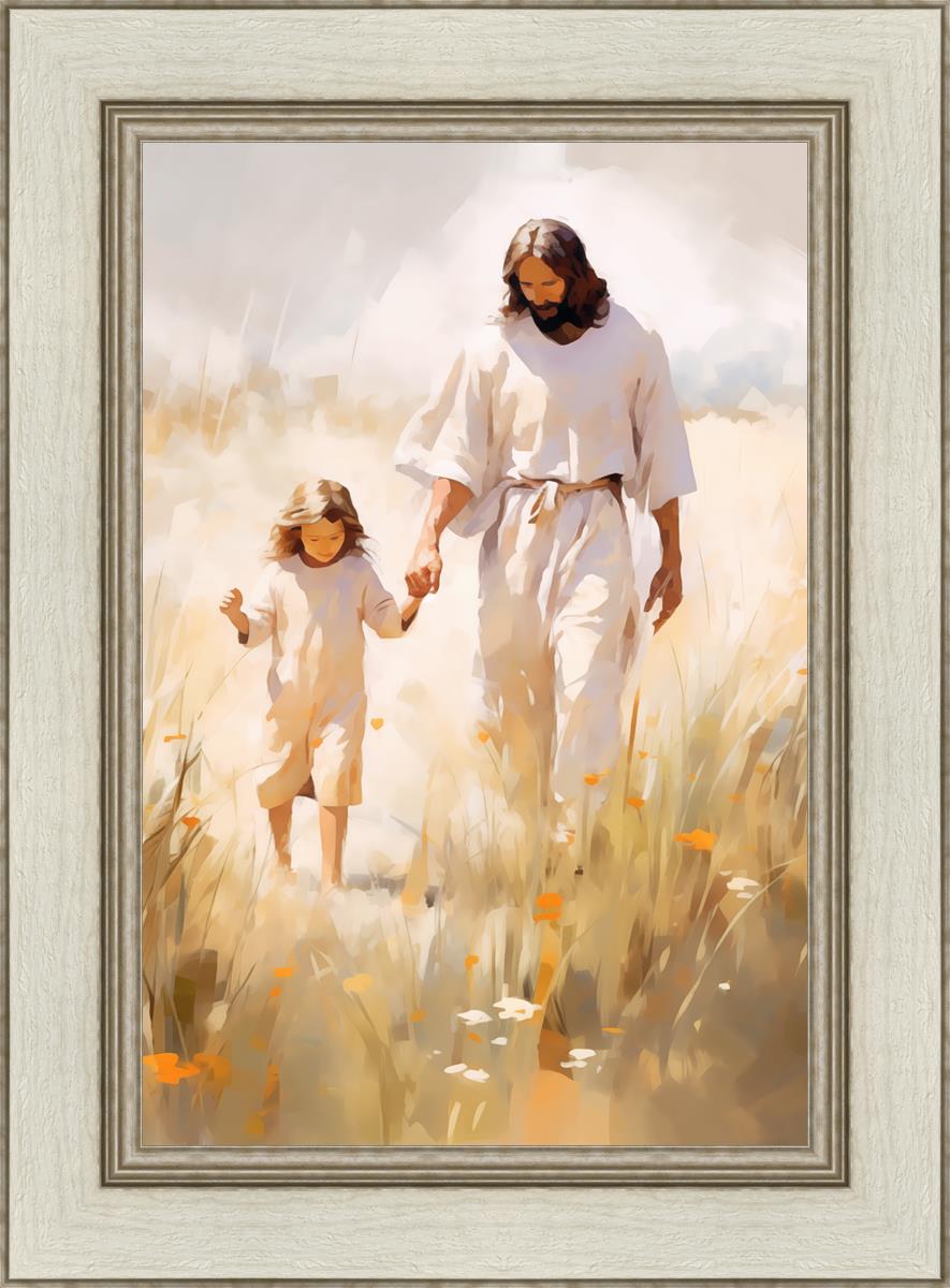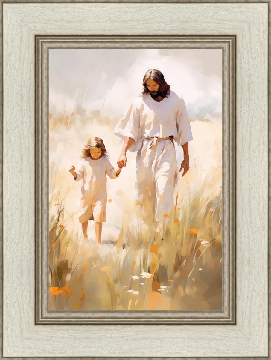 Peace in Christ by Gabriel Heaton portrays Jesus walking hand in hand with a young girl in a serene field.
