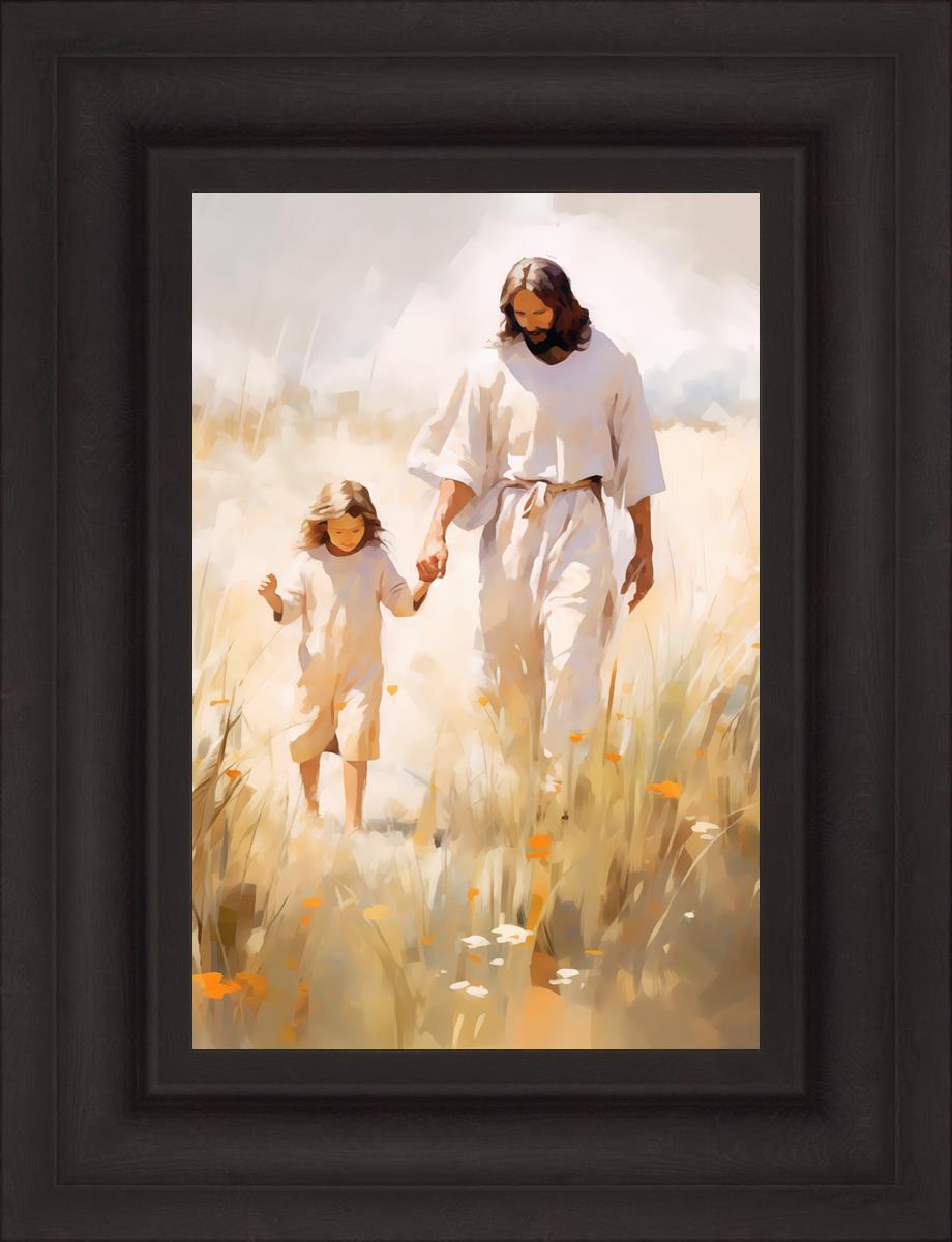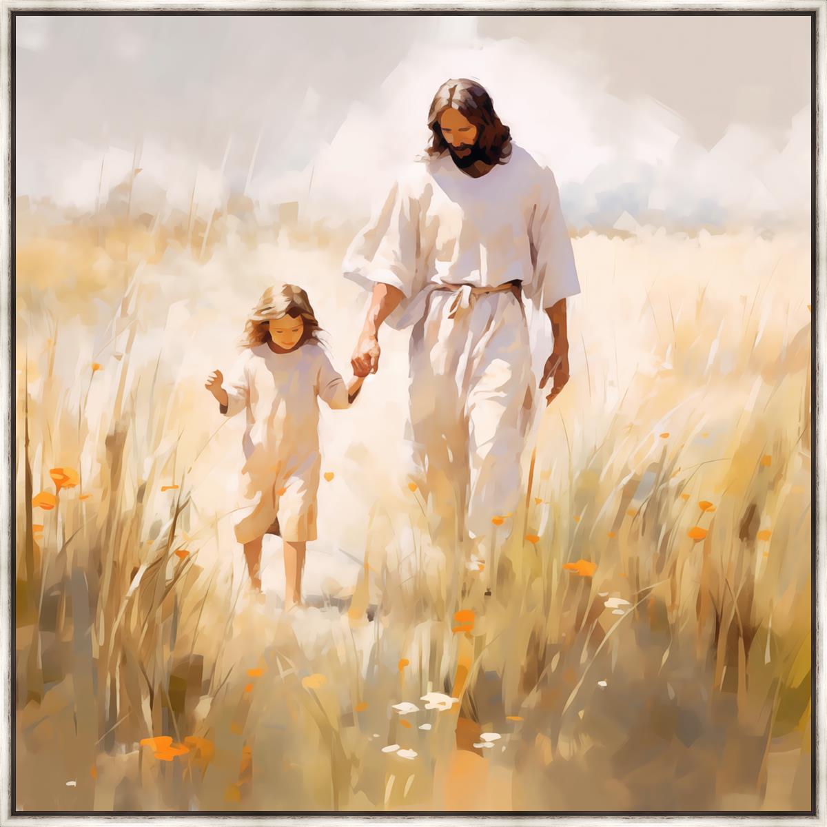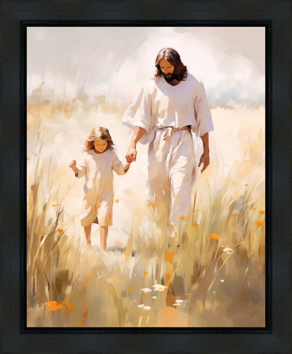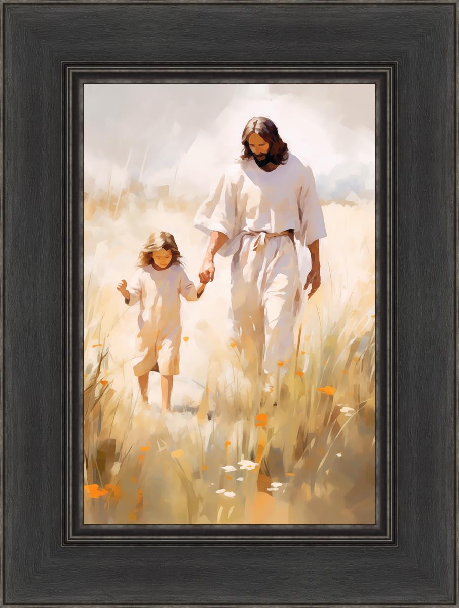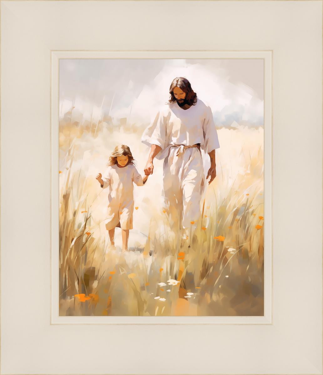 Peace in Christ by Gabriel Heaton portrays Jesus walking hand in hand with a young girl in a serene field.