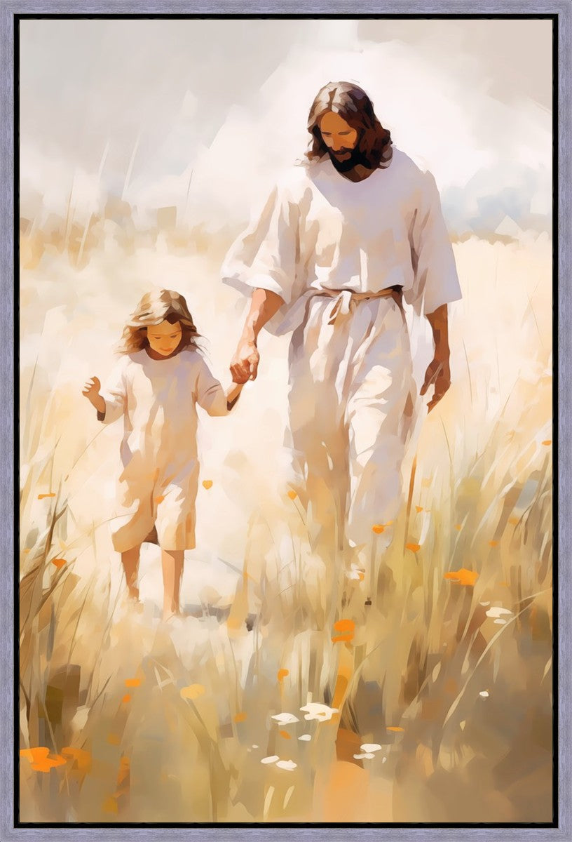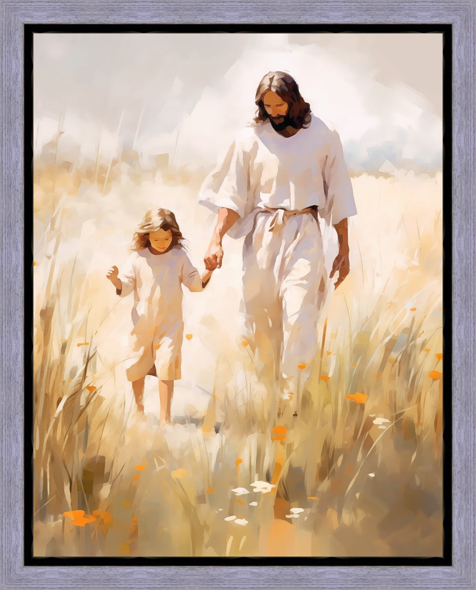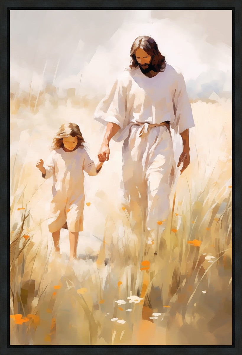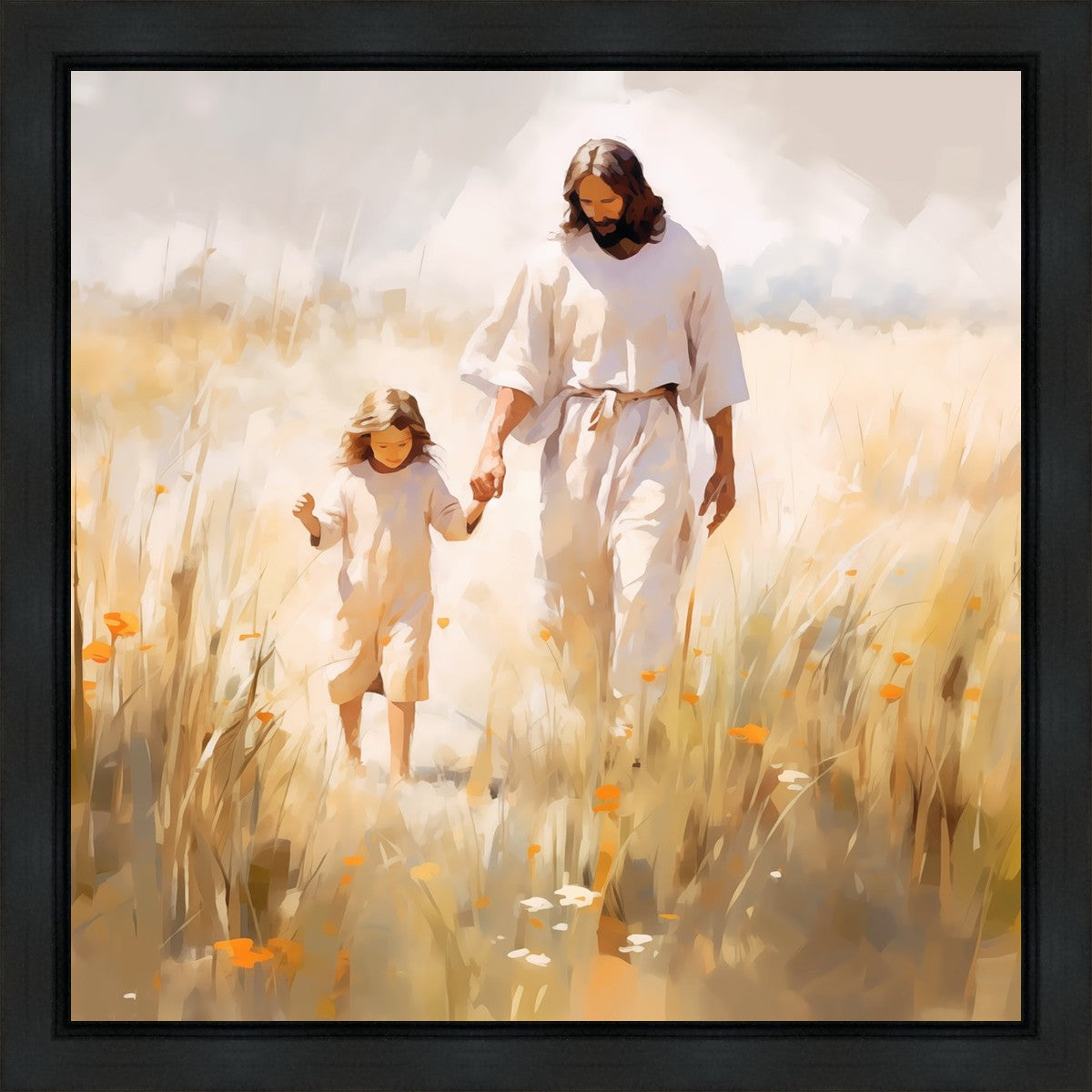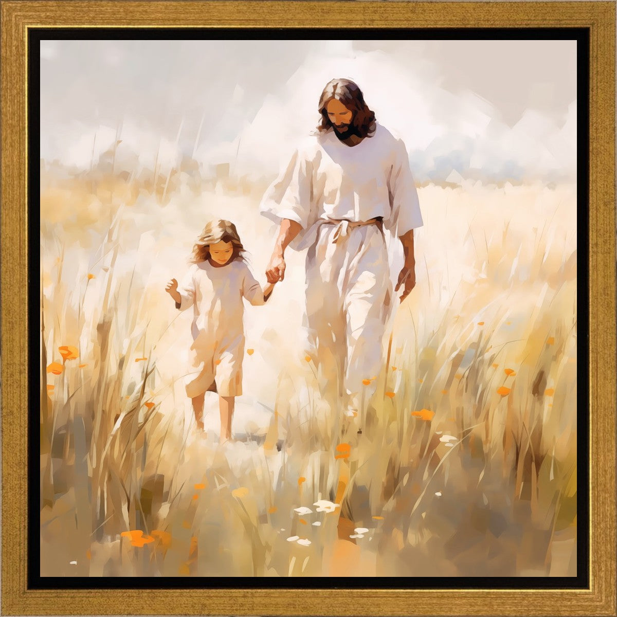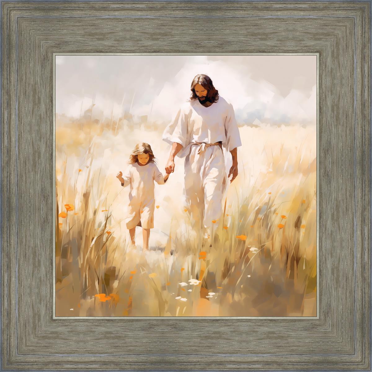 Peace in Christ by Gabriel Heaton portrays Jesus walking hand in hand with a young girl in a serene field.
