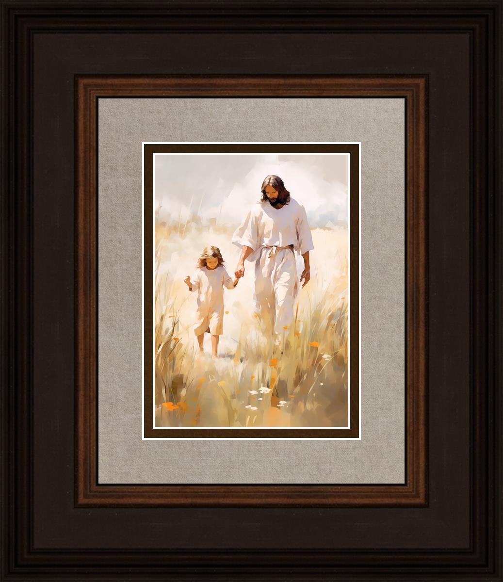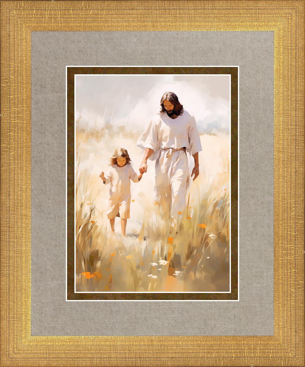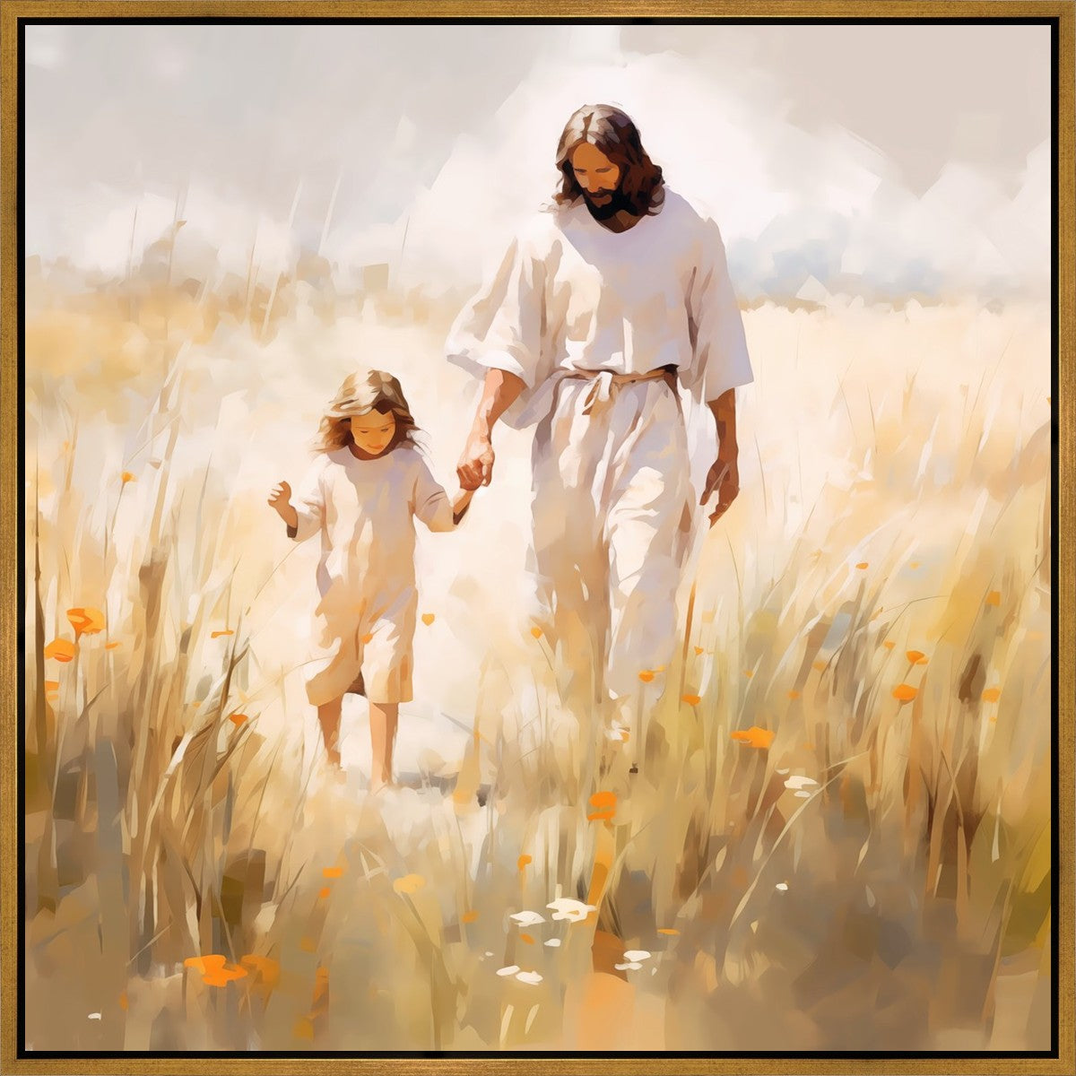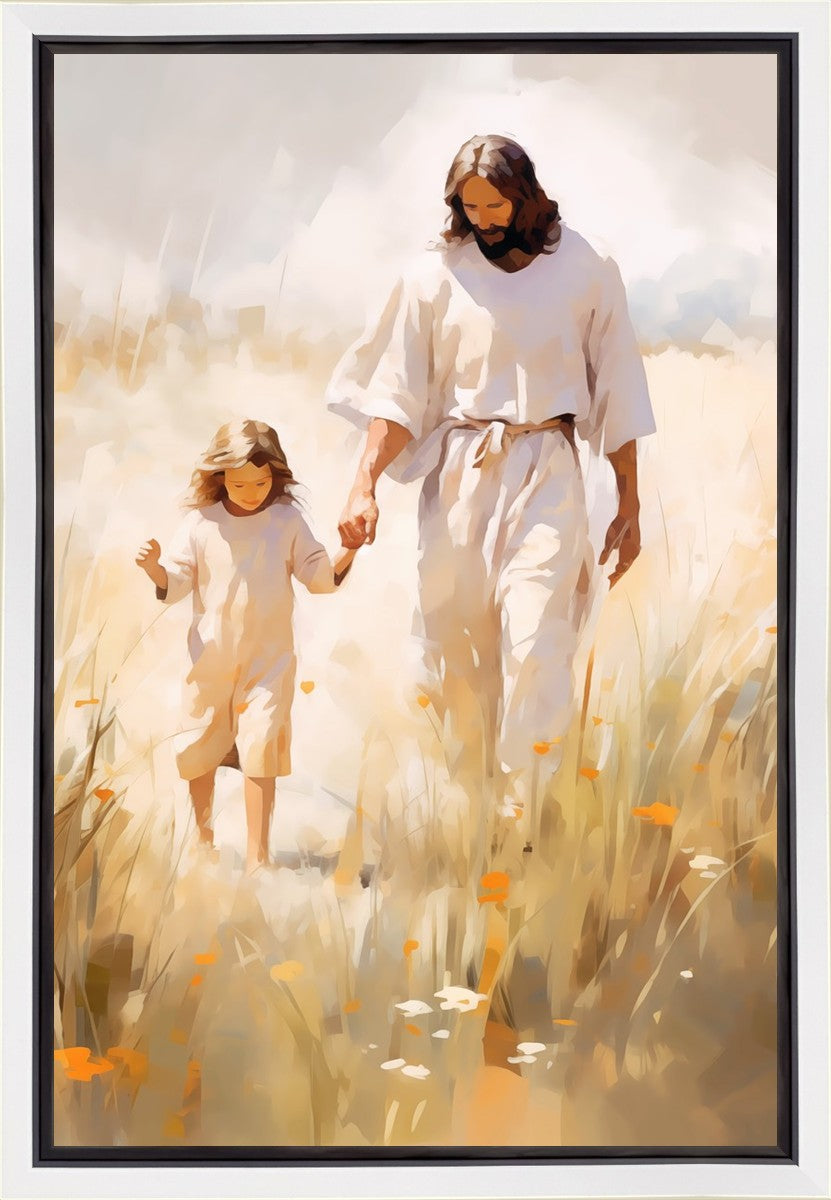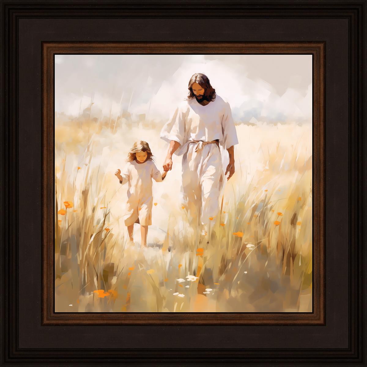 Peace in Christ by Gabriel Heaton portrays Jesus walking hand in hand with a young girl in a serene field.