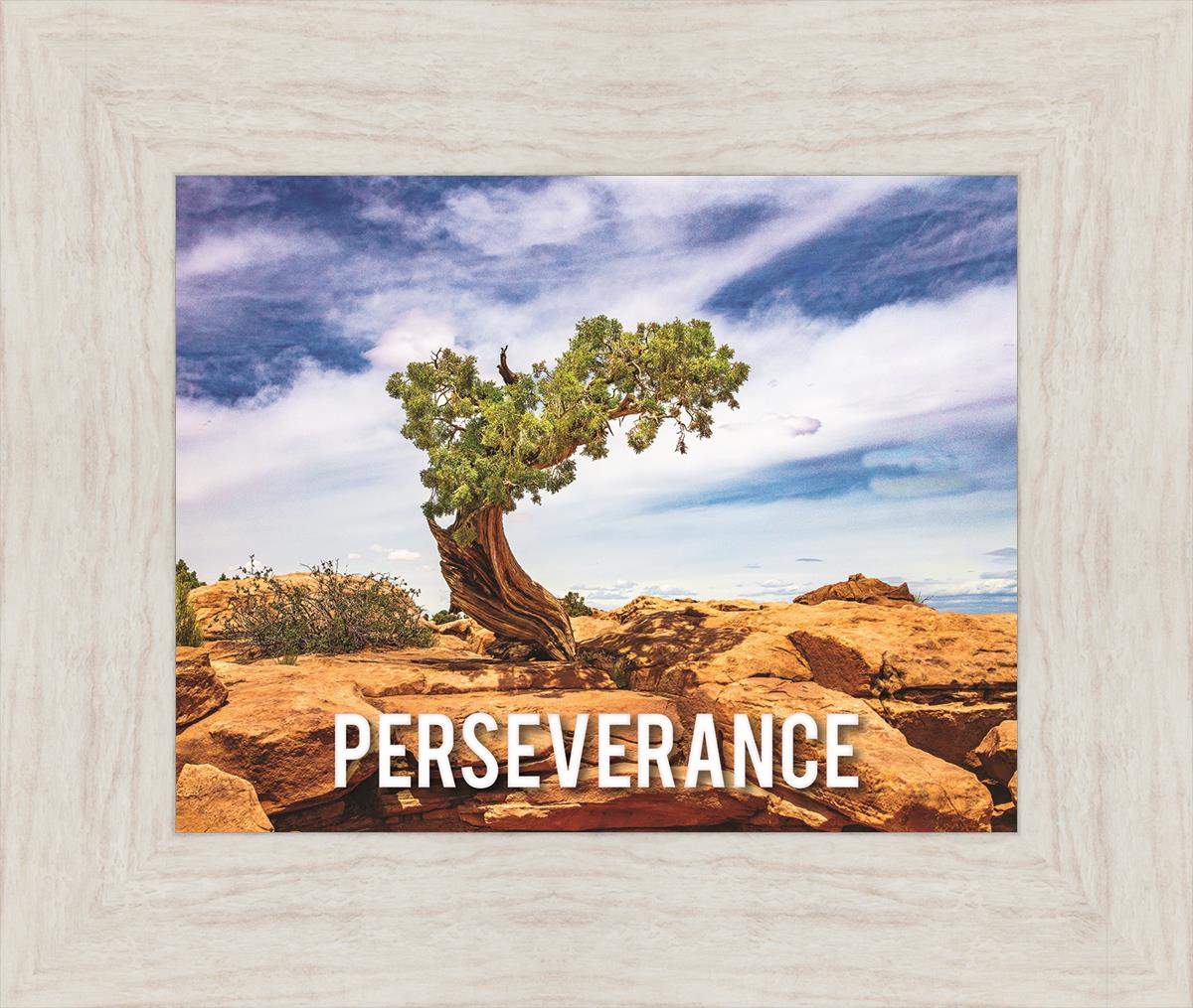 Perseverance Motivational Poster by Julie Kerr features a photograph of a lone tree sprouting from a rock in the desert with the word, ||Perseverance.||