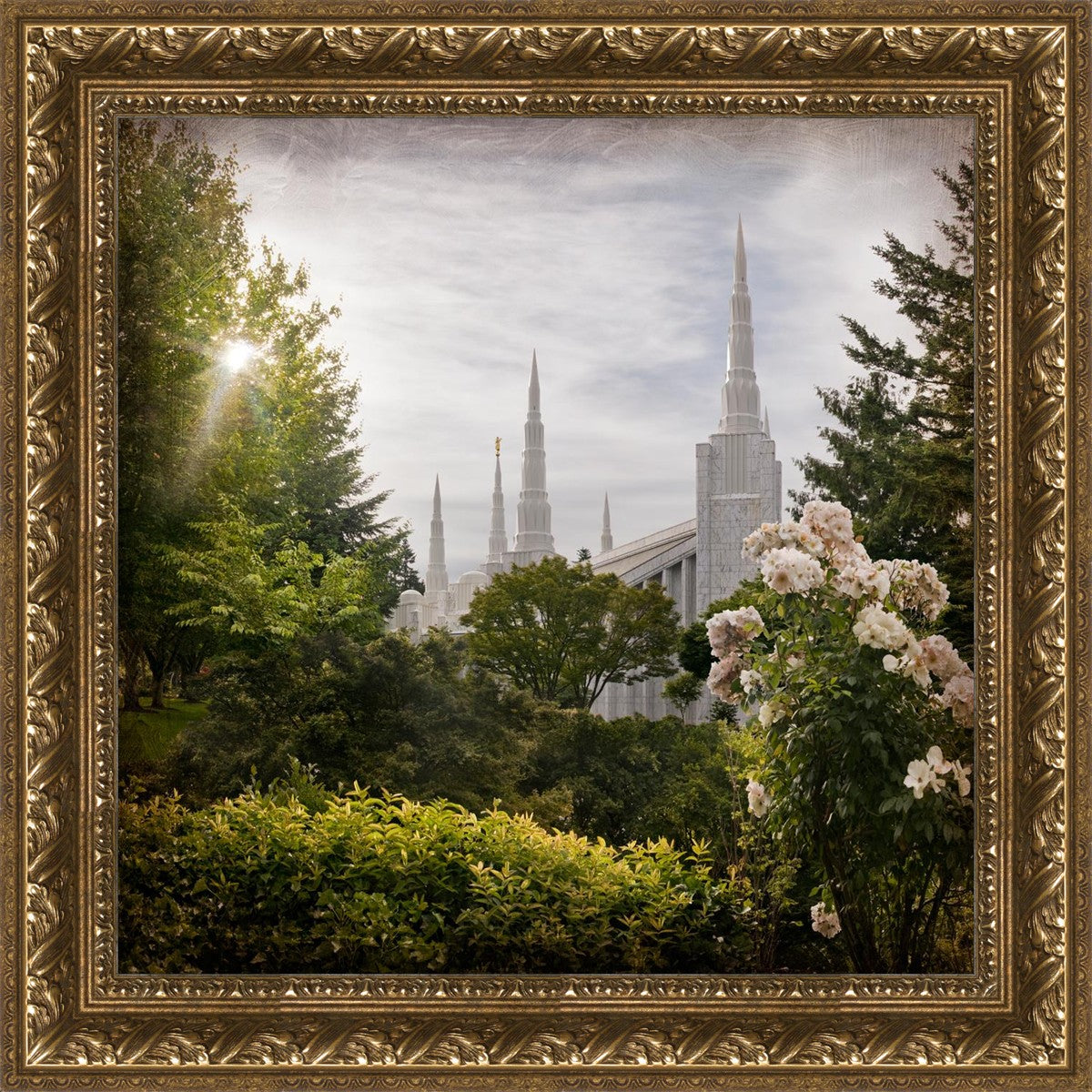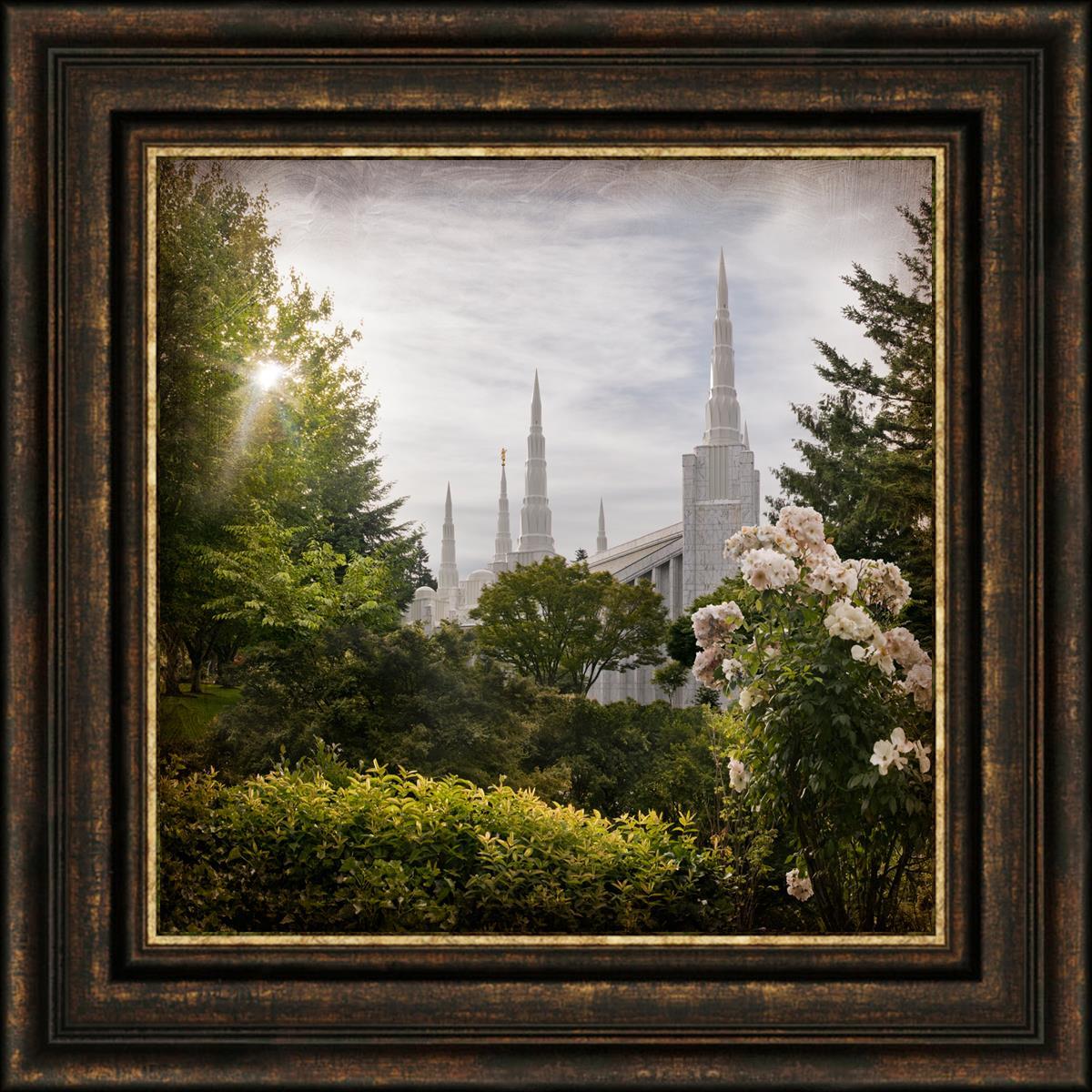 Since 1999 Landon has worked as an artisan in nearly 40 temples doing the decorative paint and gold leaf. He continues to do so as well as wood repair and graining. He was married in 2001 to Jacey Thomas in the Manti Utah temple. When she couldn’t find an image of the temple that she liked enough to purchase for their home, he decided to take one himself. That desire to create something original and different inspired his current series of temple art. They are taken from a panoramic viewpoint and stylized with an artistic border that reflect his paintings. All modern structures apart from the temple have been omitted.