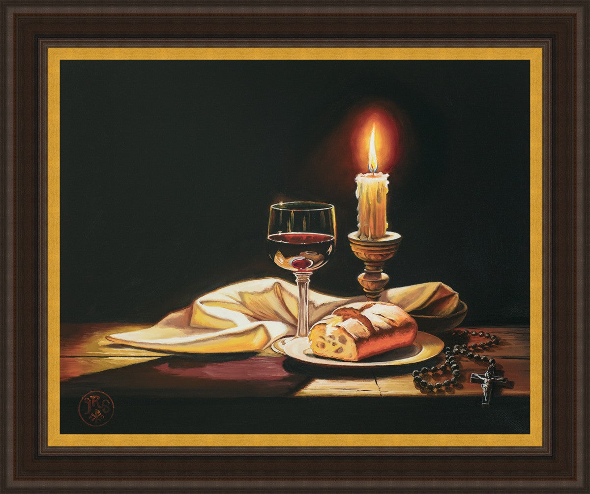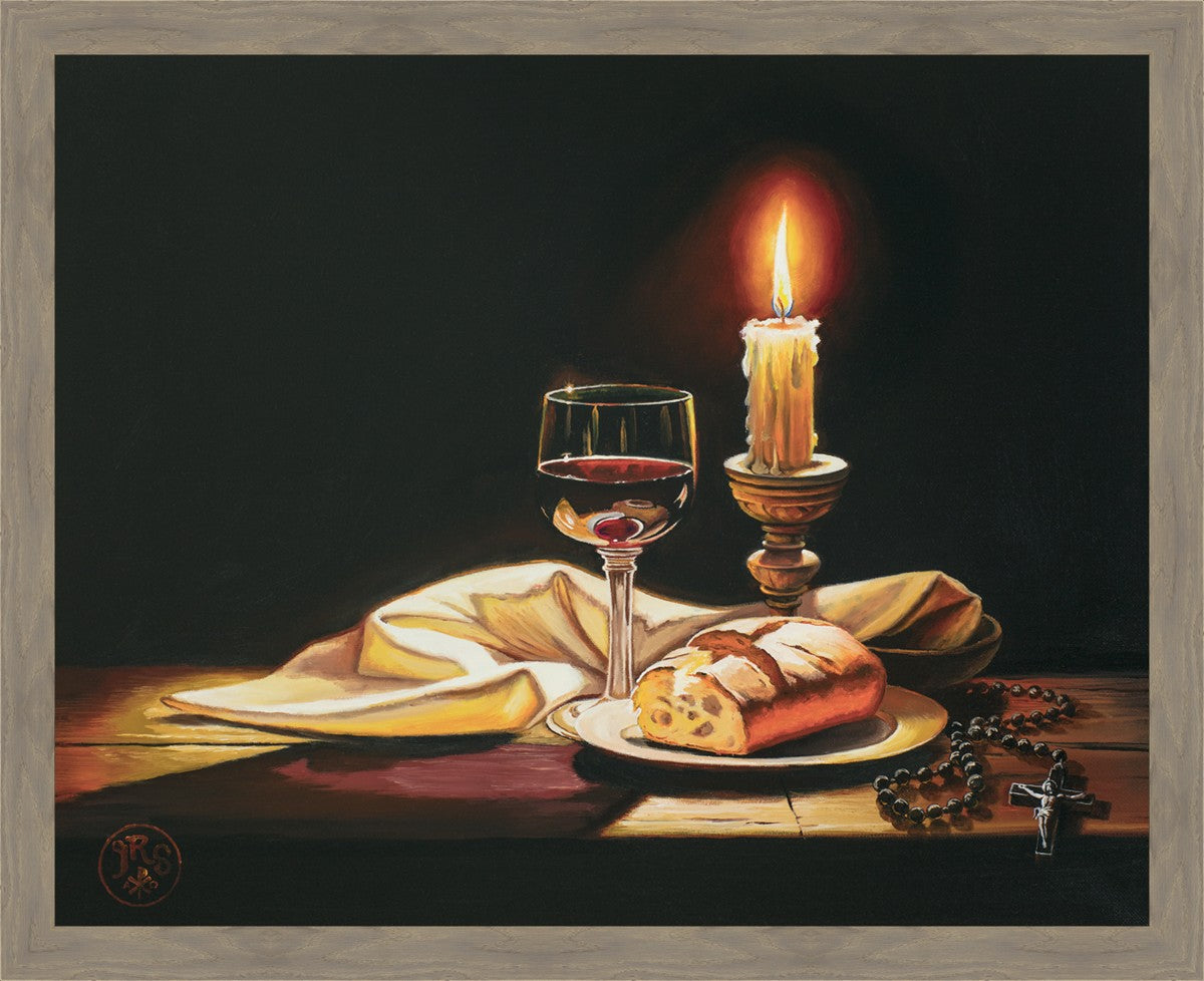 This painting features symbolic eucharistic elements bathed in candle light as a vehicle for portraying the Way, the Truth, and the Light. With a rosary laid next to the elements, this piece also aims to remind us how we all have direct access via prayer to daily interaction with our Lord and Savior.