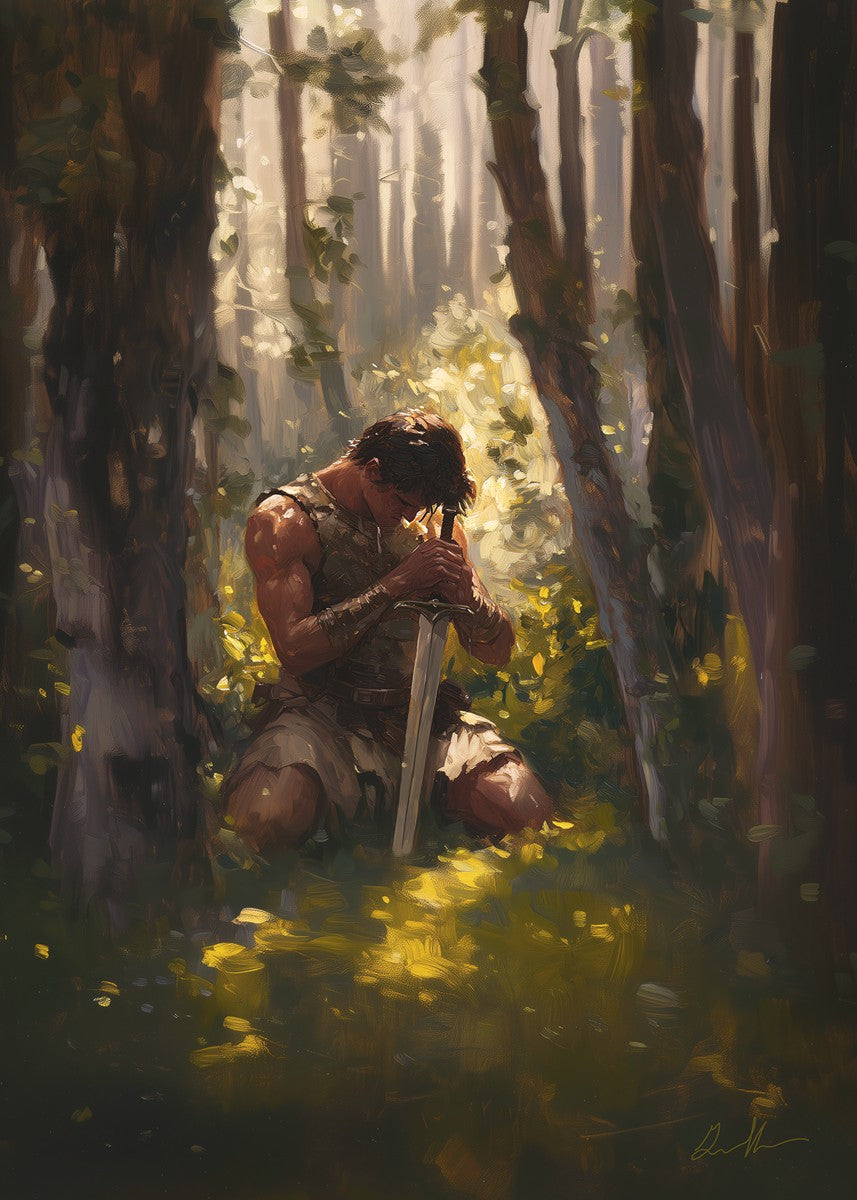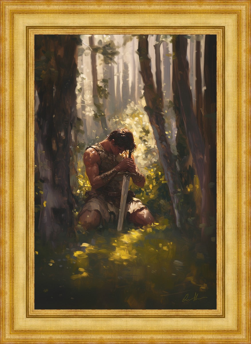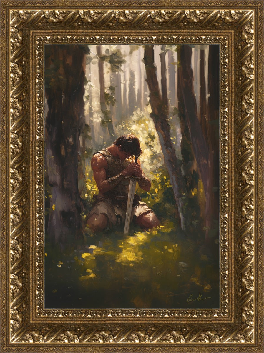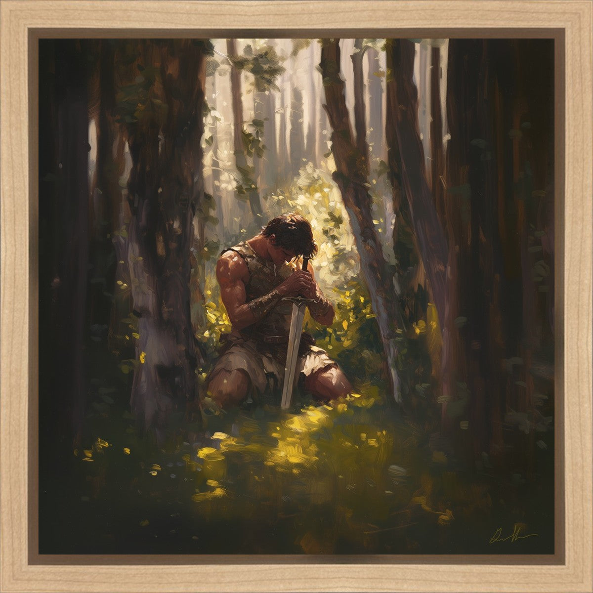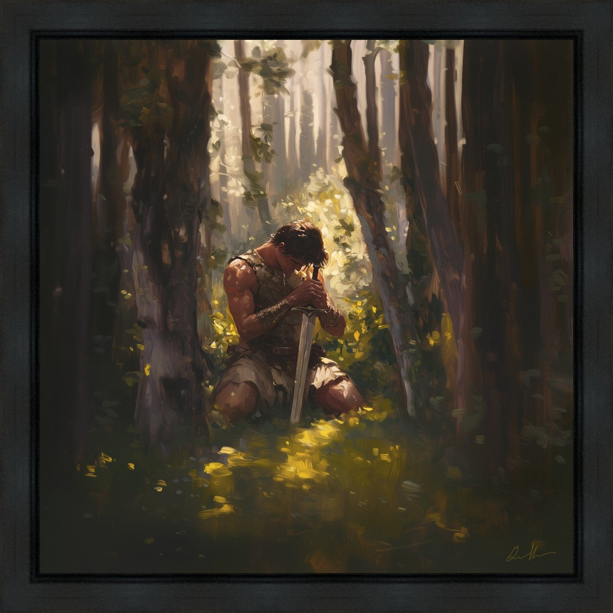 Captain Moroni is my hero. A hell-shaker, a force of divine reckoning. I strive to embody his bold righteousness, but I often fall short of his fierce integrity—rooted in the fear of God, yet fearlessly standing against his enemies. Moroni is not merely a warrior; he is God's warrior. His power comes not from his sword but from the deep well of faith within him. He knows his strength is Heaven-sent, making him unyielding against any adversary. This piece captures his moment of quiet reflection—sword in hand, strength drawn from above—symbolizing what it truly means to be formidable in the face of darkness.