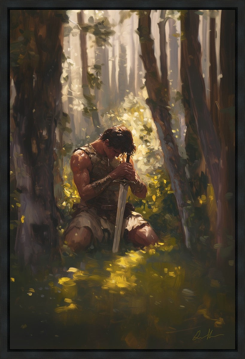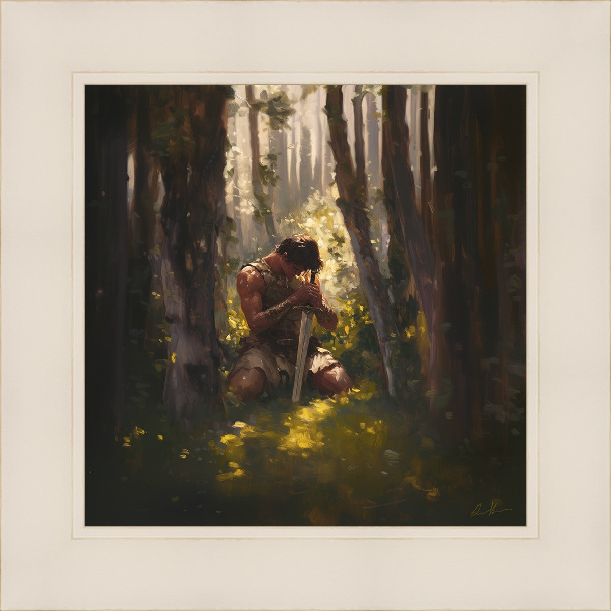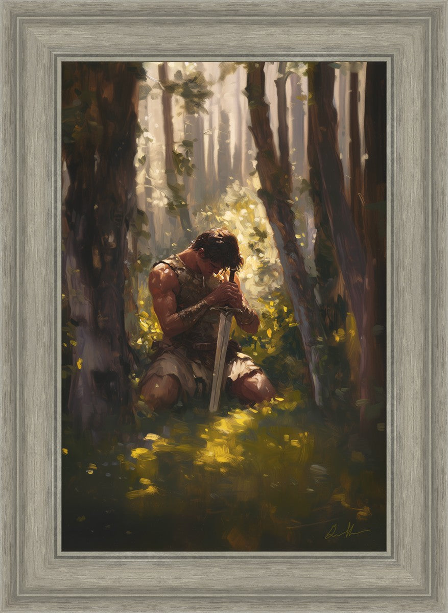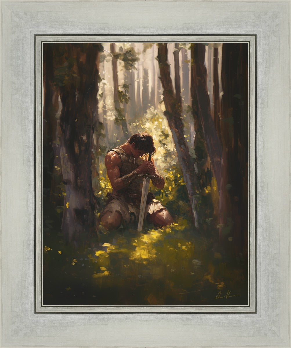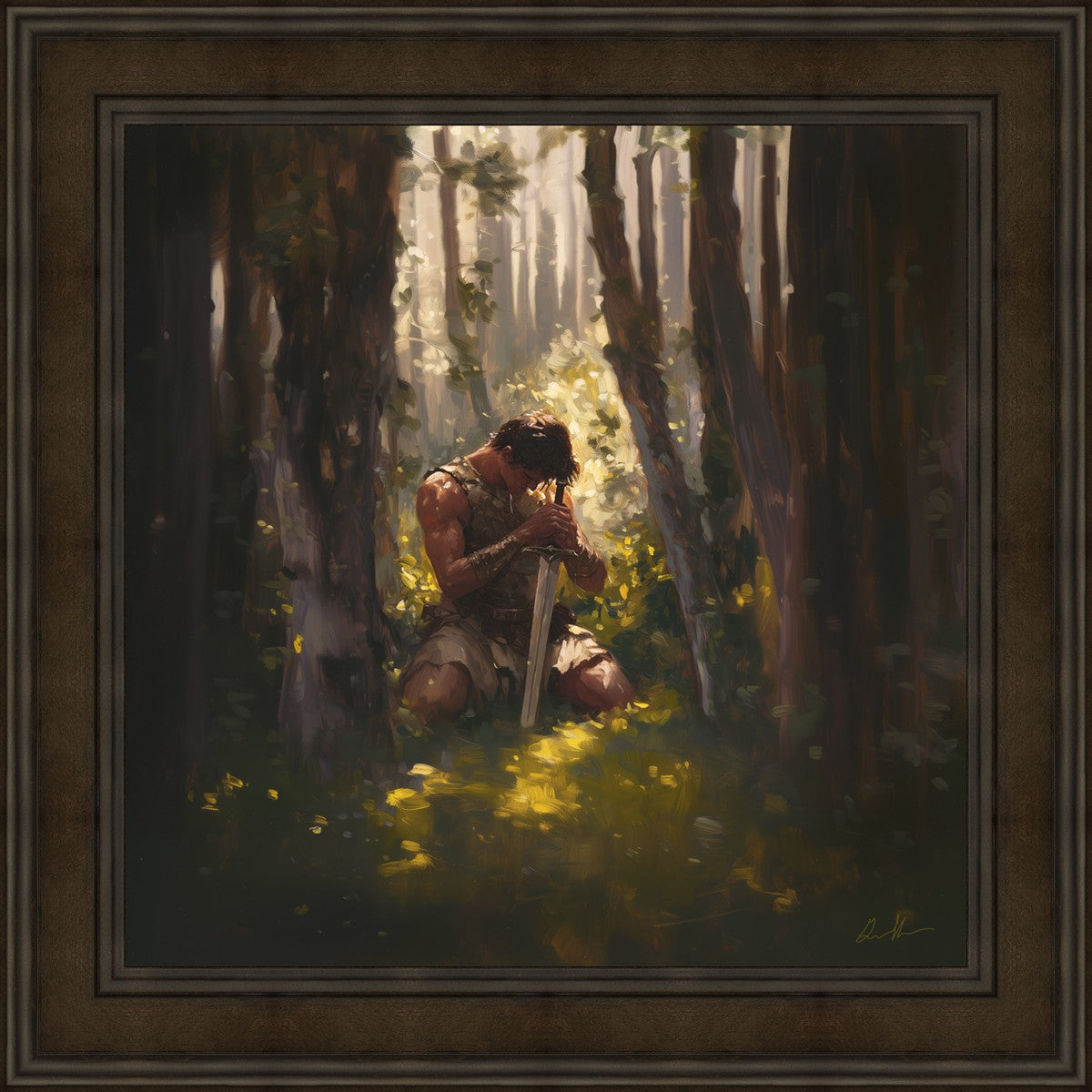 Captain Moroni is my hero. A hell-shaker, a force of divine reckoning. I strive to embody his bold righteousness, but I often fall short of his fierce integrity—rooted in the fear of God, yet fearlessly standing against his enemies. Moroni is not merely a warrior; he is God's warrior. His power comes not from his sword but from the deep well of faith within him. He knows his strength is Heaven-sent, making him unyielding against any adversary. This piece captures his moment of quiet reflection—sword in hand, strength drawn from above—symbolizing what it truly means to be formidable in the face of darkness.