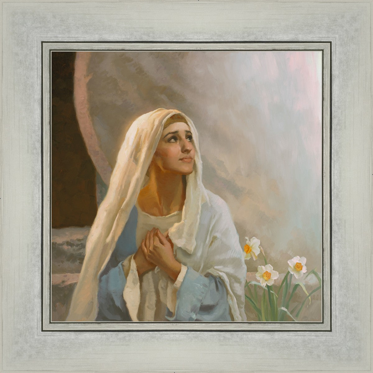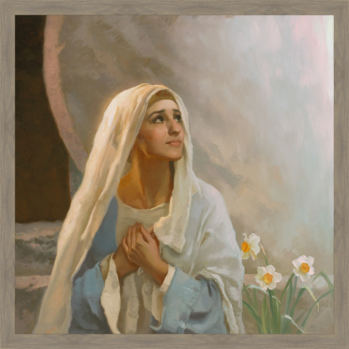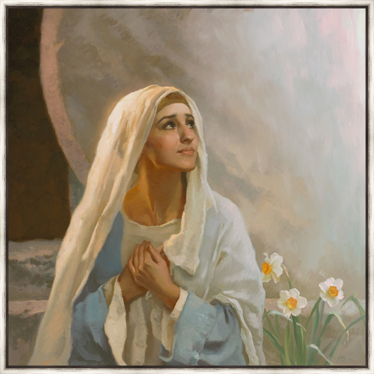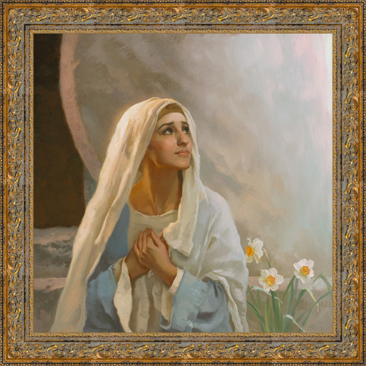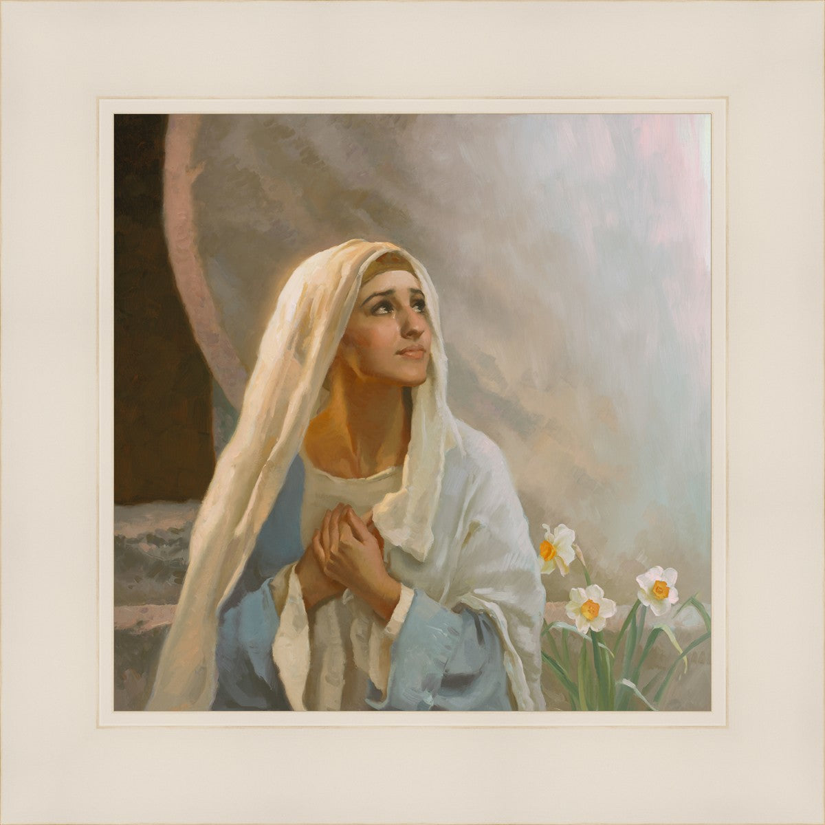 Mary's expression, one of awe and reverence, reflects the dawning of understanding as she looks upon the resurrected Lord. The tender blooms nearby, fresh against the stone, echo the miracle of life and resurrection. It is my hope that those who gaze upon this work feel the joyous serenity of a pivotal moment in faith, a scene of quiet wonder, and the everlasting promise of victory through Christ.