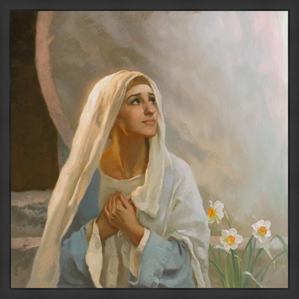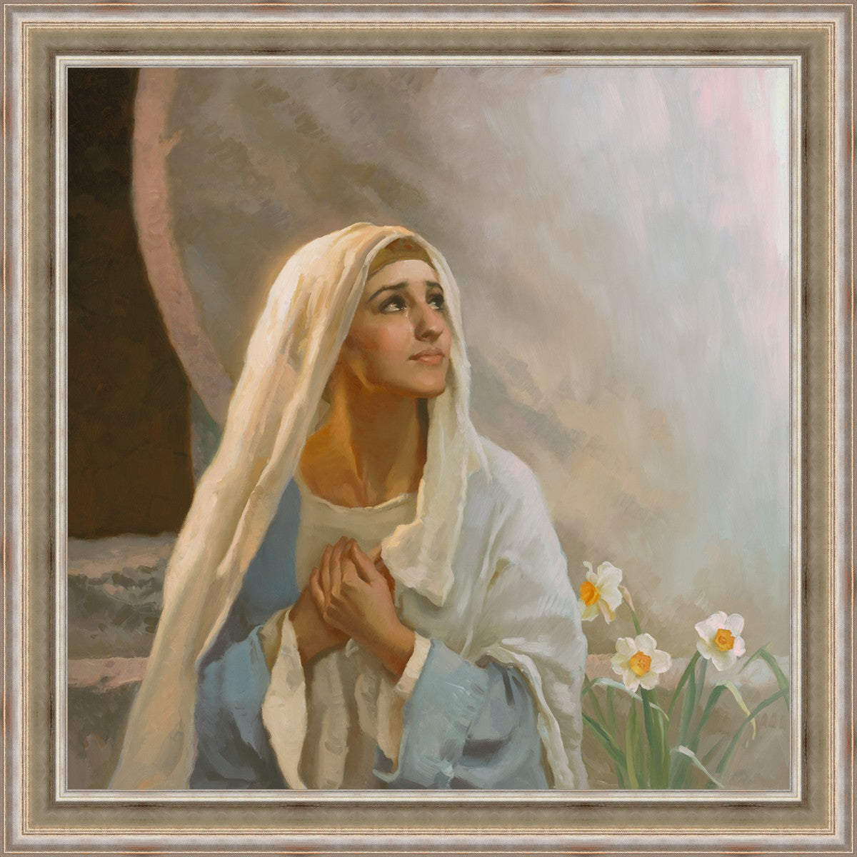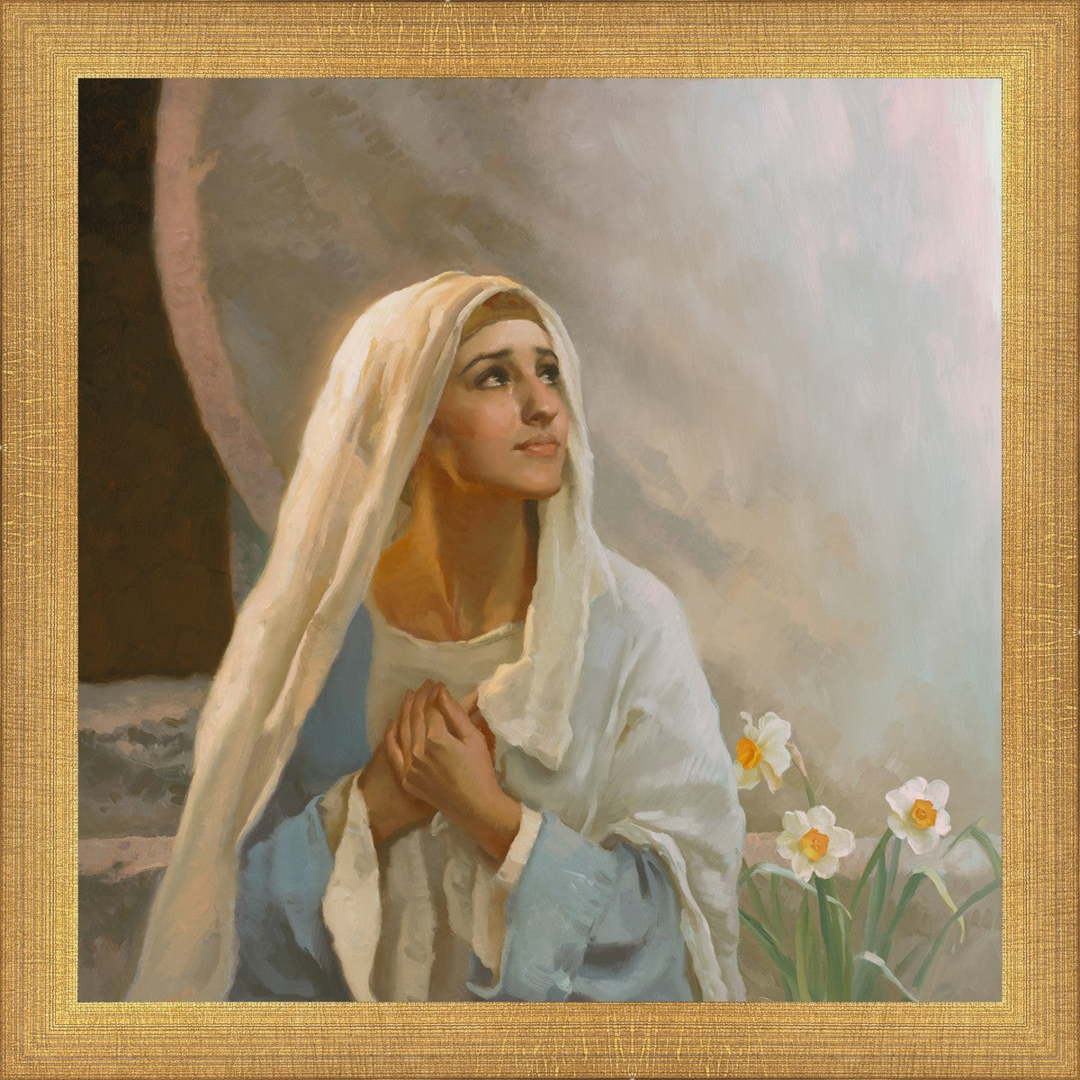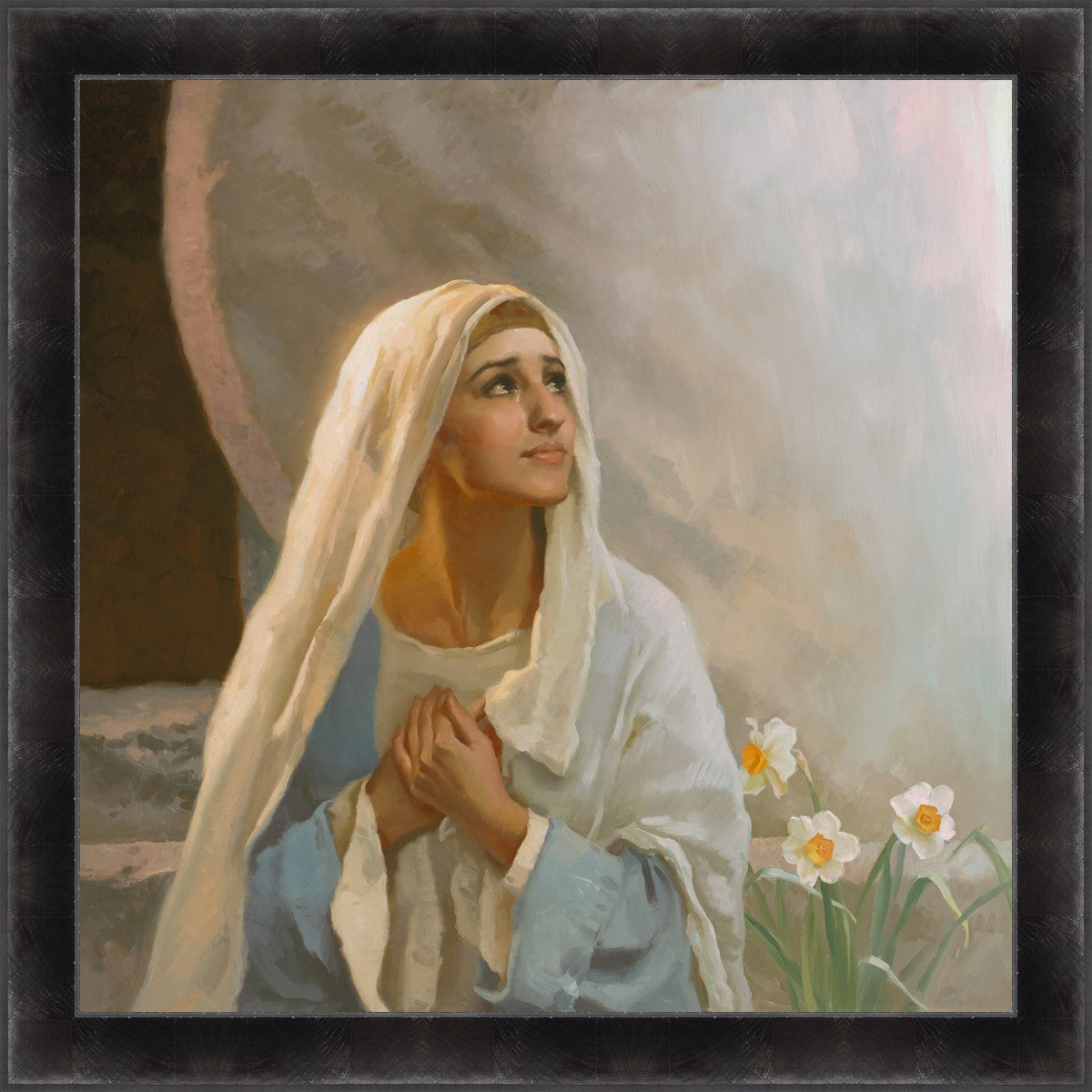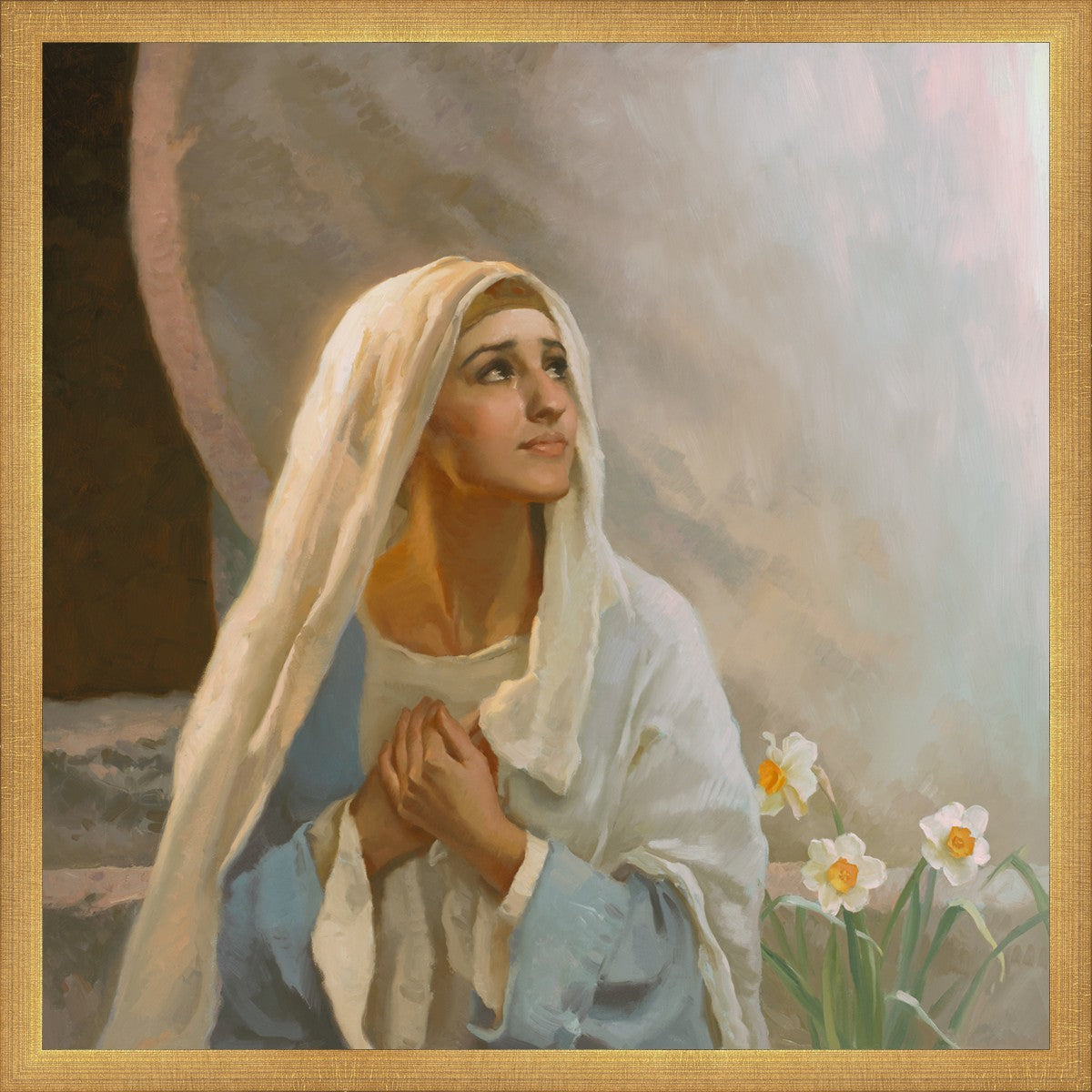 Mary's expression, one of awe and reverence, reflects the dawning of understanding as she looks upon the resurrected Lord. The tender blooms nearby, fresh against the stone, echo the miracle of life and resurrection. It is my hope that those who gaze upon this work feel the joyous serenity of a pivotal moment in faith, a scene of quiet wonder, and the everlasting promise of victory through Christ.