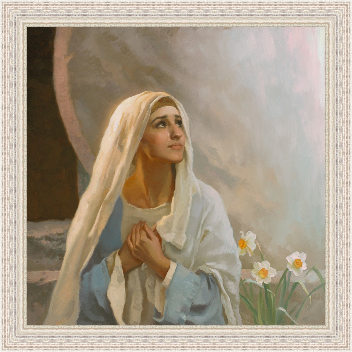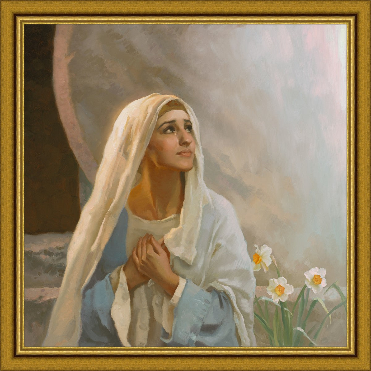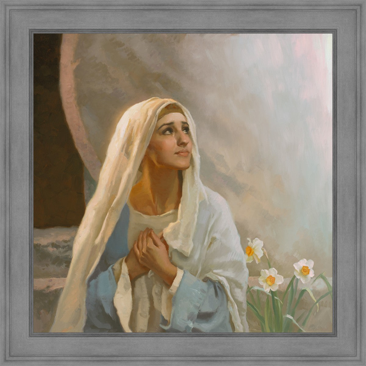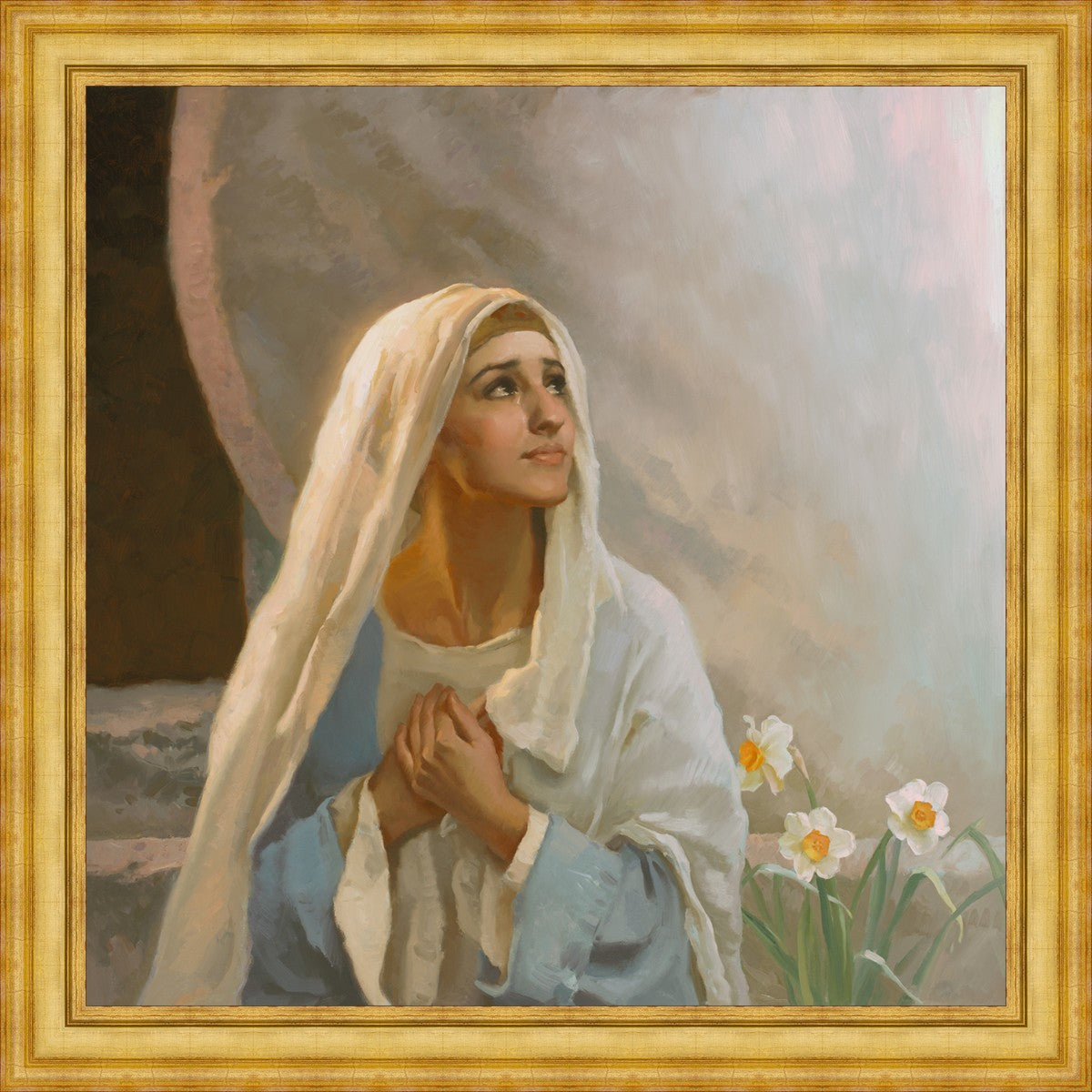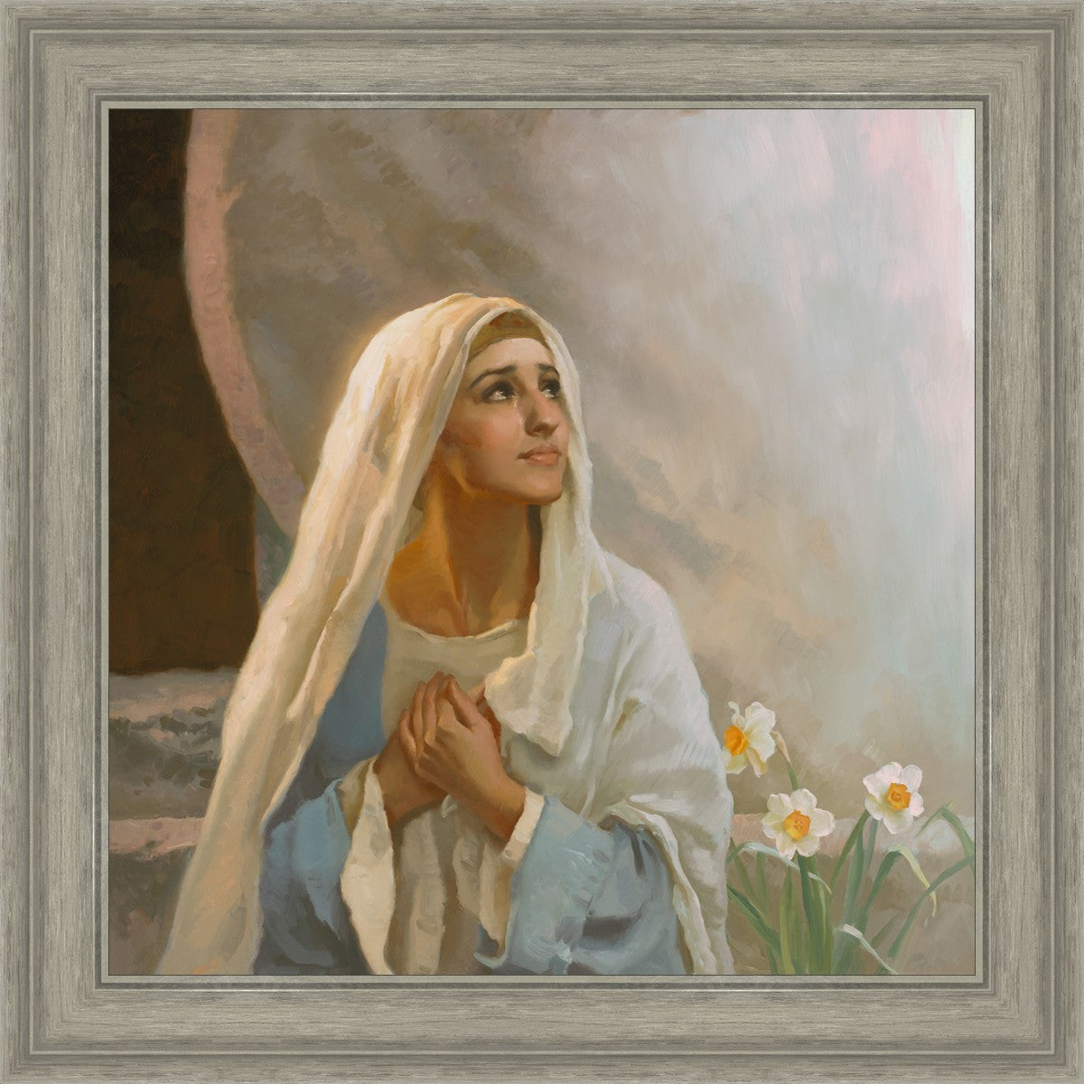 Mary's expression, one of awe and reverence, reflects the dawning of understanding as she looks upon the resurrected Lord. The tender blooms nearby, fresh against the stone, echo the miracle of life and resurrection. It is my hope that those who gaze upon this work feel the joyous serenity of a pivotal moment in faith, a scene of quiet wonder, and the everlasting promise of victory through Christ.