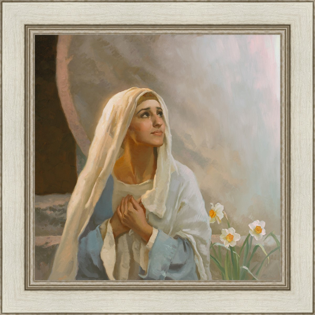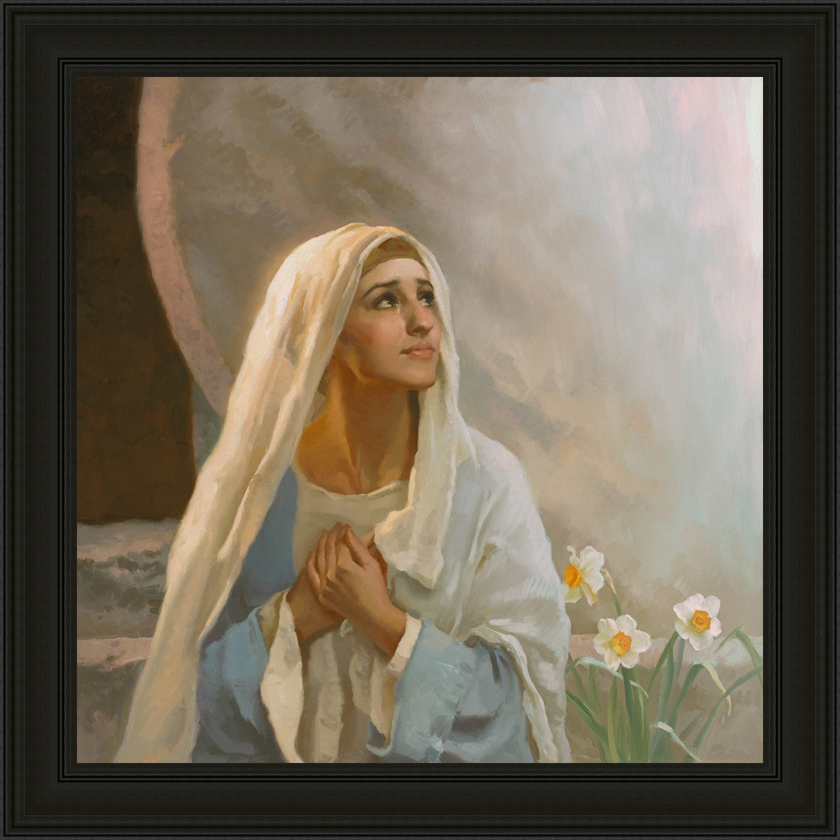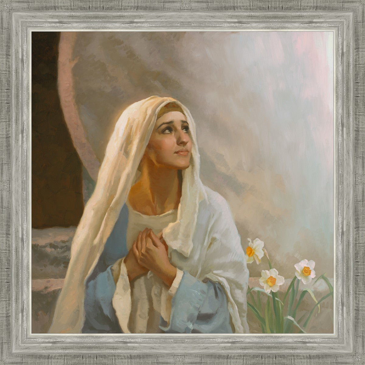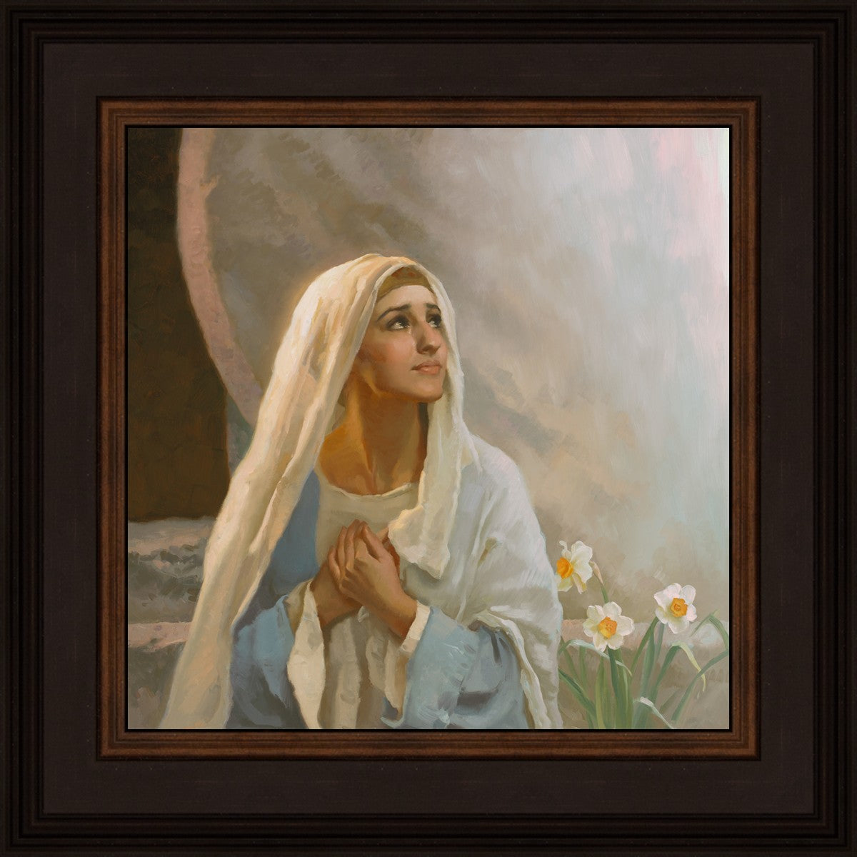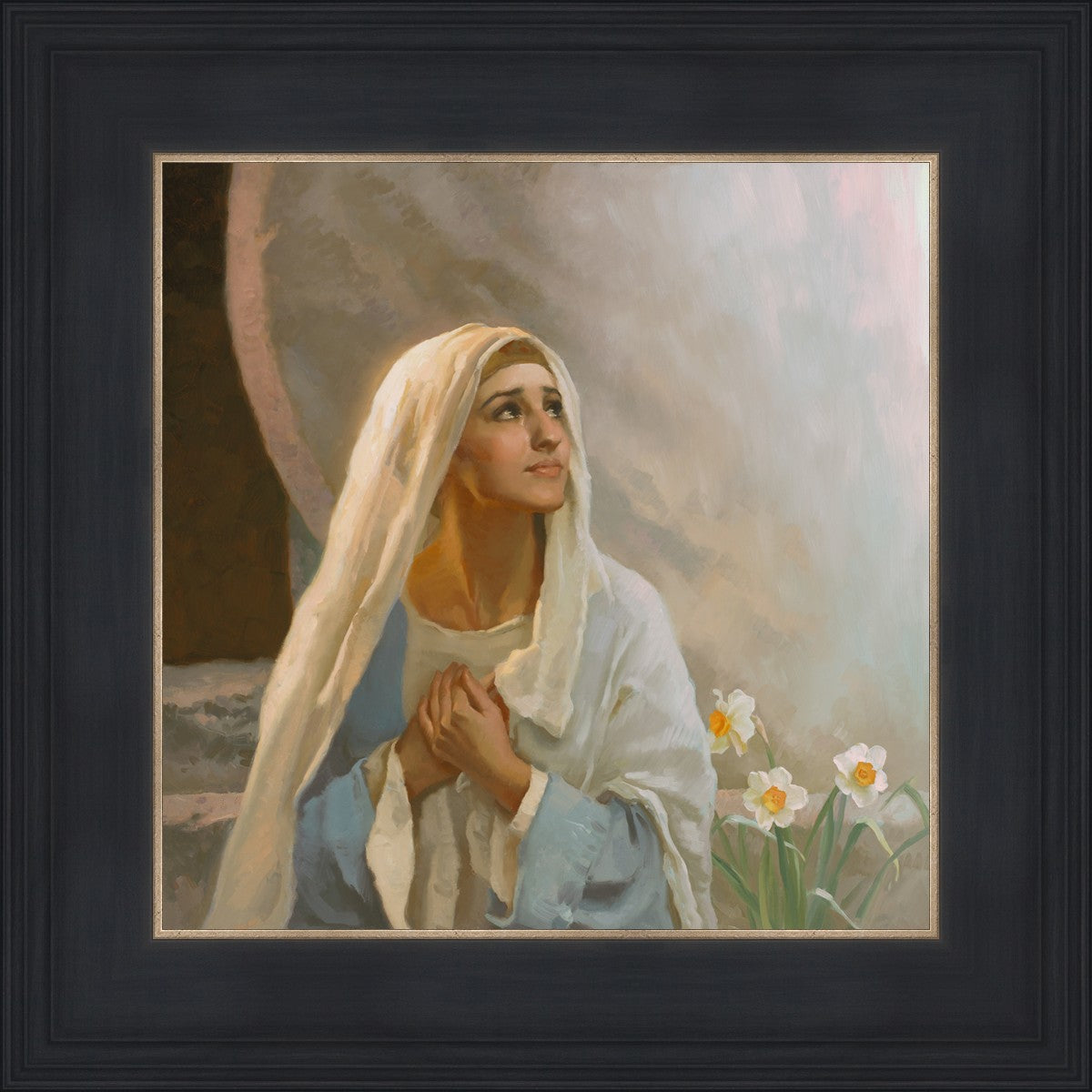 Mary's expression, one of awe and reverence, reflects the dawning of understanding as she looks upon the resurrected Lord. The tender blooms nearby, fresh against the stone, echo the miracle of life and resurrection. It is my hope that those who gaze upon this work feel the joyous serenity of a pivotal moment in faith, a scene of quiet wonder, and the everlasting promise of victory through Christ.