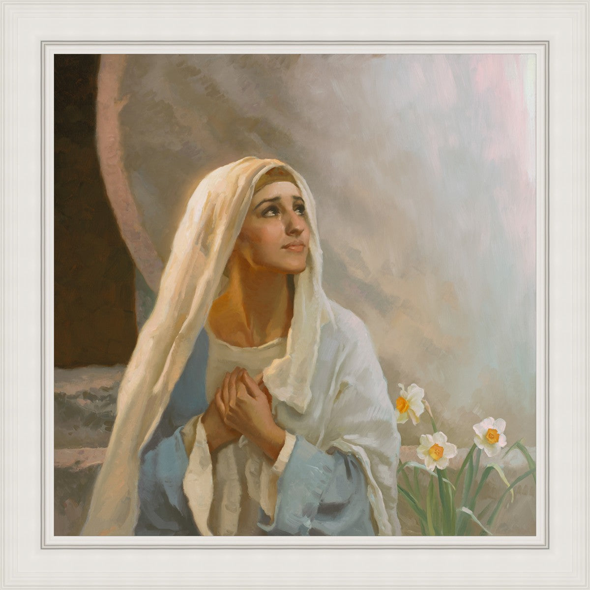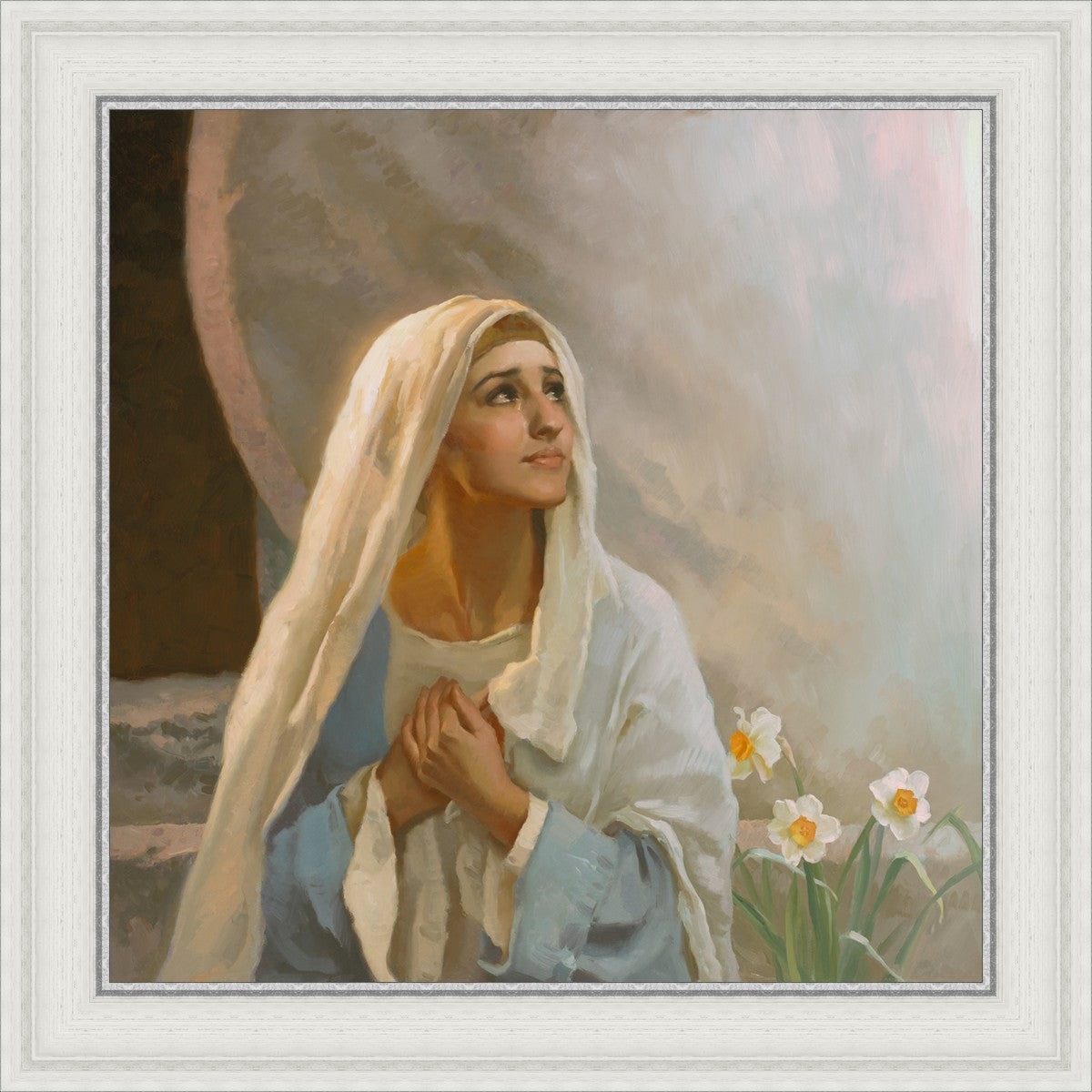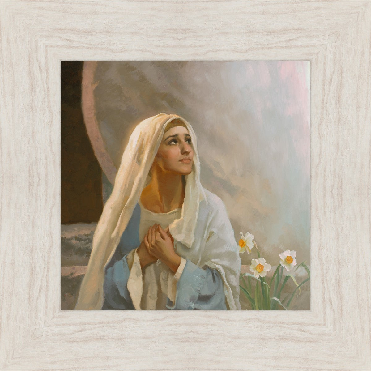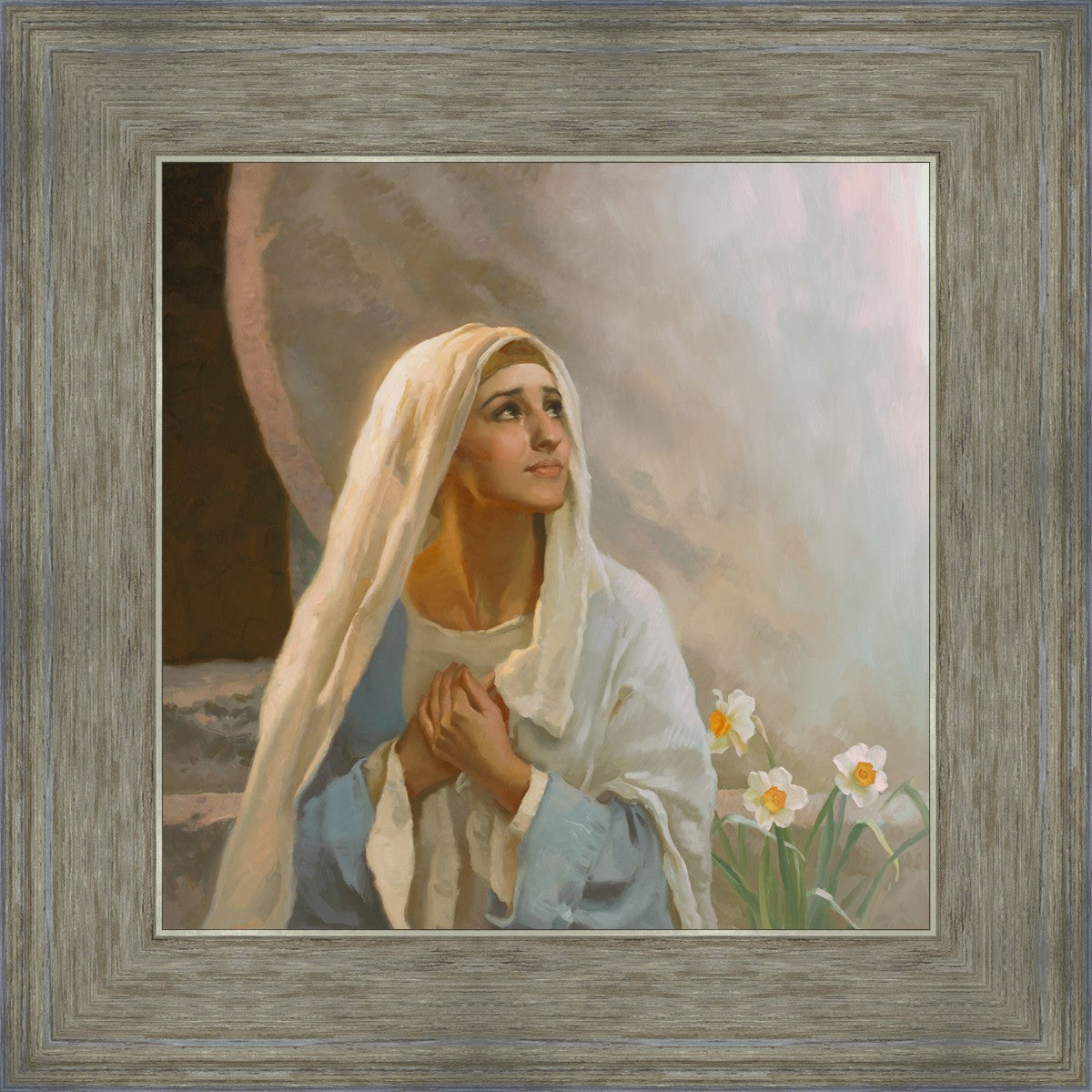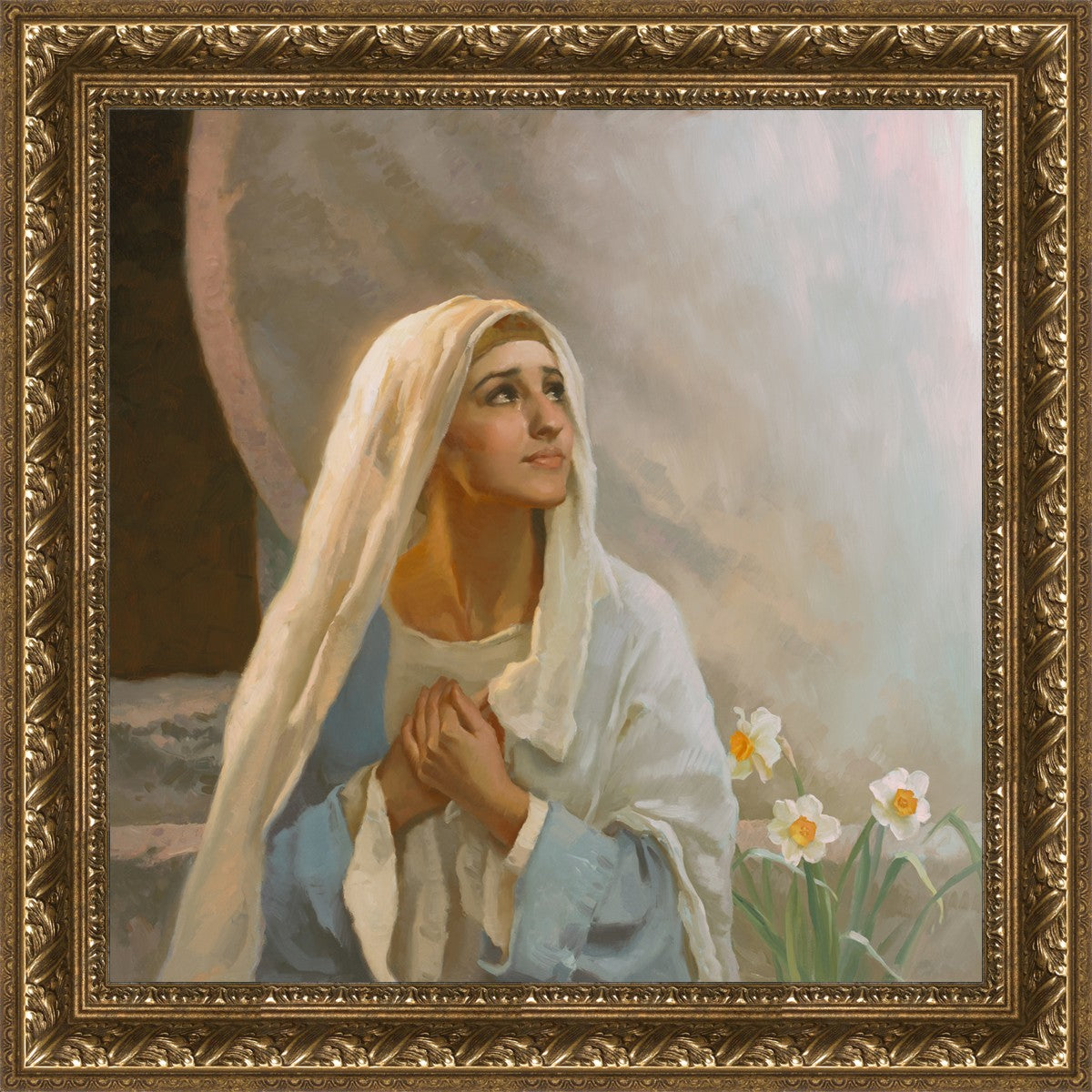 Mary's expression, one of awe and reverence, reflects the dawning of understanding as she looks upon the resurrected Lord. The tender blooms nearby, fresh against the stone, echo the miracle of life and resurrection. It is my hope that those who gaze upon this work feel the joyous serenity of a pivotal moment in faith, a scene of quiet wonder, and the everlasting promise of victory through Christ.